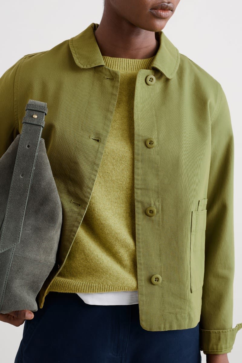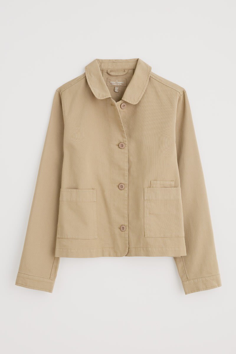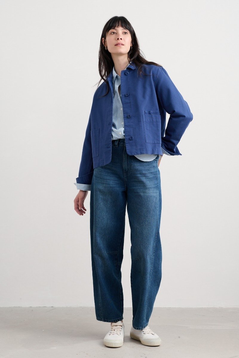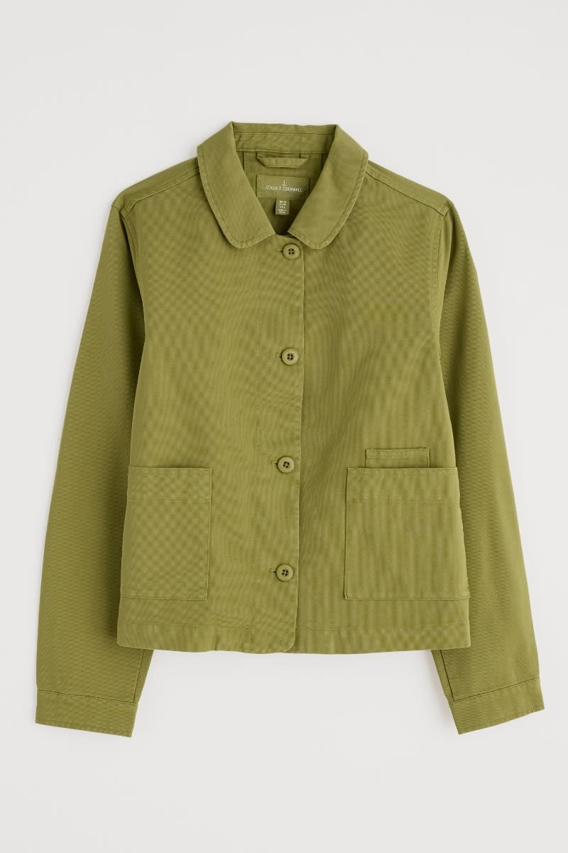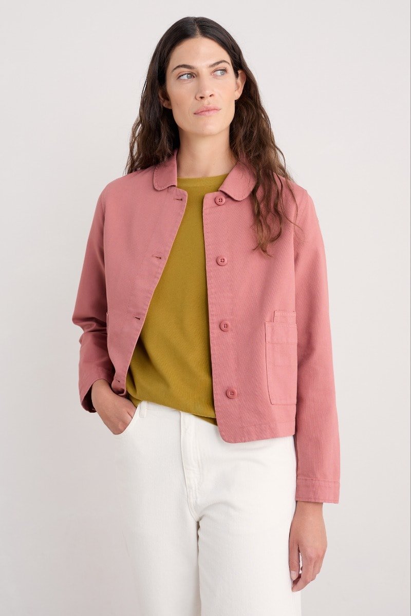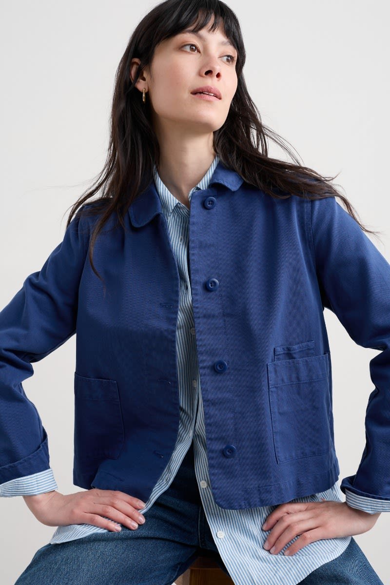 A jacket made from a cotton and linen blend with a subtly textured herringbone finish, garment dyed for a lovely soft, lived-in look. This workwear style is inspired by the studio wear of artists, with simple and easy styling, button cuffs, a rounded collar and square patch pockets, with an extra paint-brush compartment. A brilliant alternative to a denim jacket.