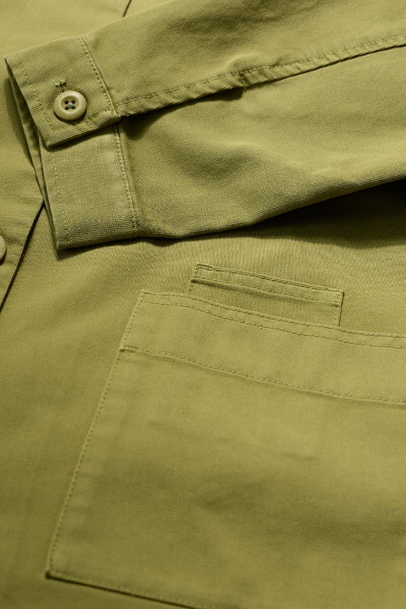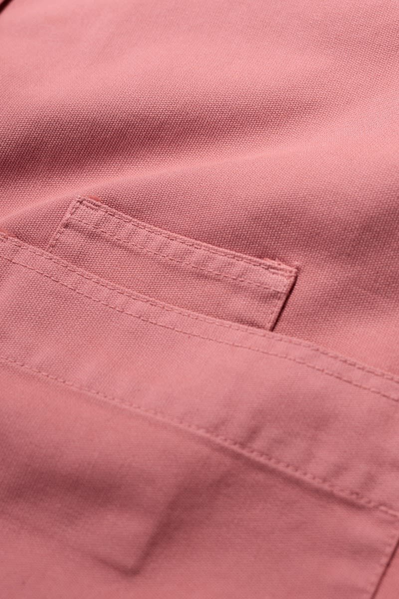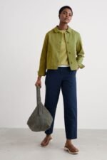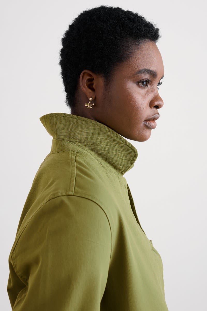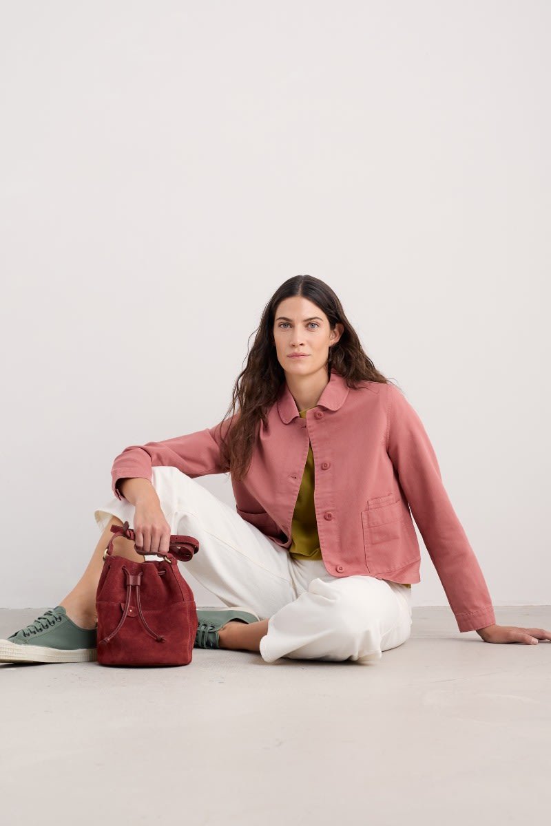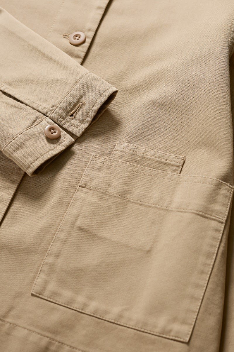 A jacket made from a cotton and linen blend with a subtly textured herringbone finish, garment dyed for a lovely soft, lived-in look. This workwear style is inspired by the studio wear of artists, with simple and easy styling, button cuffs, a rounded collar and square patch pockets, with an extra paint-brush compartment. A brilliant alternative to a denim jacket.