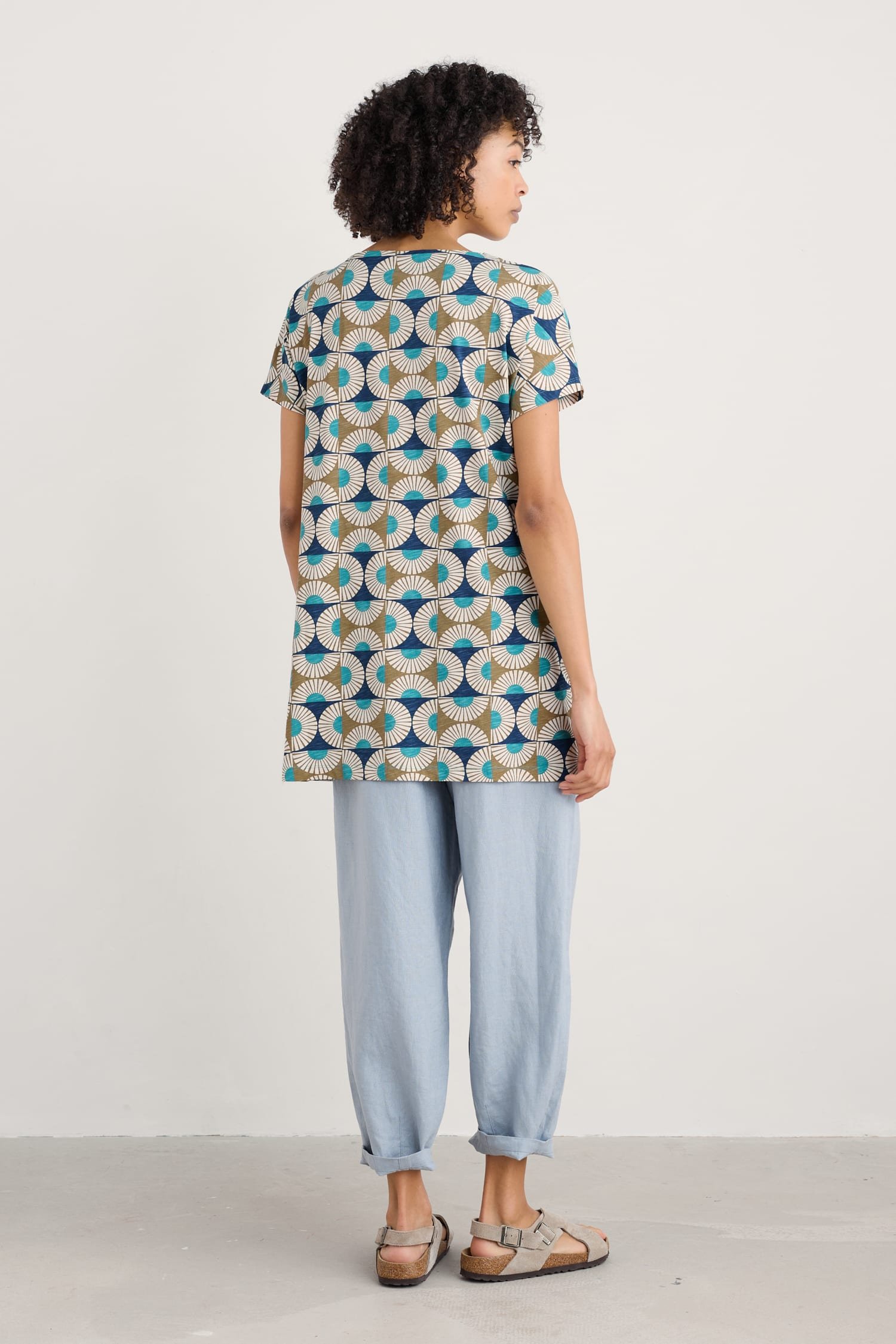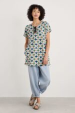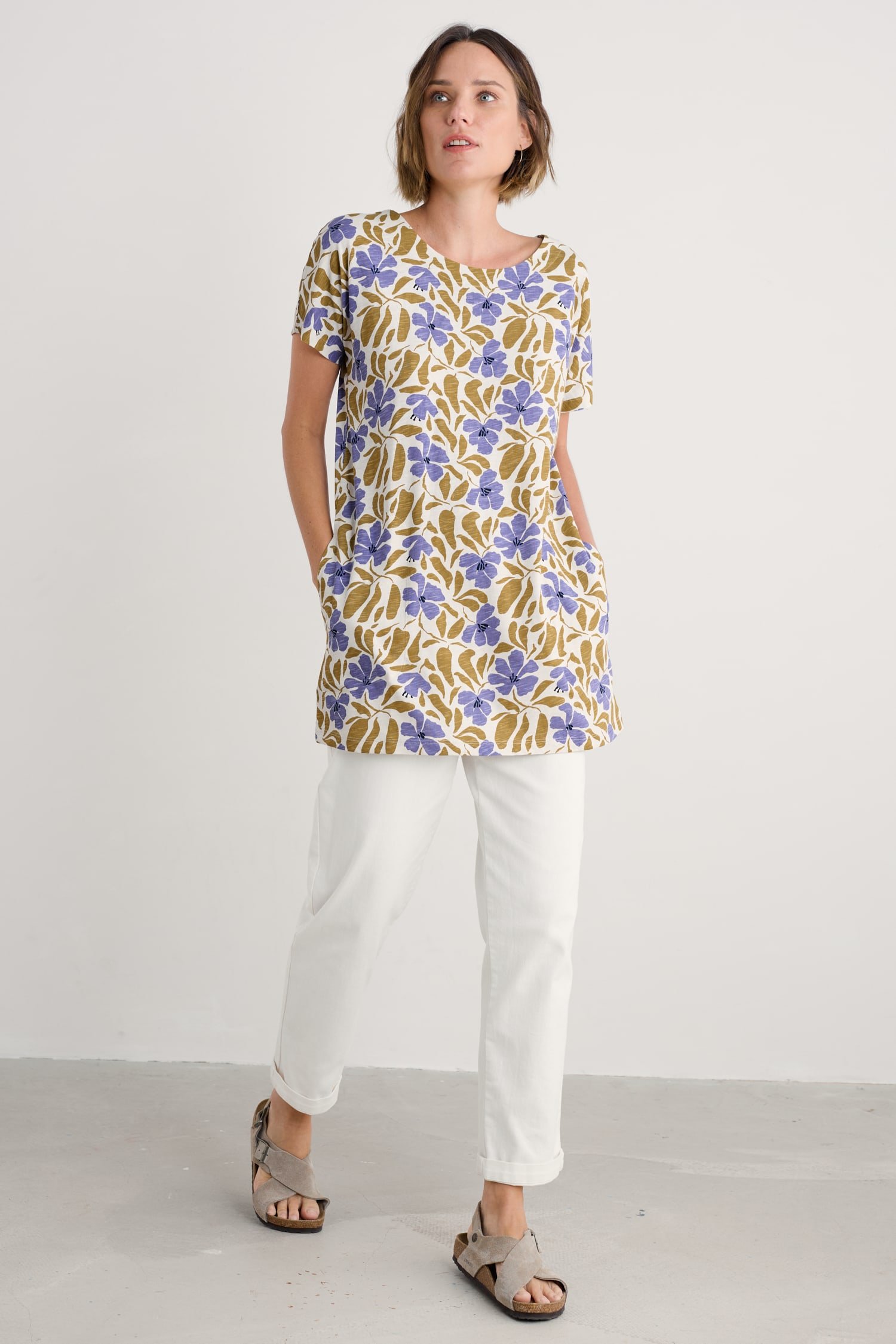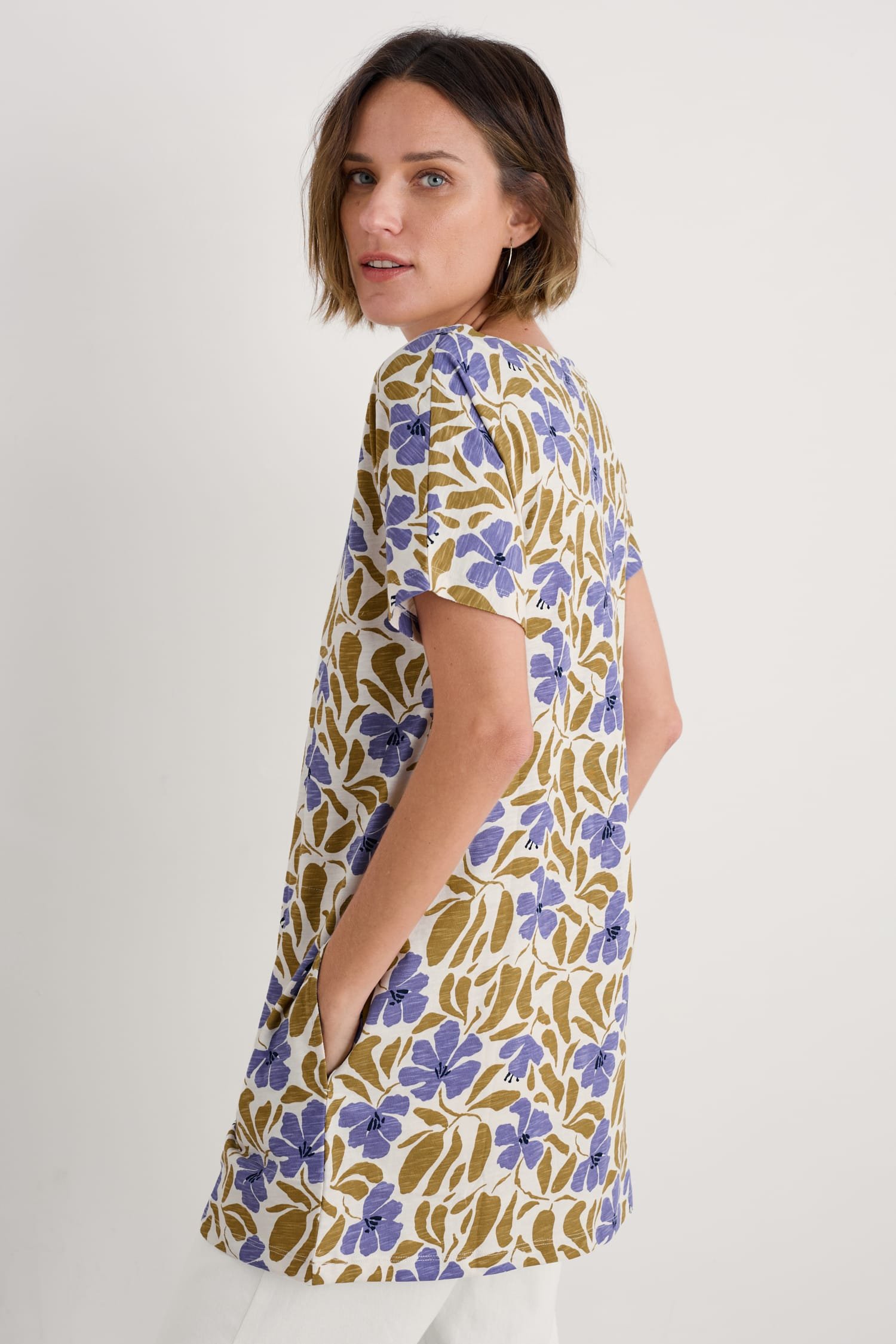 Organic cotton jersey tunic with handy pockets. Choose from a delicate, deco-style floral print or nautical plain. We’ll wear ours over soft jersey leggings for weekday comfort, and under a light raincoat for weekend strolls and picnic lunches by the sea.
