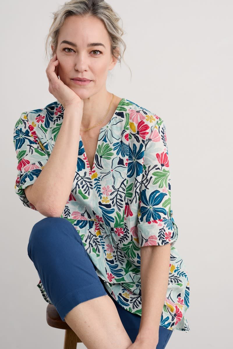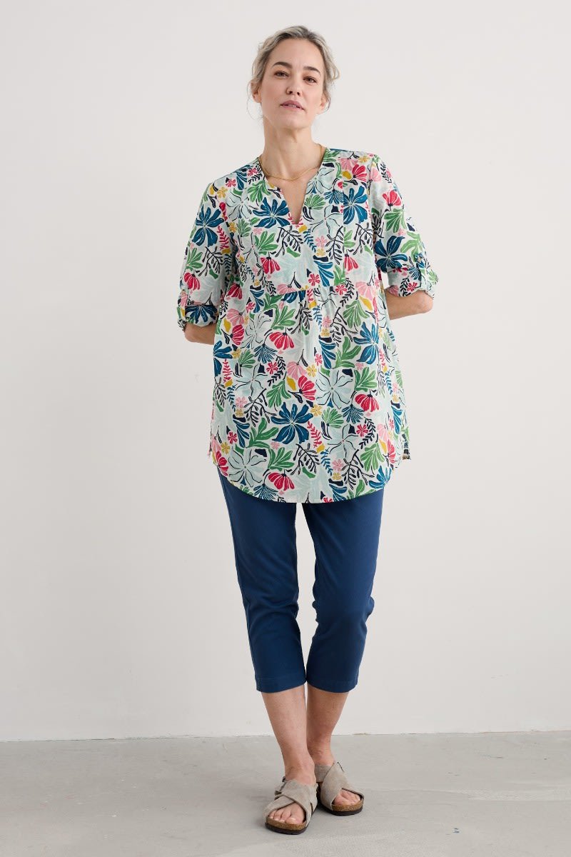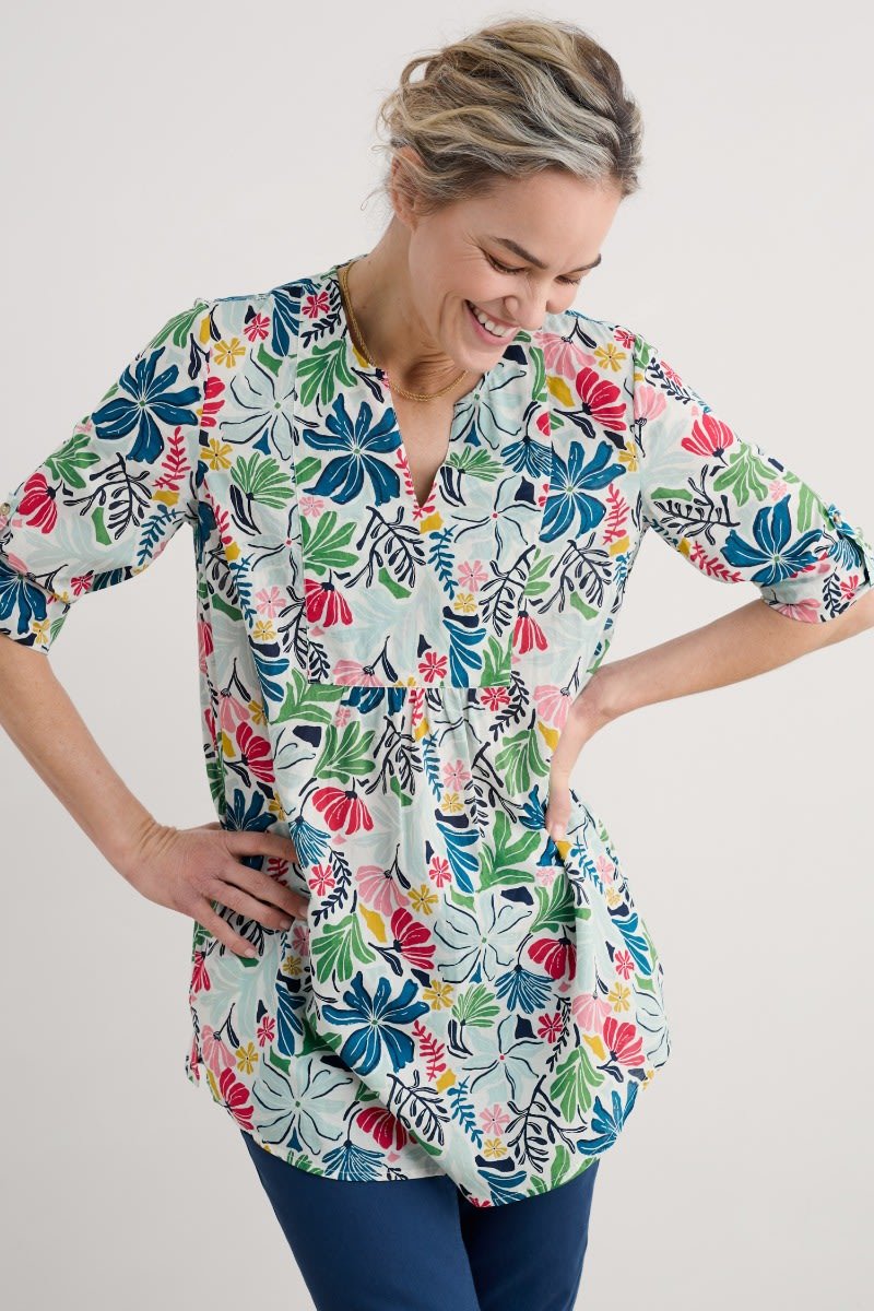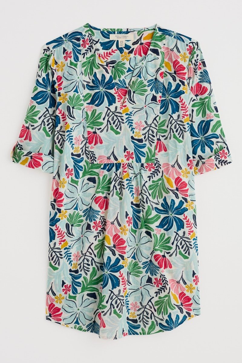 Woven from soft organic cotton, this tunic top has an easy shape and a bib detail with pretty gathers under its notch neckline. The simple A-line shape is finished with details that are inspired by the practical workwear of Cornish artists: button fastenings for the roll-up sleeves and in-seam pockets.