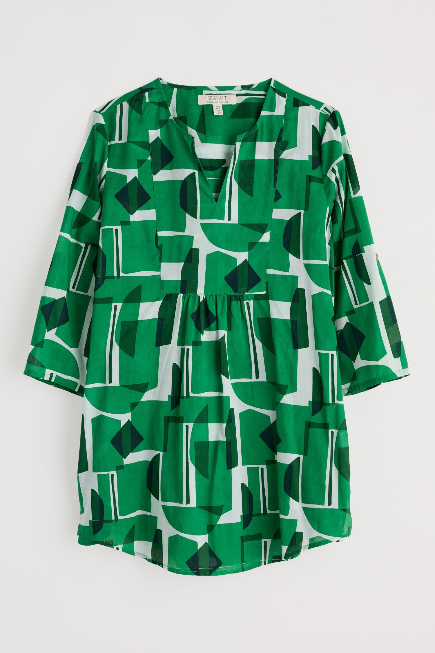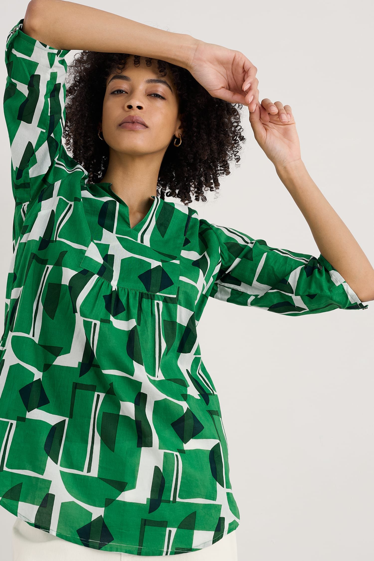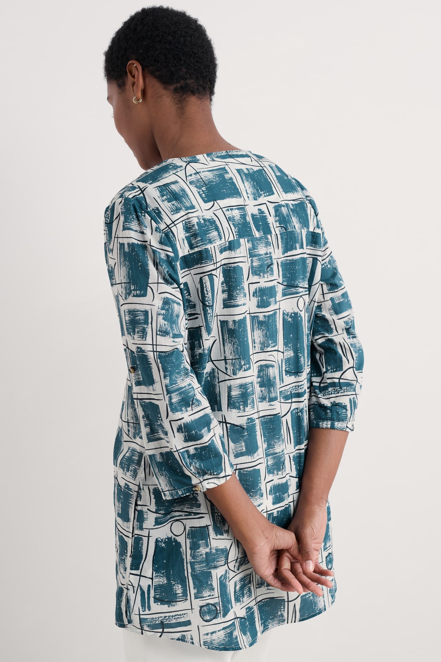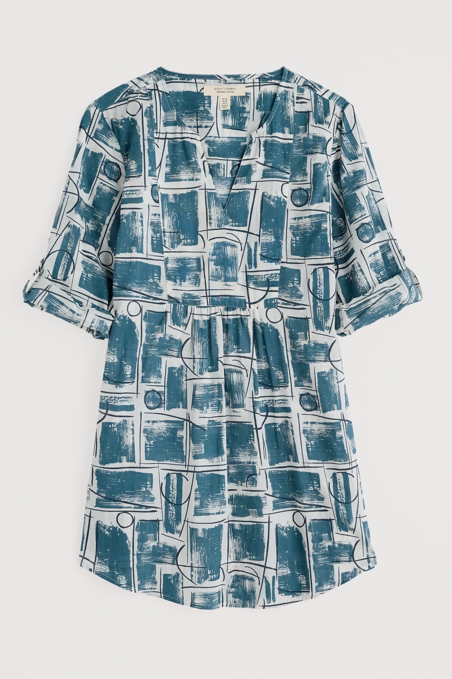 Woven from soft organic cotton, this tunic top has an easy shape and a bib detail with pretty gathers under its notch neckline. The simple A-line shape is finished with details that are inspired by the practical workwear of Cornish artists: button fastenings for the roll-up sleeves and in-seam pockets.