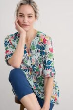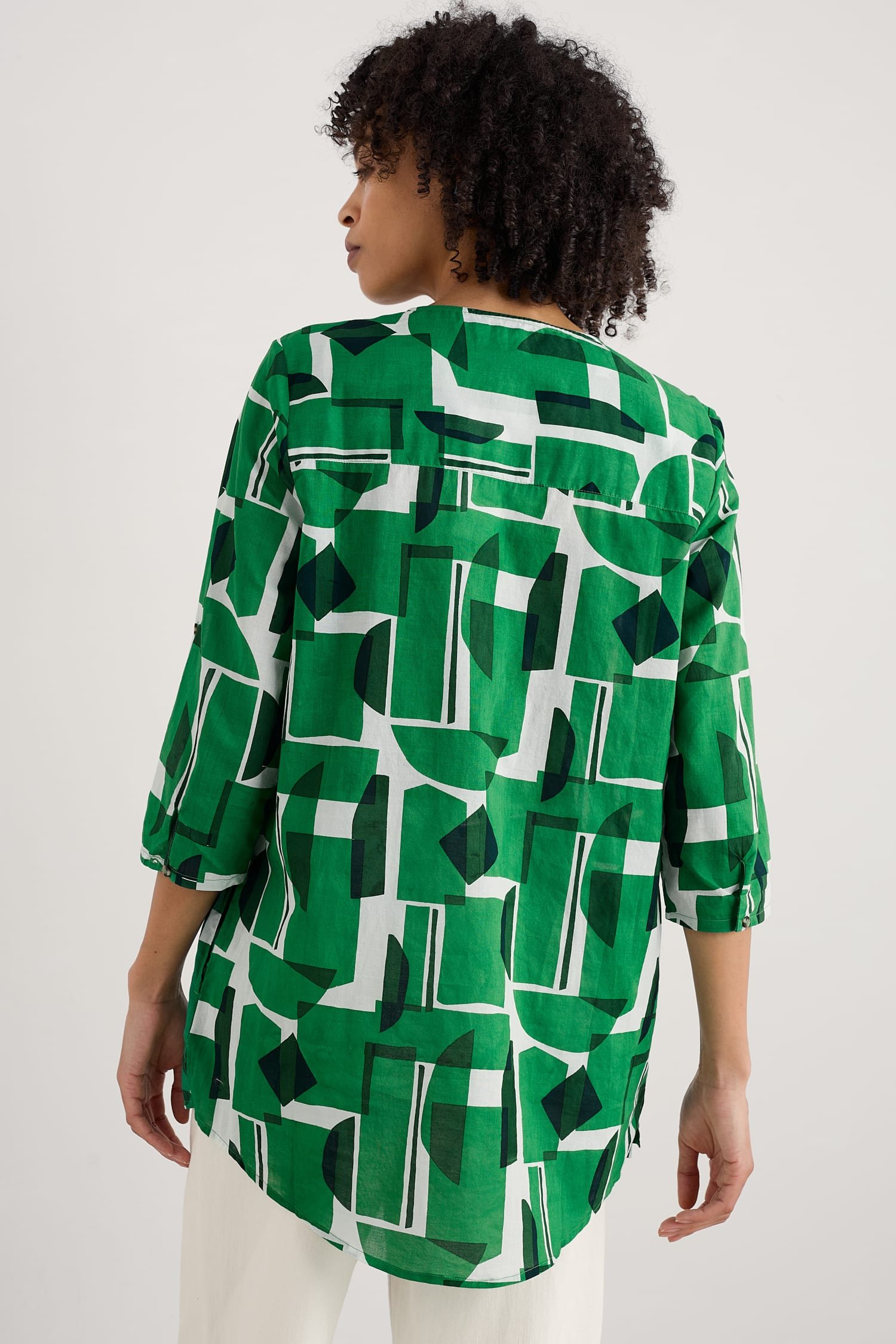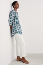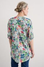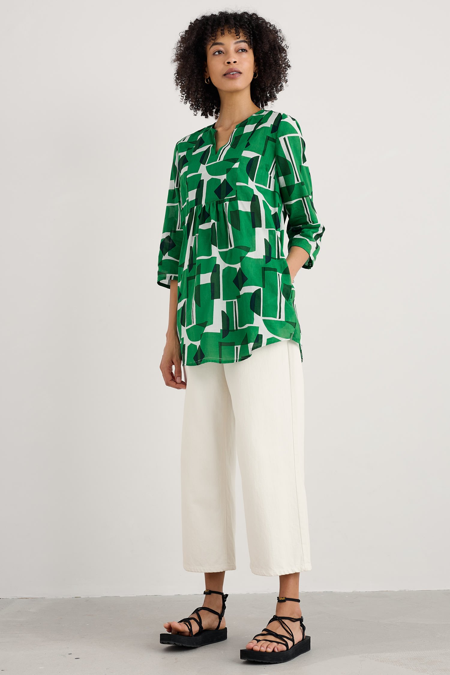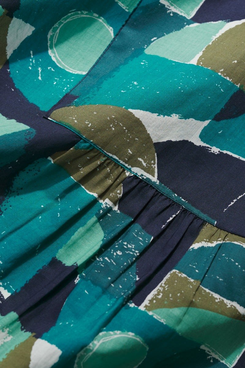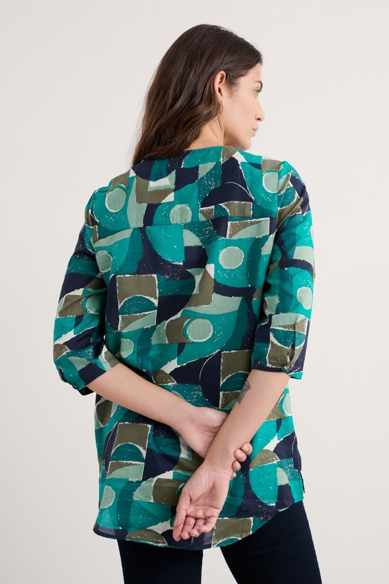 Woven from soft organic cotton, this tunic top has an easy shape and a bib detail with pretty gathers under its notch neckline. The simple A-line shape is finished with details that are inspired by the practical workwear of Cornish artists: button fastenings for the roll-up sleeves and in-seam pockets.