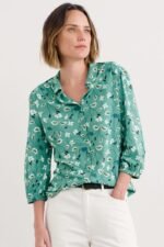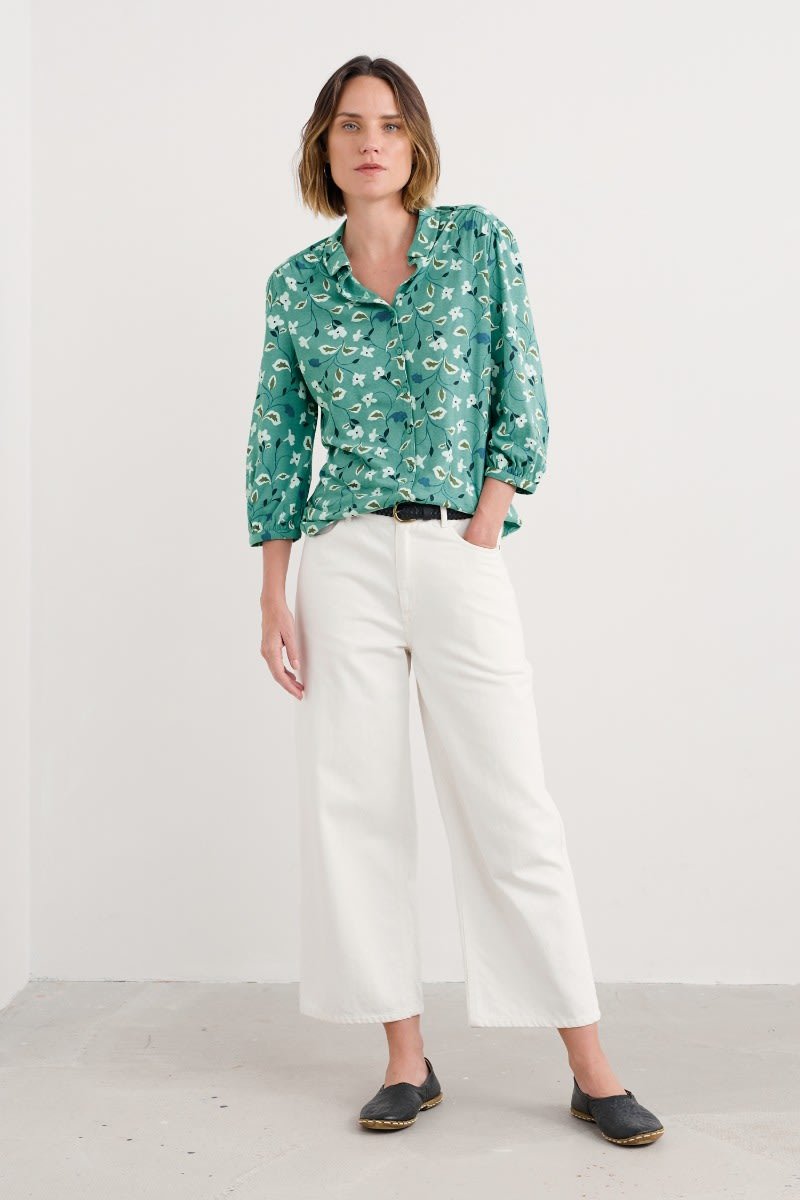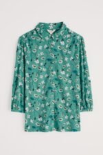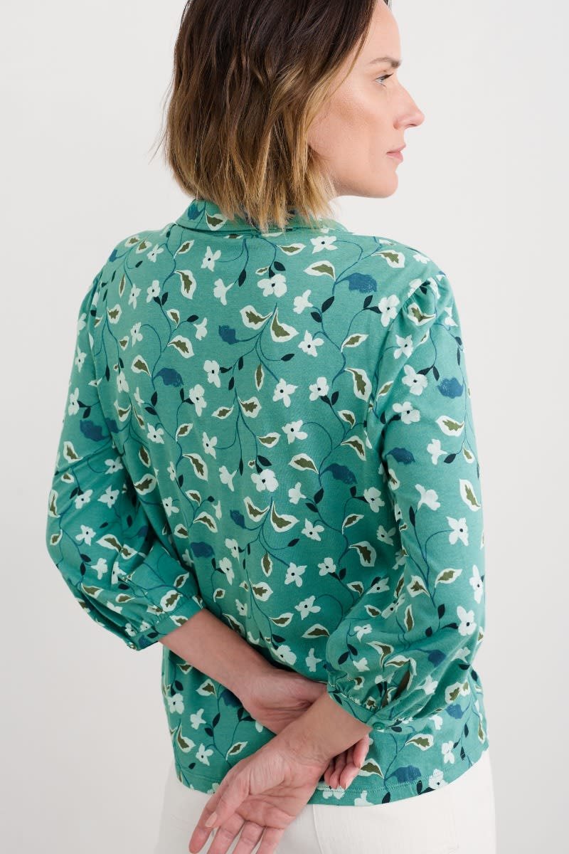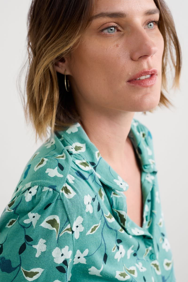 A soft, printed button-through shirt with a semi-fitted shape, made from a skimming organic cotton and Modal blend jersey. Gathers at the cuffs and shoulder seams give a subtle volume to its blouson sleeves.