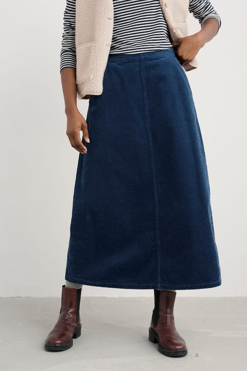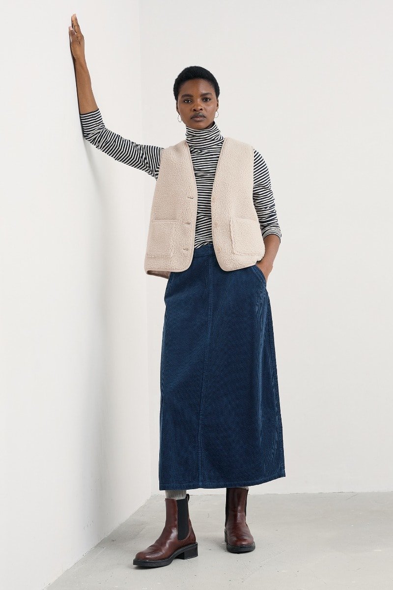 A timeless skirt made from a supple, organic cotton seersucker cord, with fine wales and an easy structure. The simple A-line shape sits on the natural waist, creating a vintage-inspired silhouette. We’ll pair ours with everything from simple knits to patterned shirts, and love styling it with long leather boots in cooler months.
