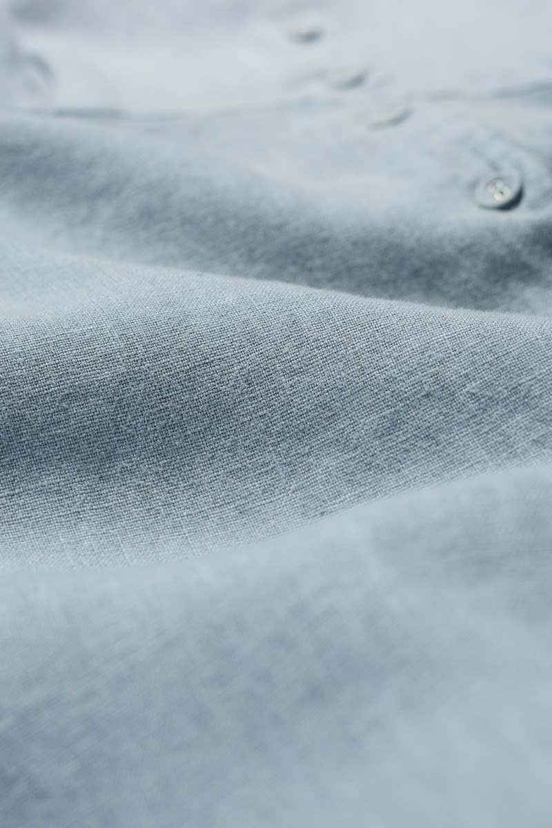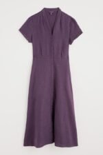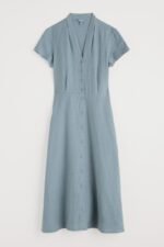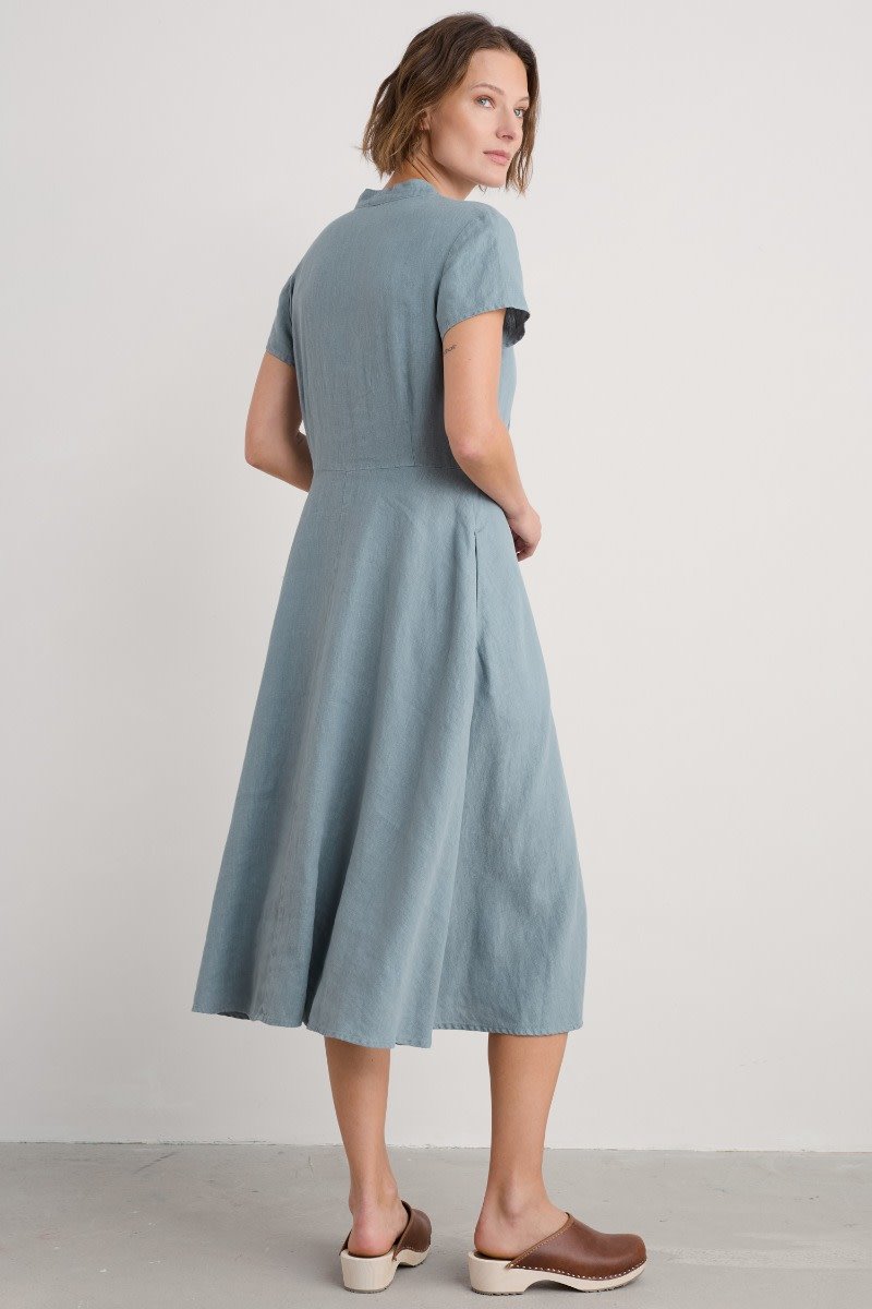 Inspired by ‘40s style shirtwaisters, this midi length dress is cleverly tailored for a flattering fit with a full skirt for a feminine, vintage feel and a deep waistband with under-bust pleats. It’s finished with a V neck, short sleeves and fabric-covered buttons. The cool, breathable linen styles are garment-dyed for incredible softness and a sun-faded hue.
