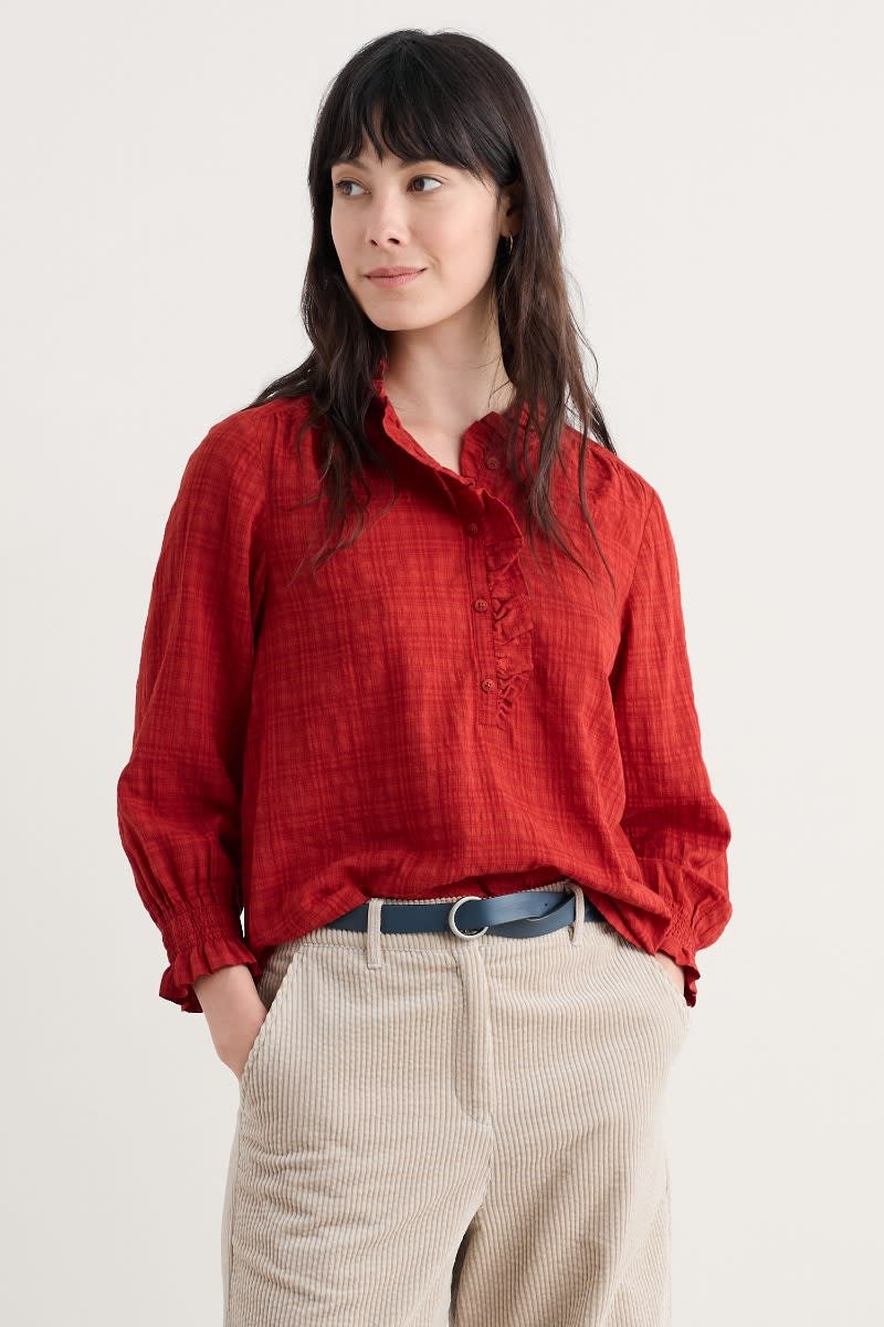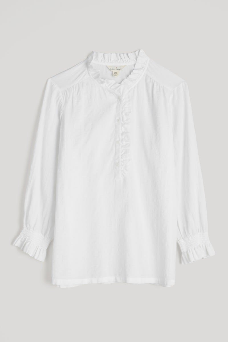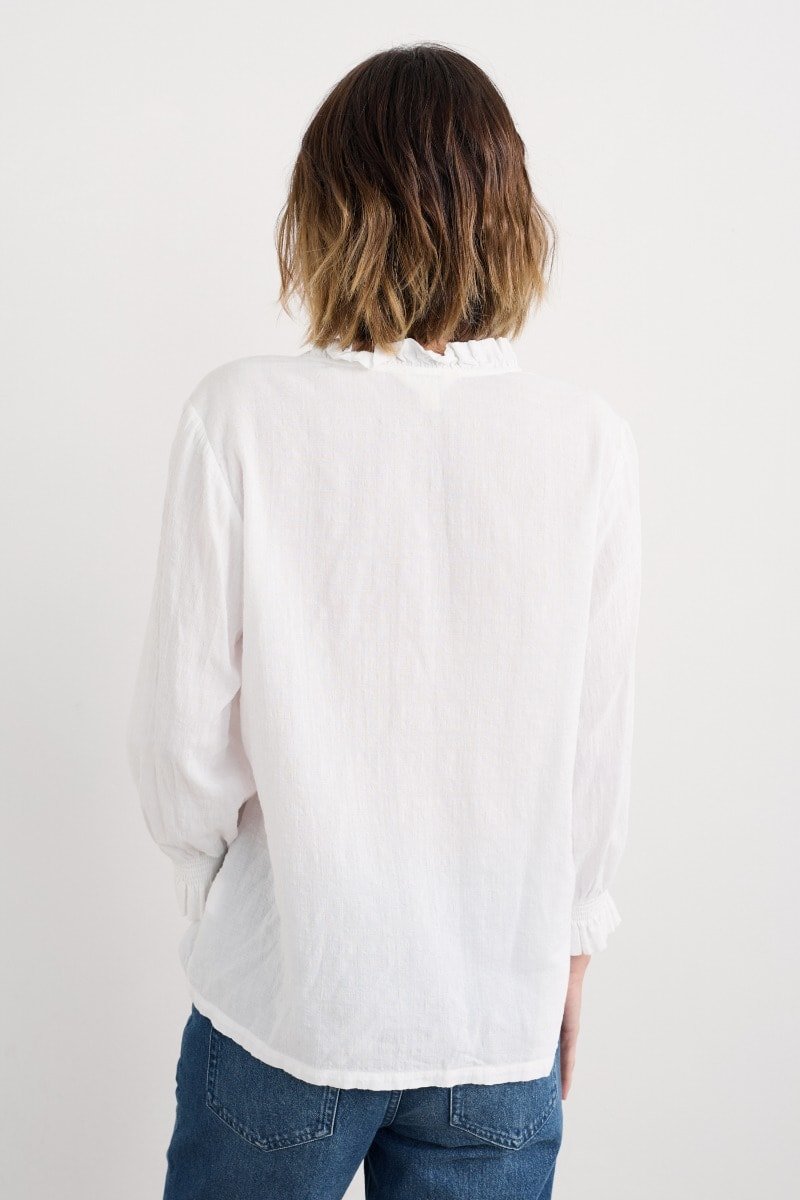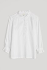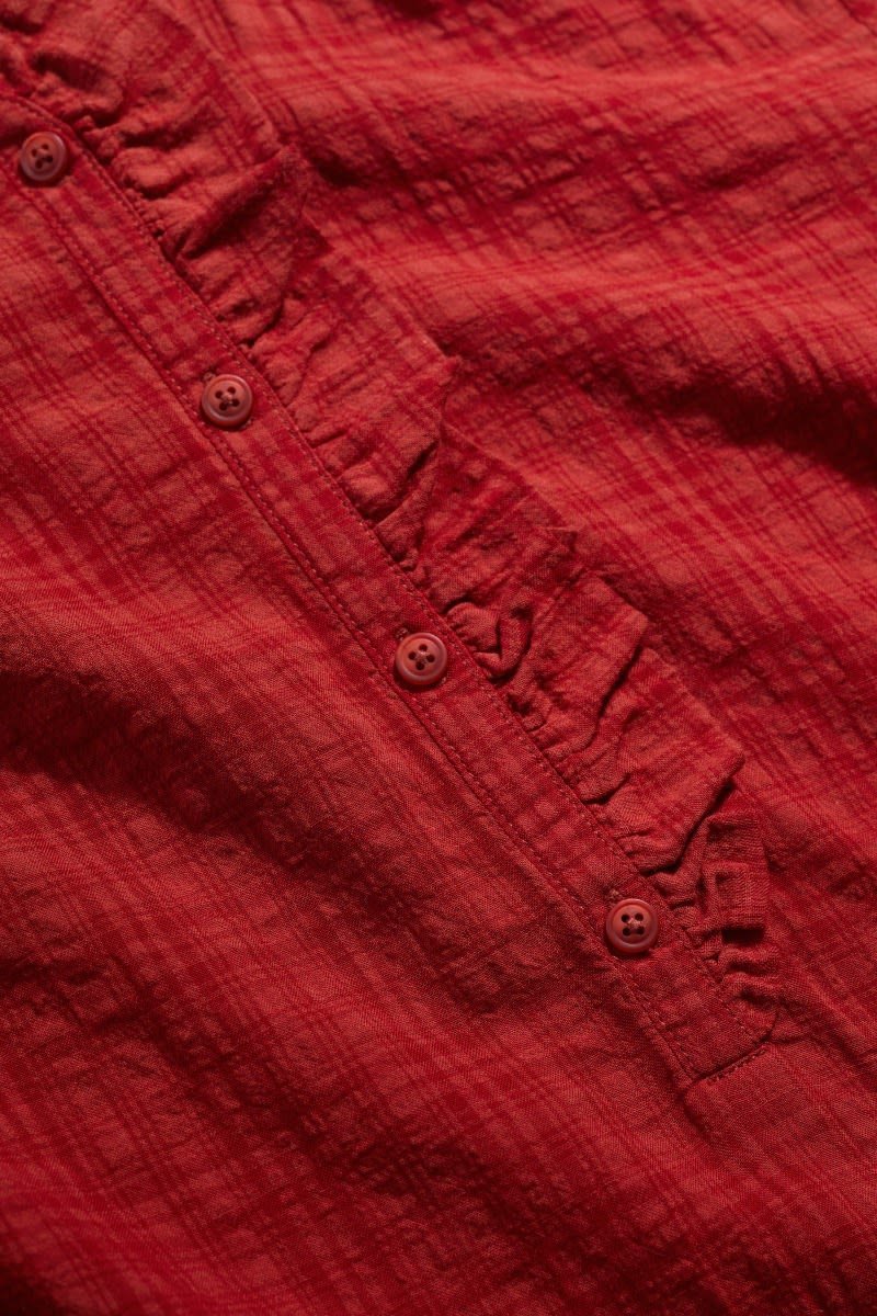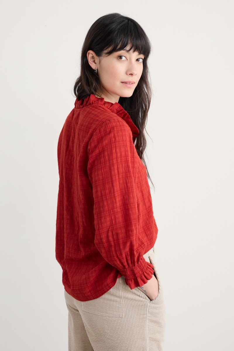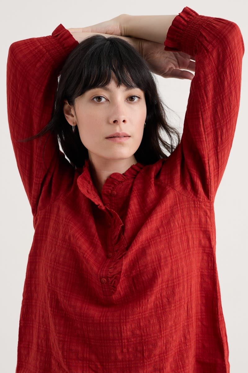 A versatile top made from a lightly textured blend of organic cotton and LENZING™ ECOVERO™, with a tonal check. Elasticated cuffs have a playful frill, echoing the frill around the button-down half placket. The easy fit is perfect for tucking in, wearing loose or under pinafores, and is created with delicate gathers from the yoke. LENZING™ ECOVERO™ is derived from wood pulp sourced from sustainably managed forests.