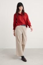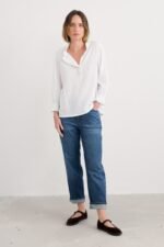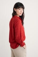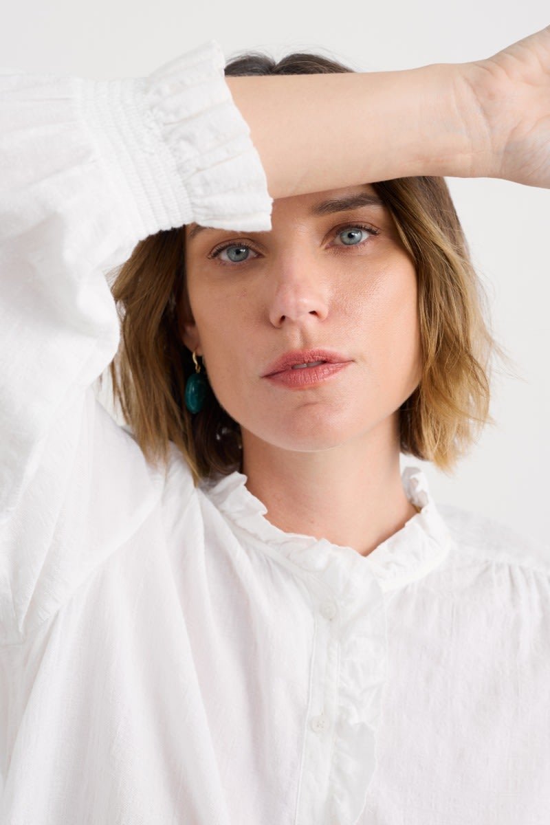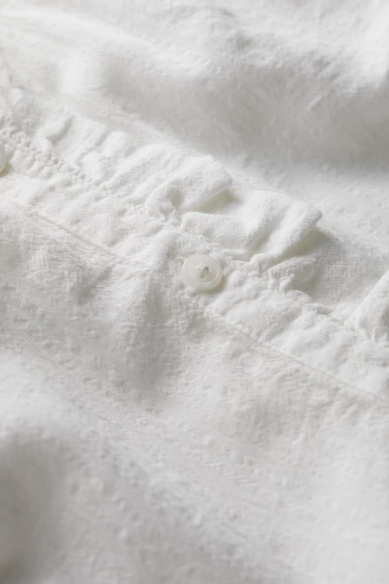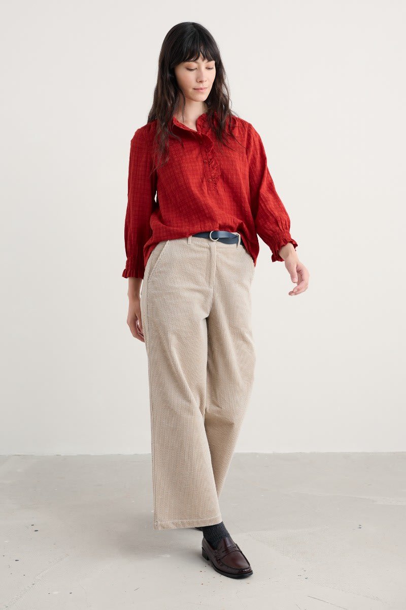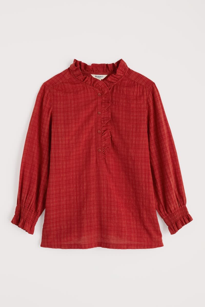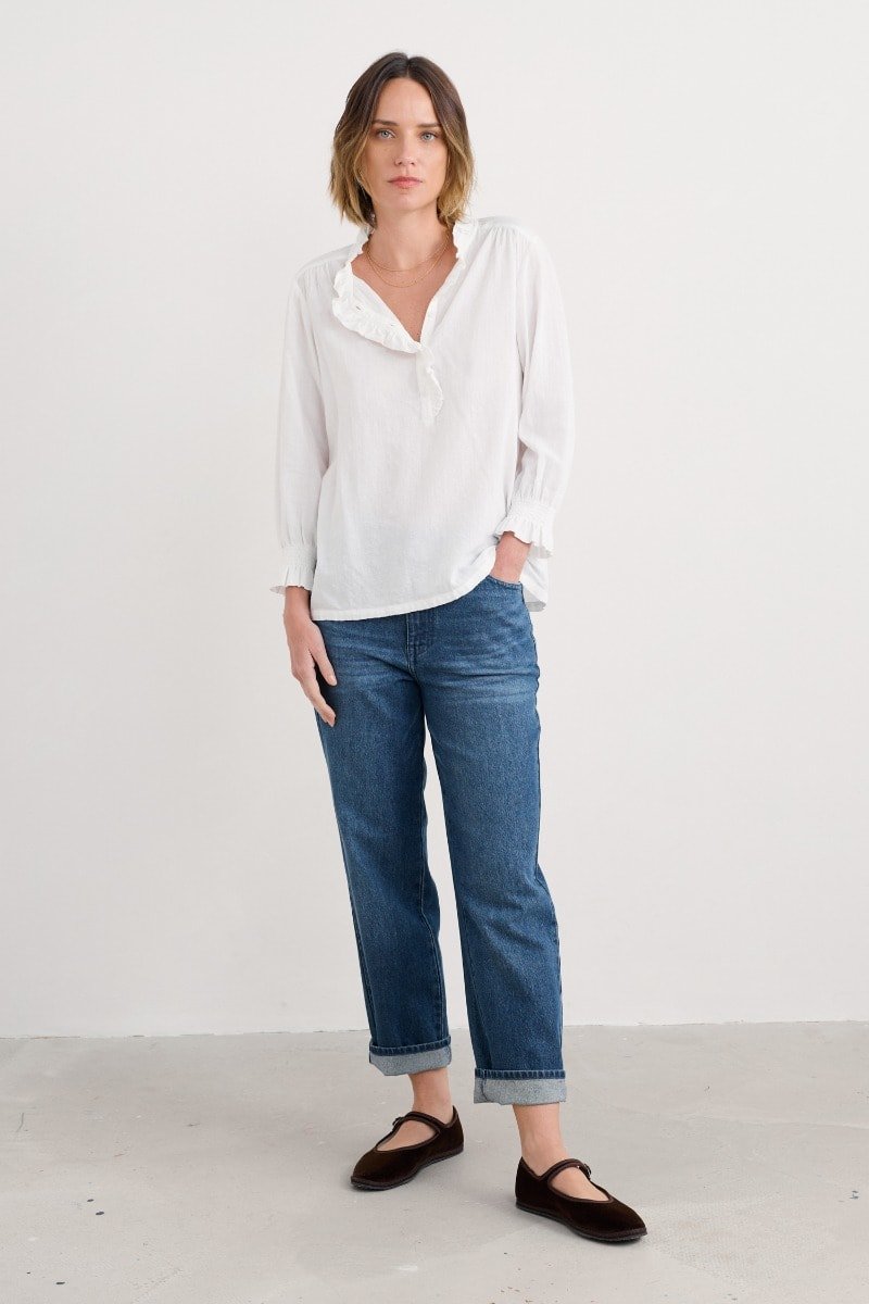 A versatile top made from a lightly textured blend of organic cotton and LENZING™ ECOVERO™, with a tonal check. Elasticated cuffs have a playful frill, echoing the frill around the button-down half placket. The easy fit is perfect for tucking in, wearing loose or under pinafores, and is created with delicate gathers from the yoke. LENZING™ ECOVERO™ is derived from wood pulp sourced from sustainably managed forests.