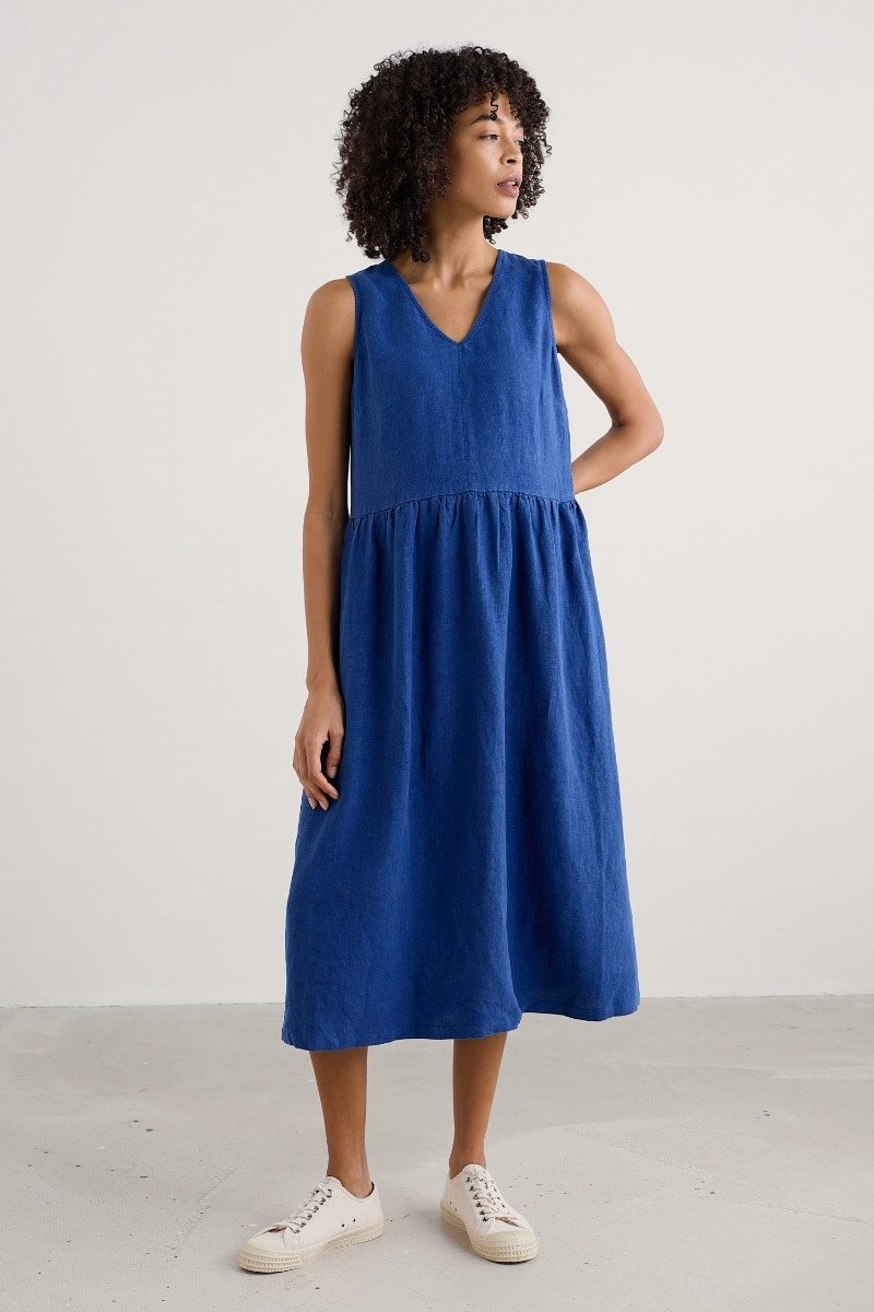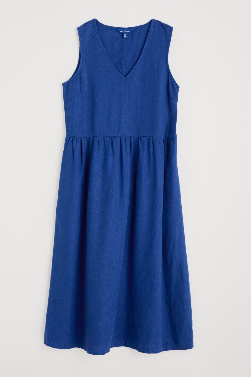 A V-neck dress you’ll find so many ways to layer and love. Darts on the bodice create a semi-fitted, but not clinging, shape, while evenly spaced gathers at the waist give a lovely, subtle volume. And we love a dress with pockets…