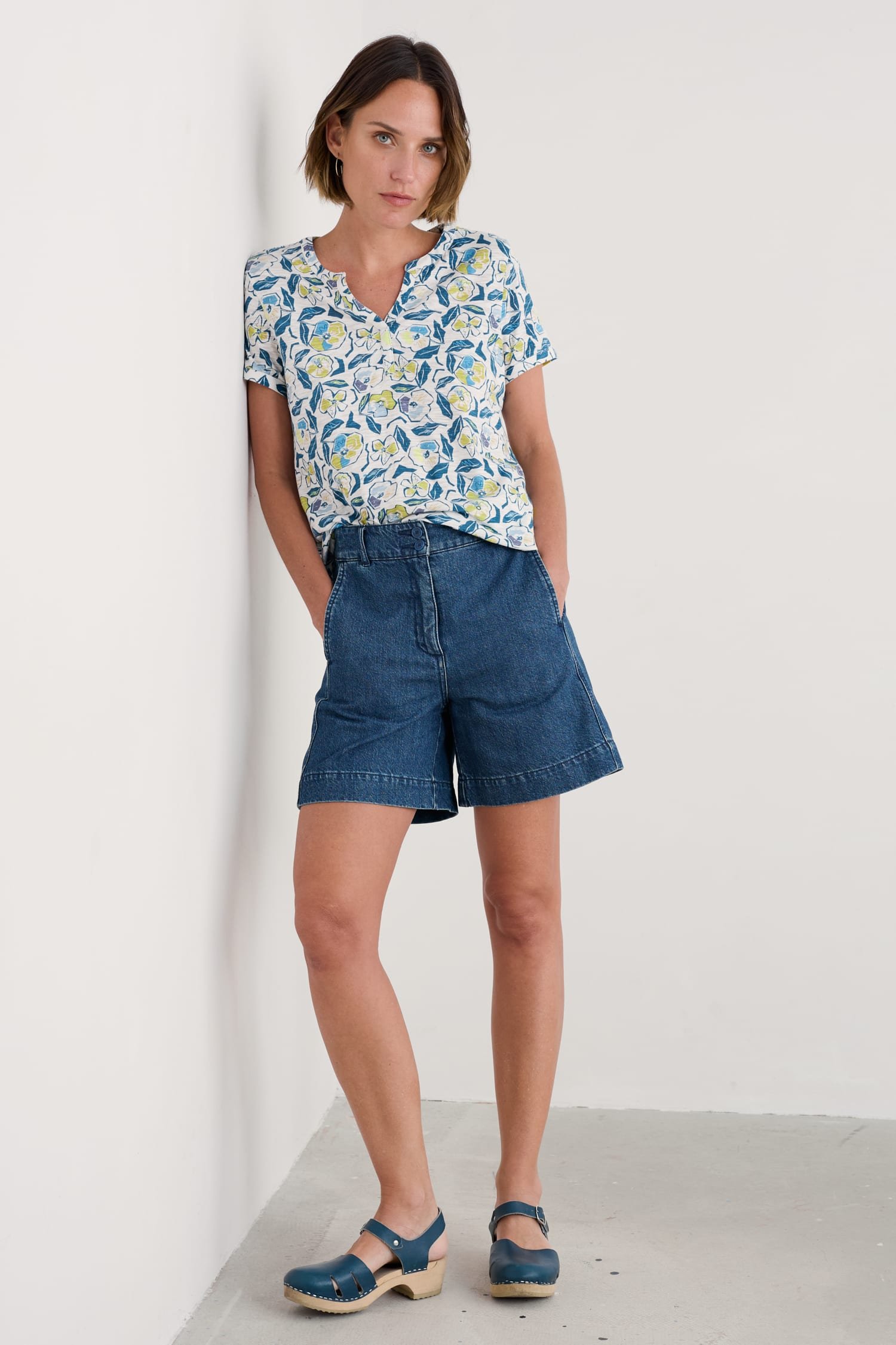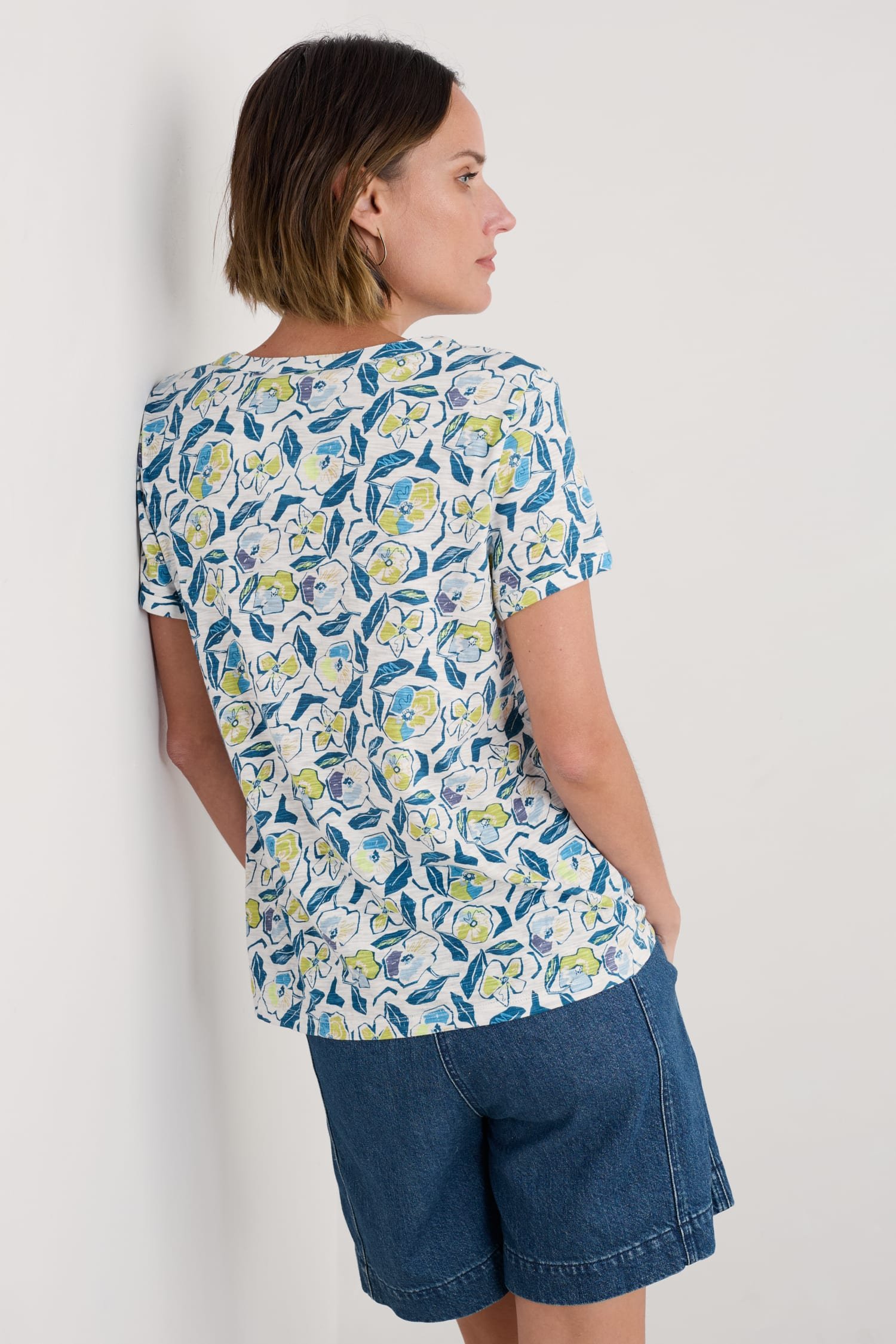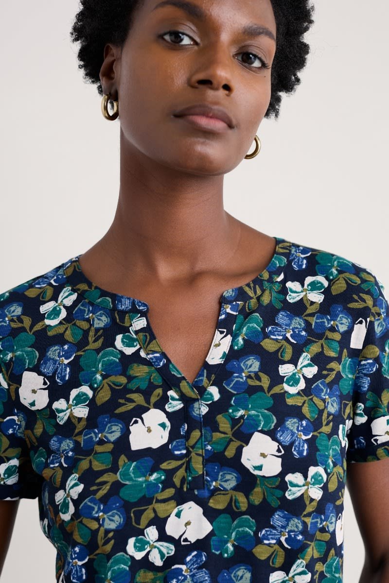 An effortless summer T-shirt with a notched neckline and subtle flared shape, made from soft and breathable organic cotton. Perfect for pairing with narrow crops and culottes.