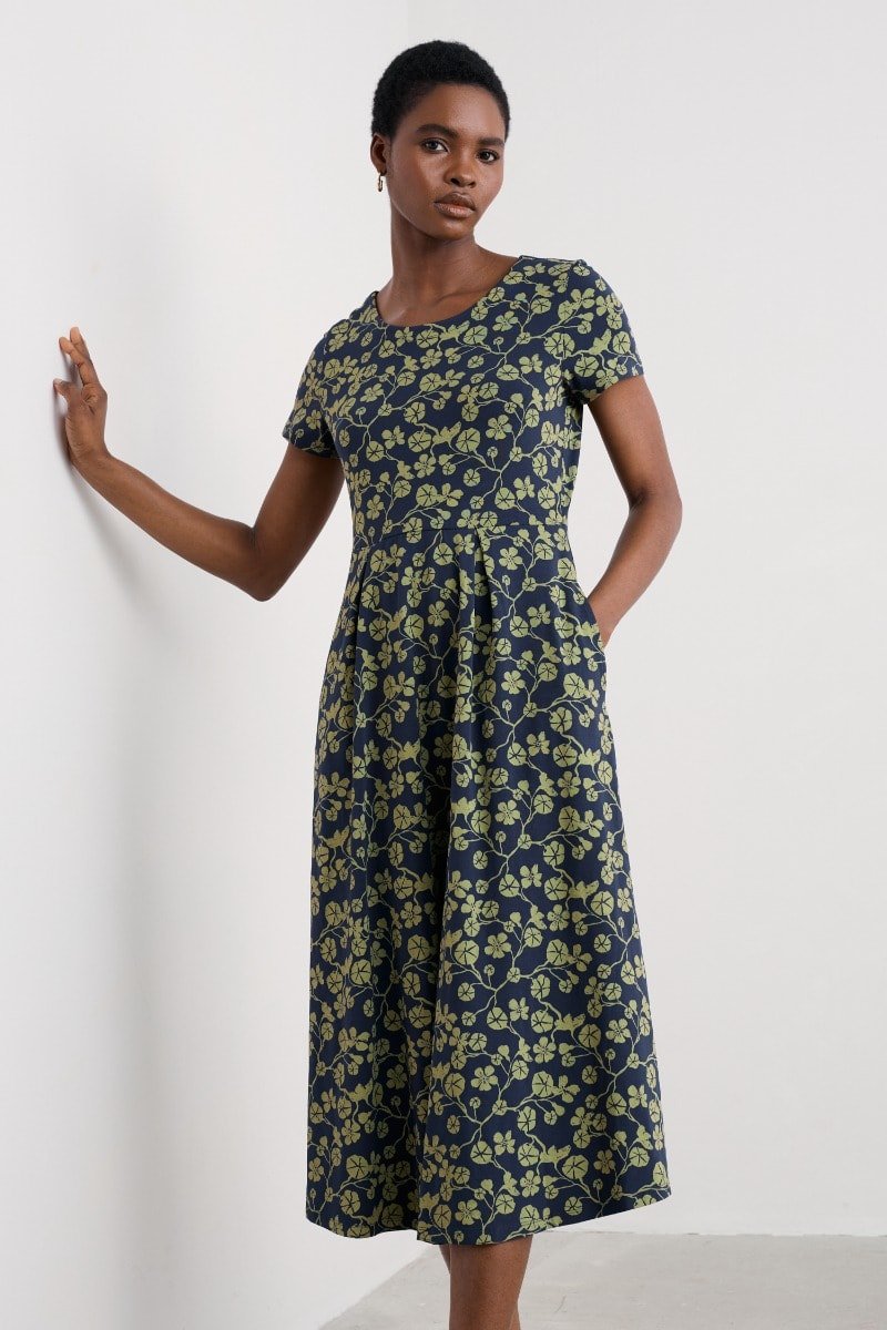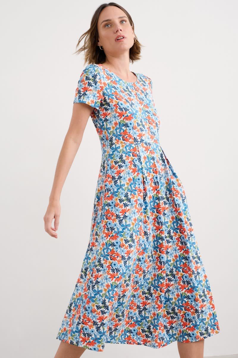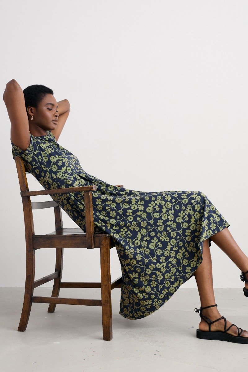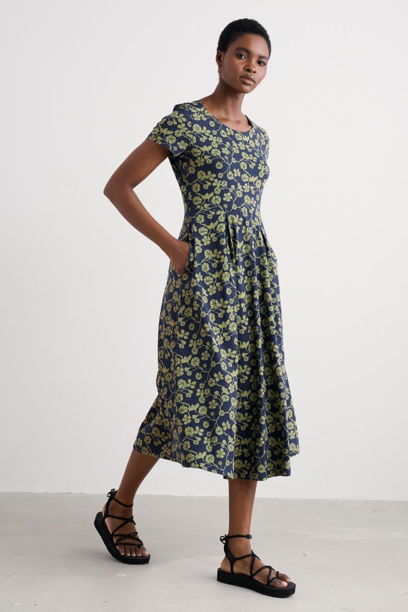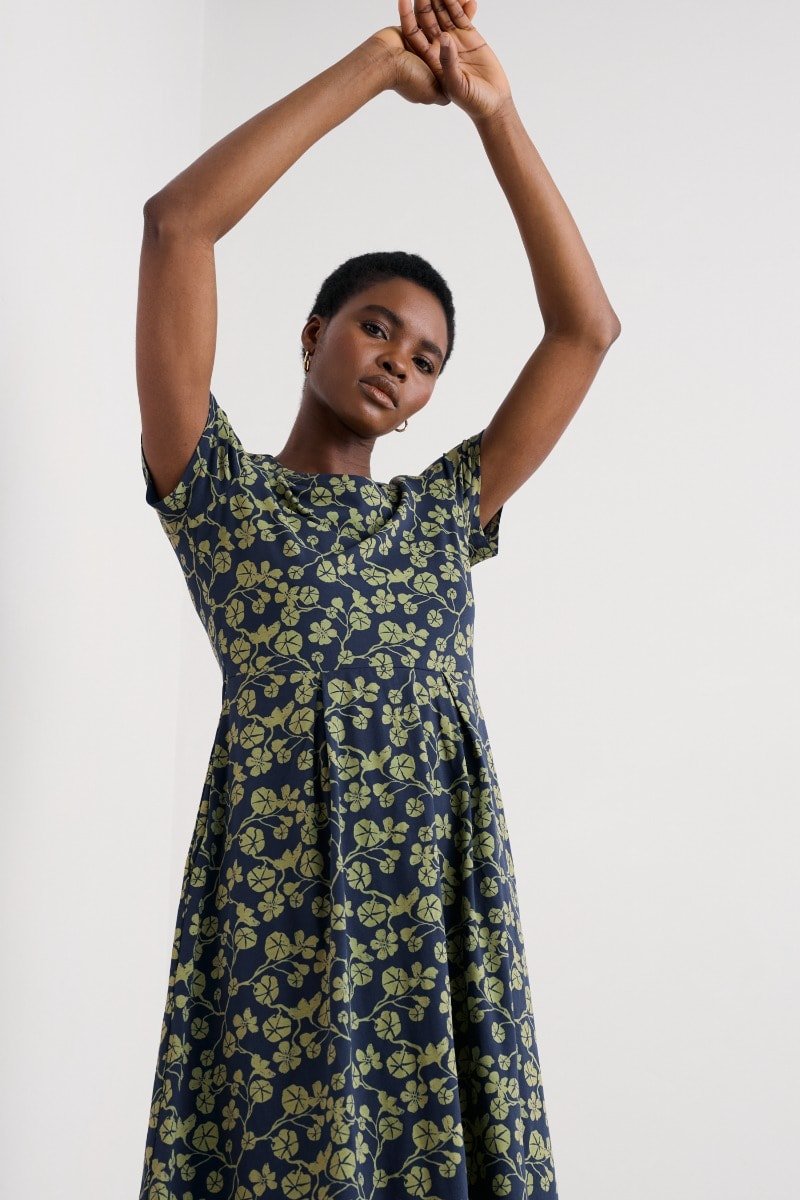A half-sleeve version of our favourite Veronica Dress, with the same versatile midi length and drapey pleated skirt. The easy shape and organic cotton blend jersey give a lovely movement to our handcrafted prints. We’ll be wearing it with simple trainers and sandals all summer long.