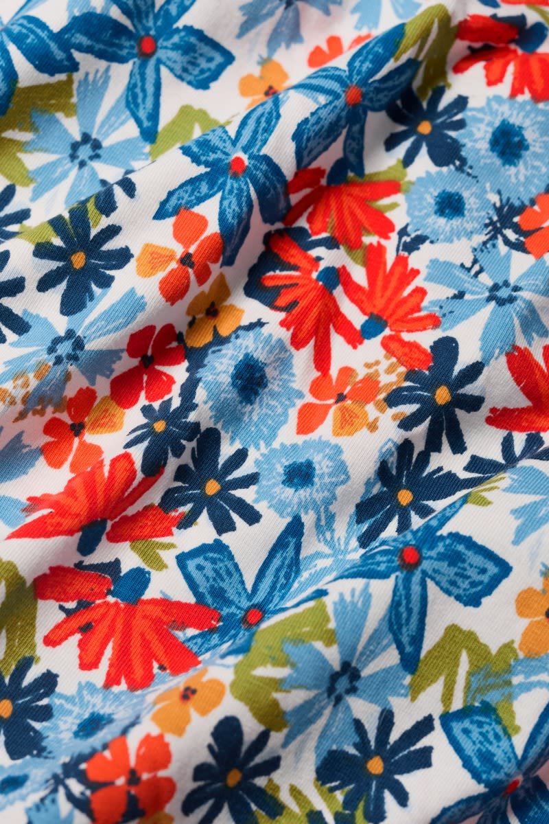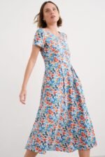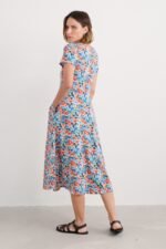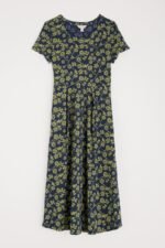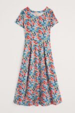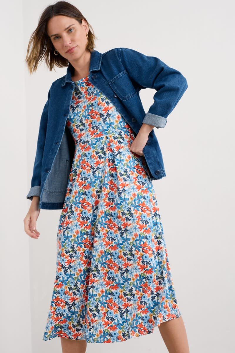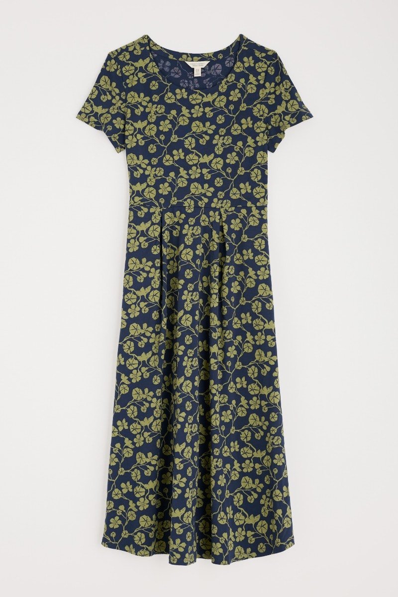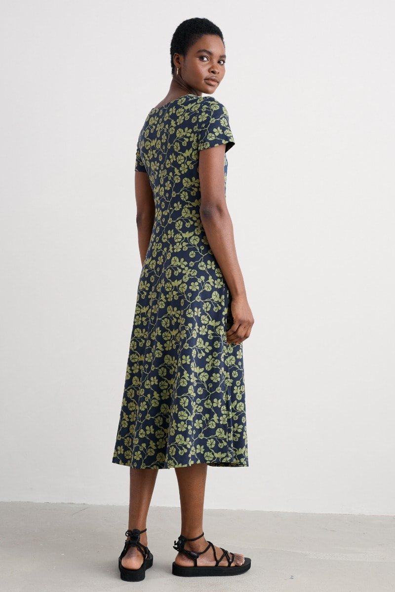 A half-sleeve version of our favourite Veronica Dress, with the same versatile midi length and drapey pleated skirt. The easy shape and organic cotton blend jersey give a lovely movement to our handcrafted prints. We’ll be wearing it with simple trainers and sandals all summer long.