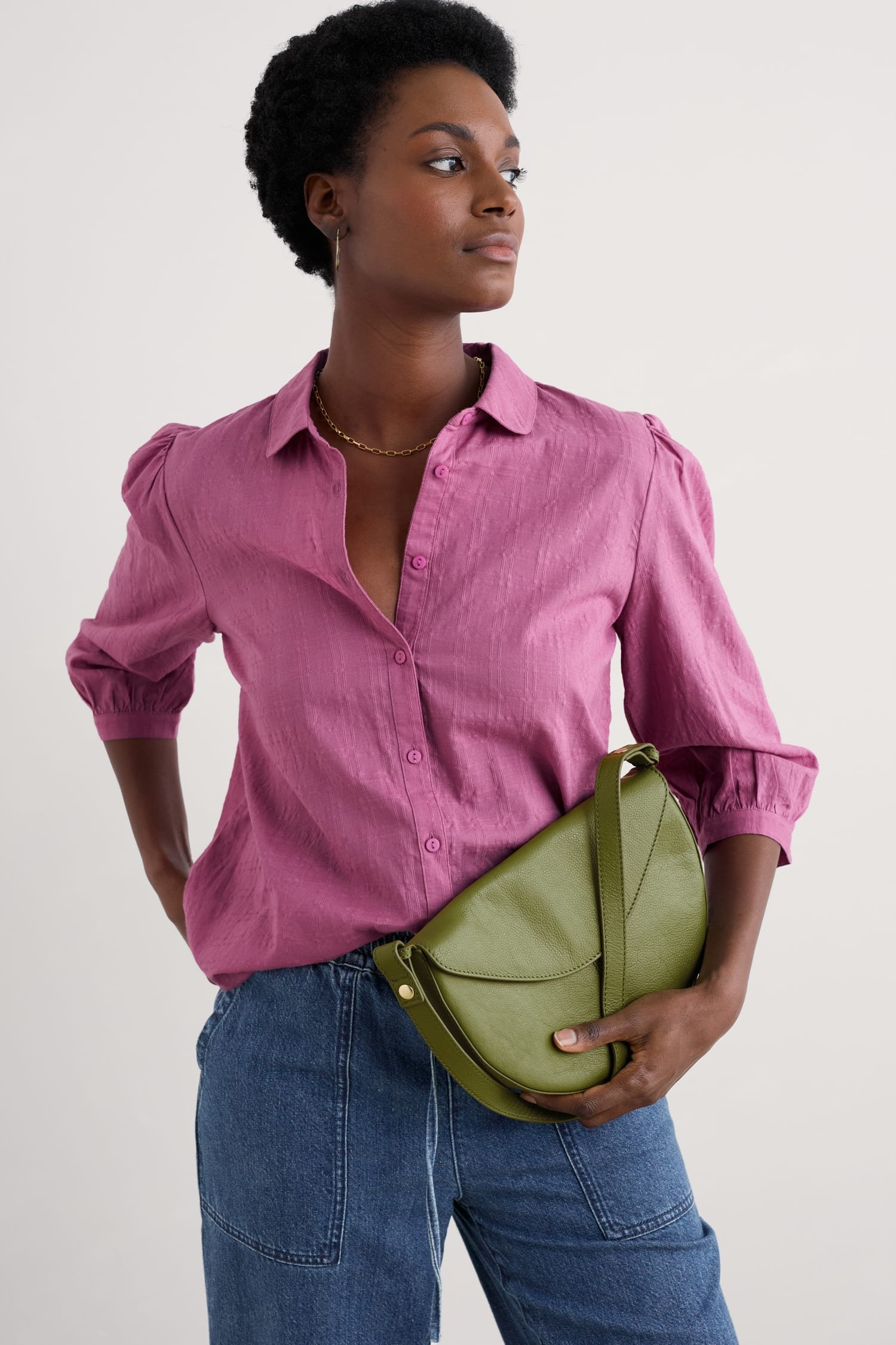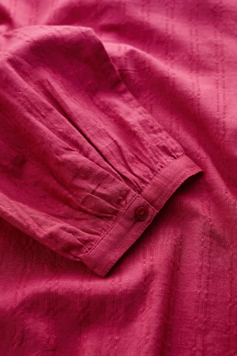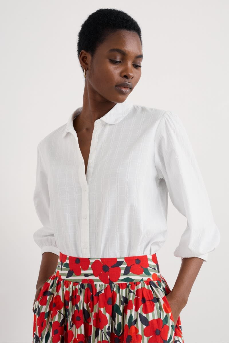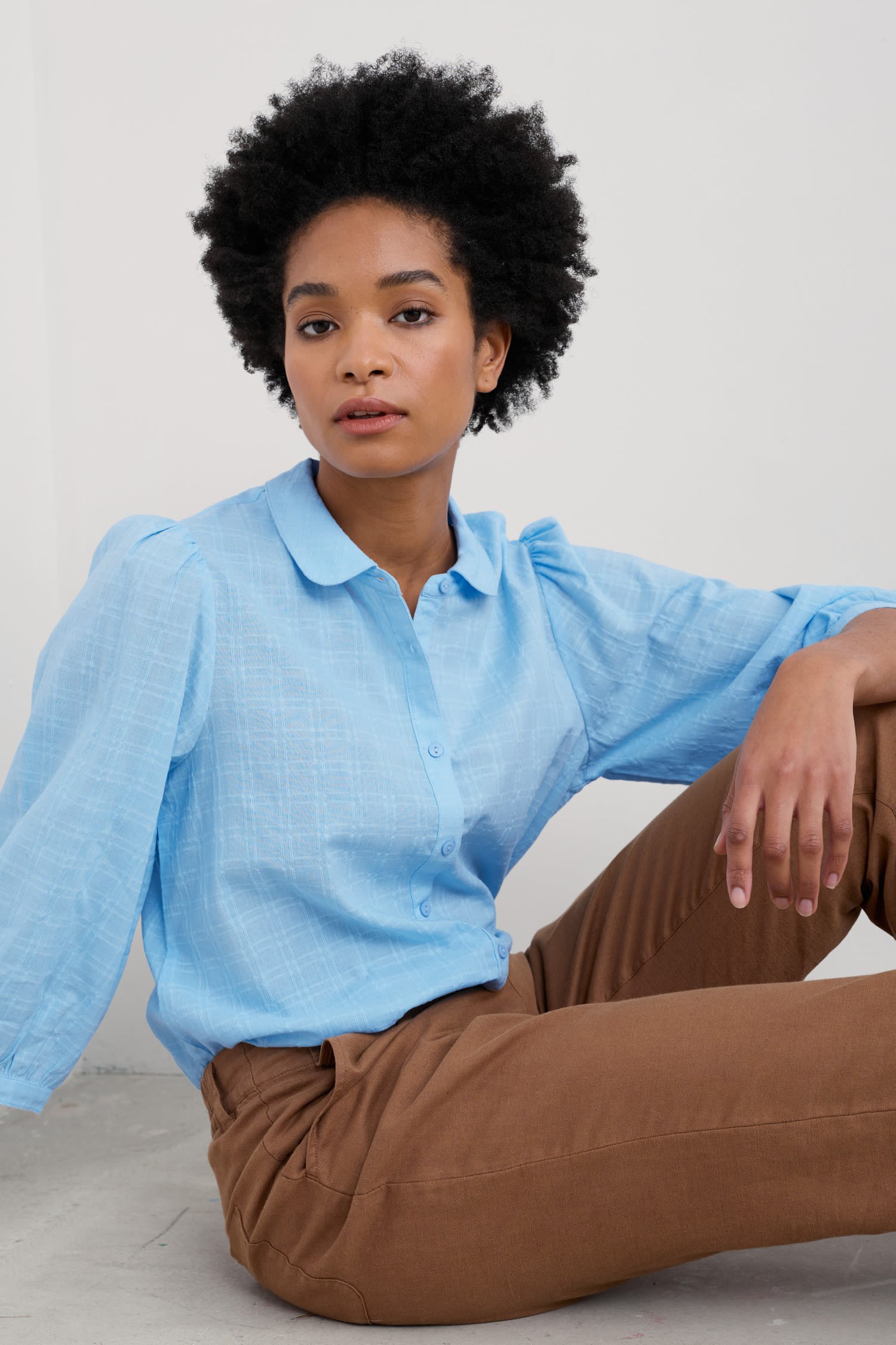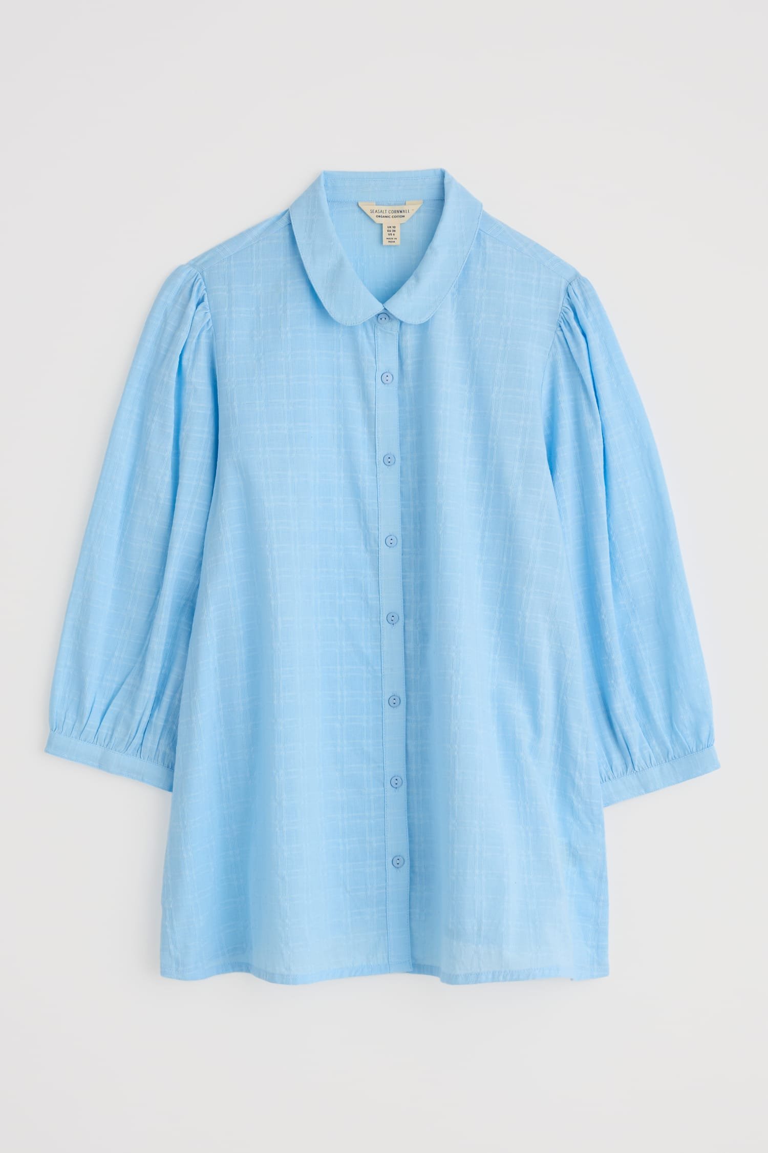 A flowy button-down blouse with a subtle flared shape, a dainty collar, gathered blouson sleeves and a tonal check. Woven from light organic cotton, we’ll pair it with simple crops on high summer days and layer under jumpers through the cooler months.
