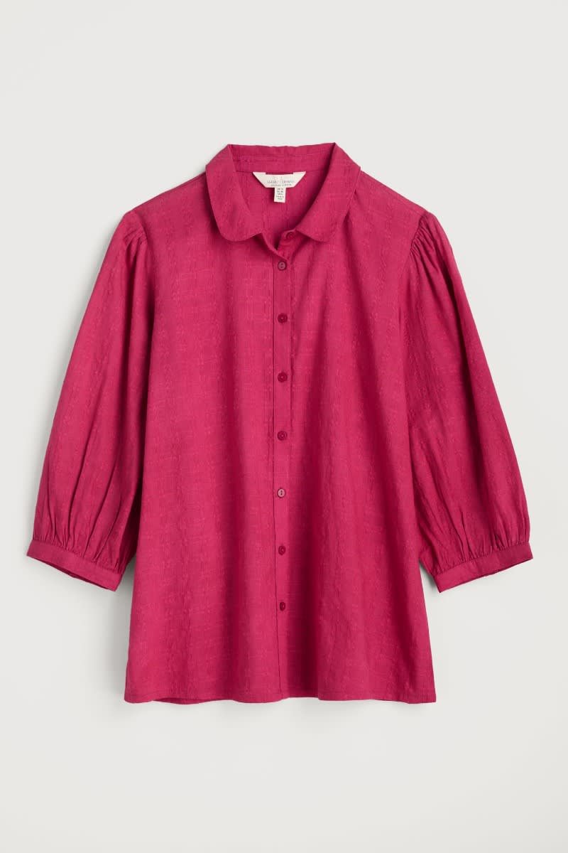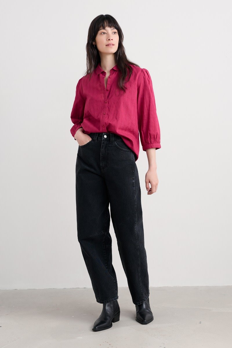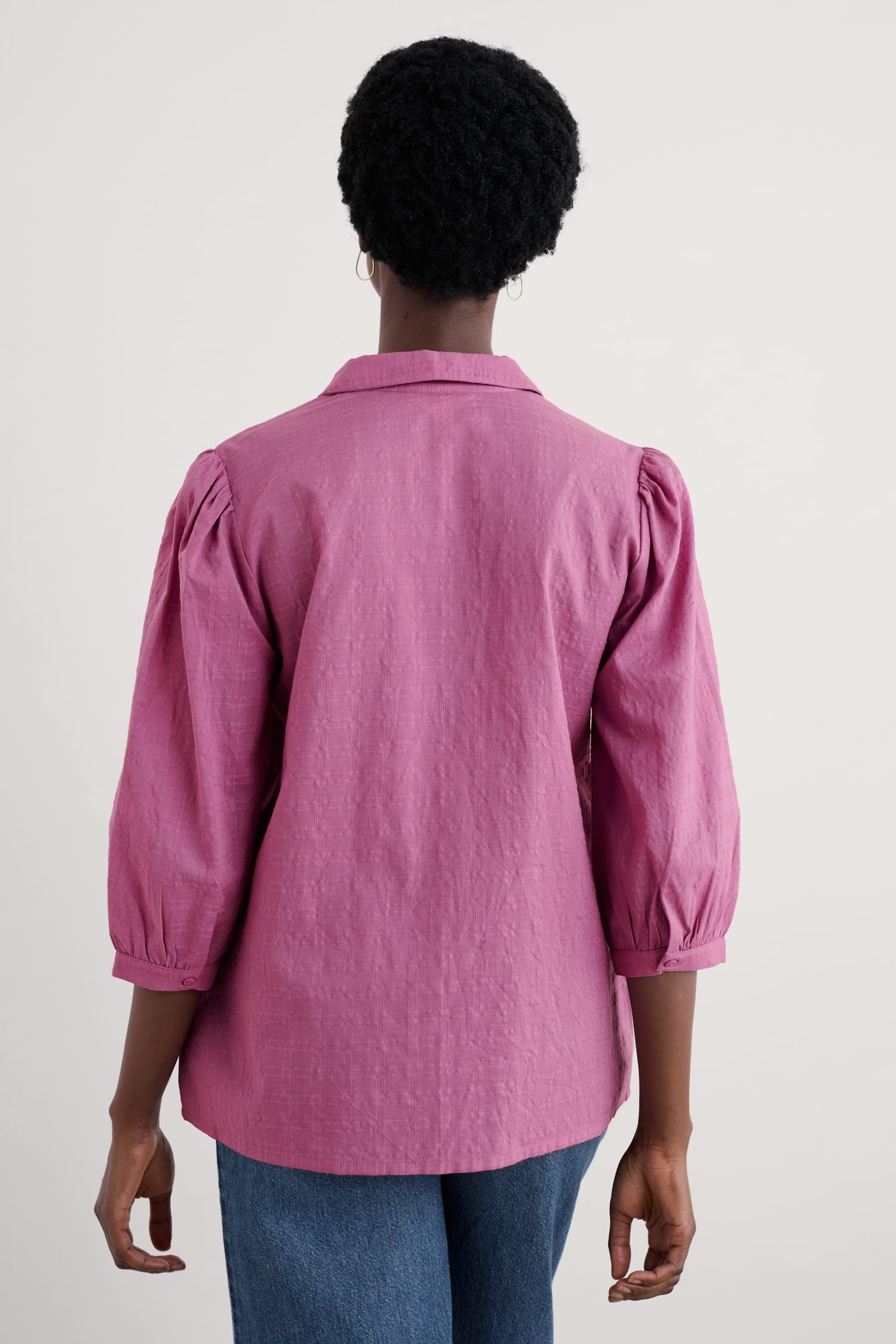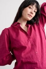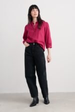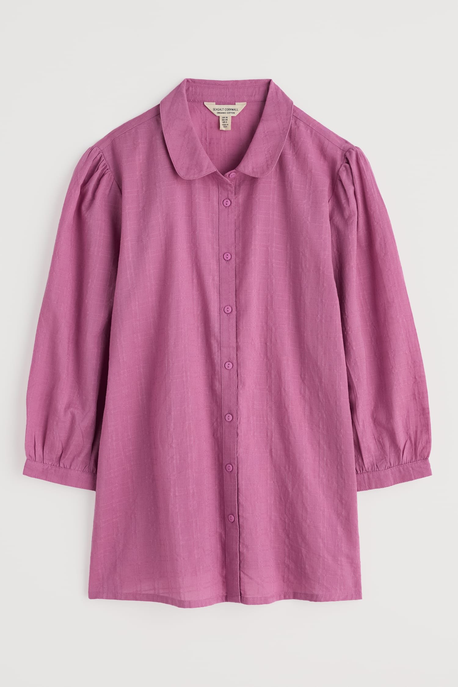 A flowy button-down blouse with a subtle flared shape, a dainty collar, gathered blouson sleeves and a tonal check. Woven from light organic cotton, we’ll pair it with simple crops on high summer days and layer under jumpers through the cooler months.