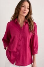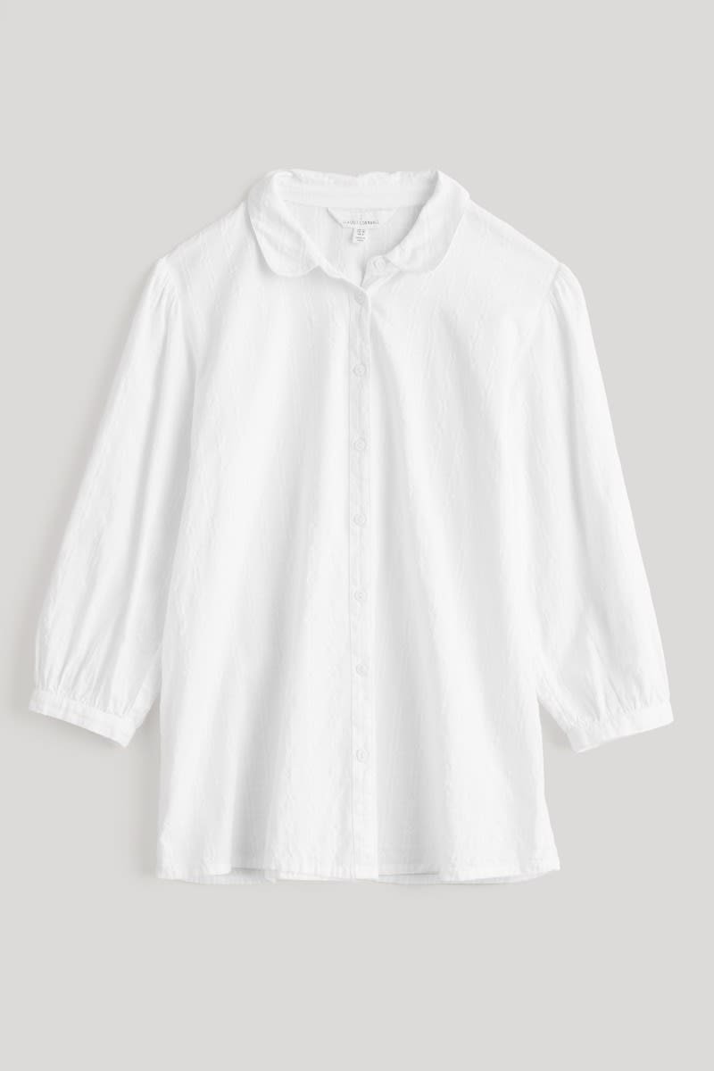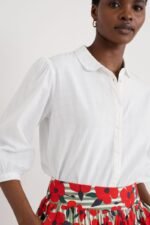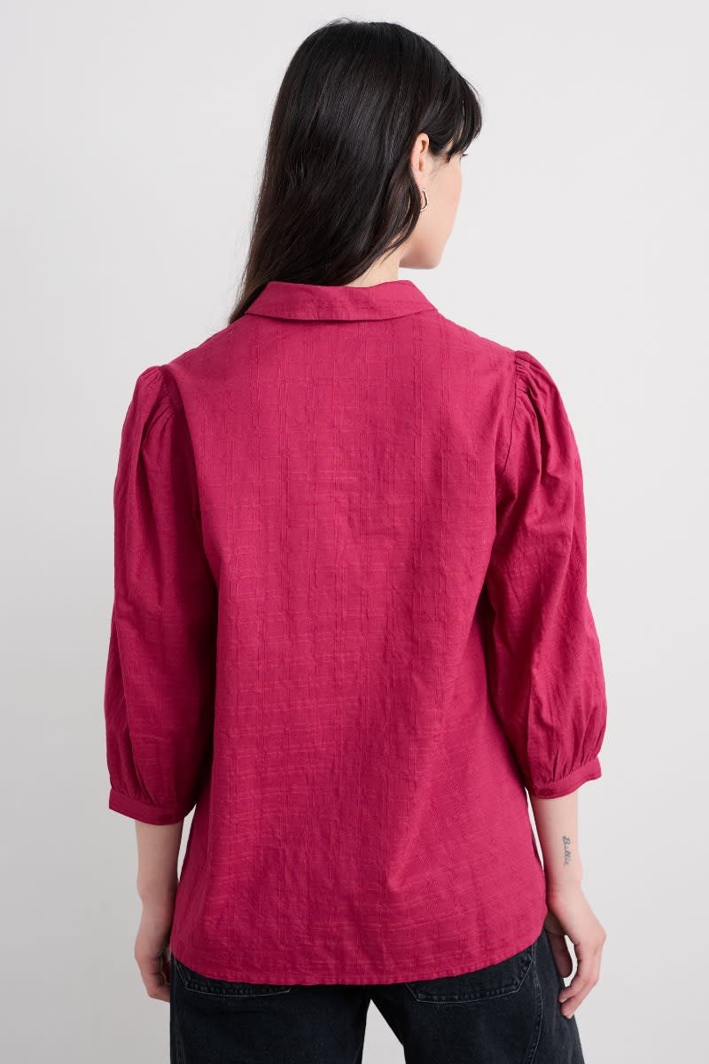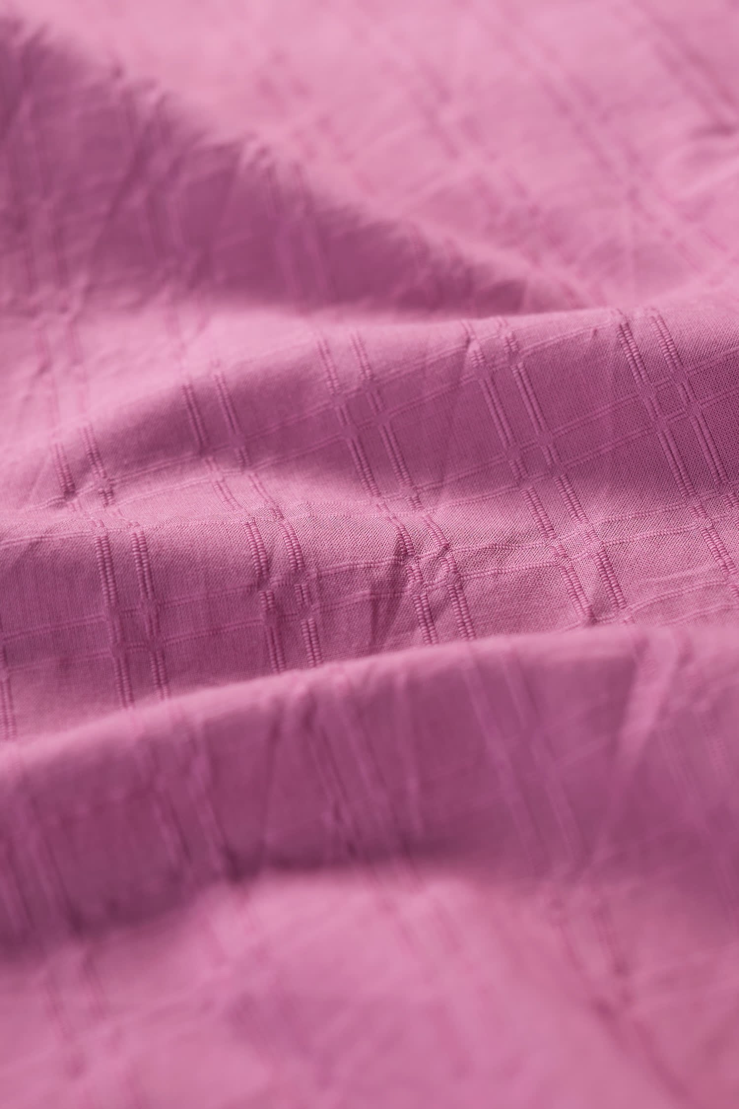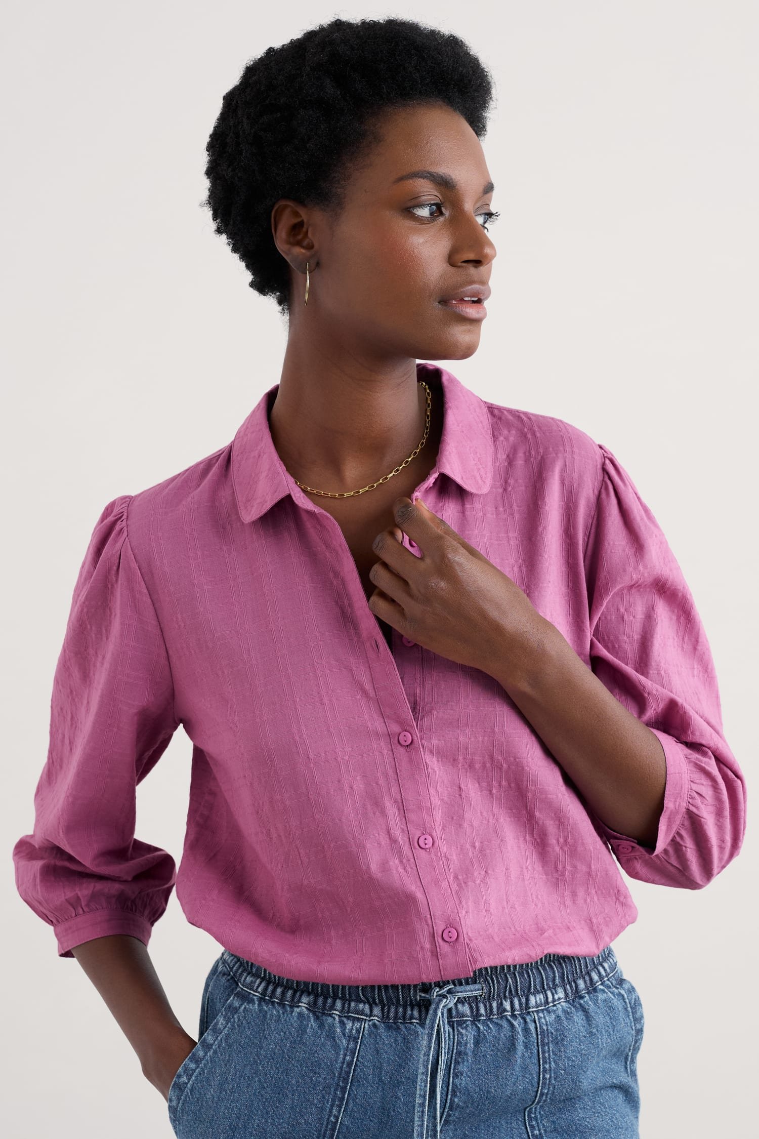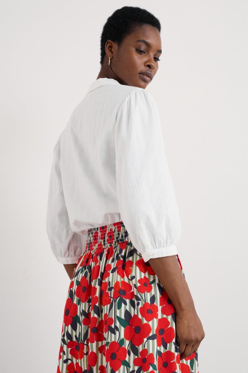 A flowy button-down blouse with a subtle flared shape, a dainty collar, gathered blouson sleeves and a tonal check. Woven from light organic cotton, we’ll pair it with simple crops on high summer days and layer under jumpers through the cooler months.