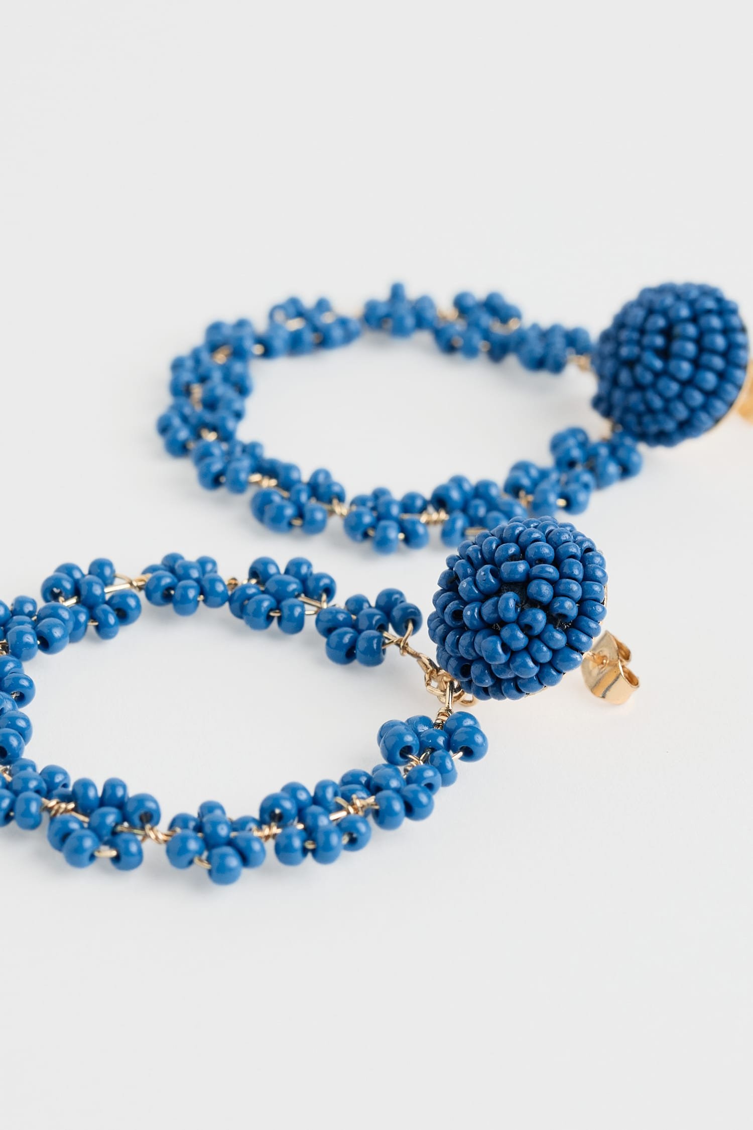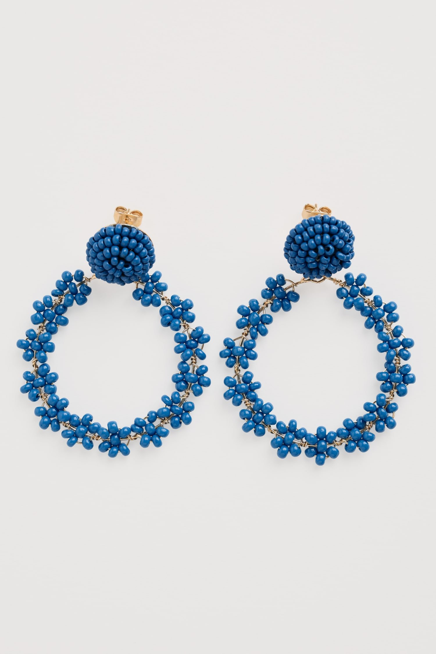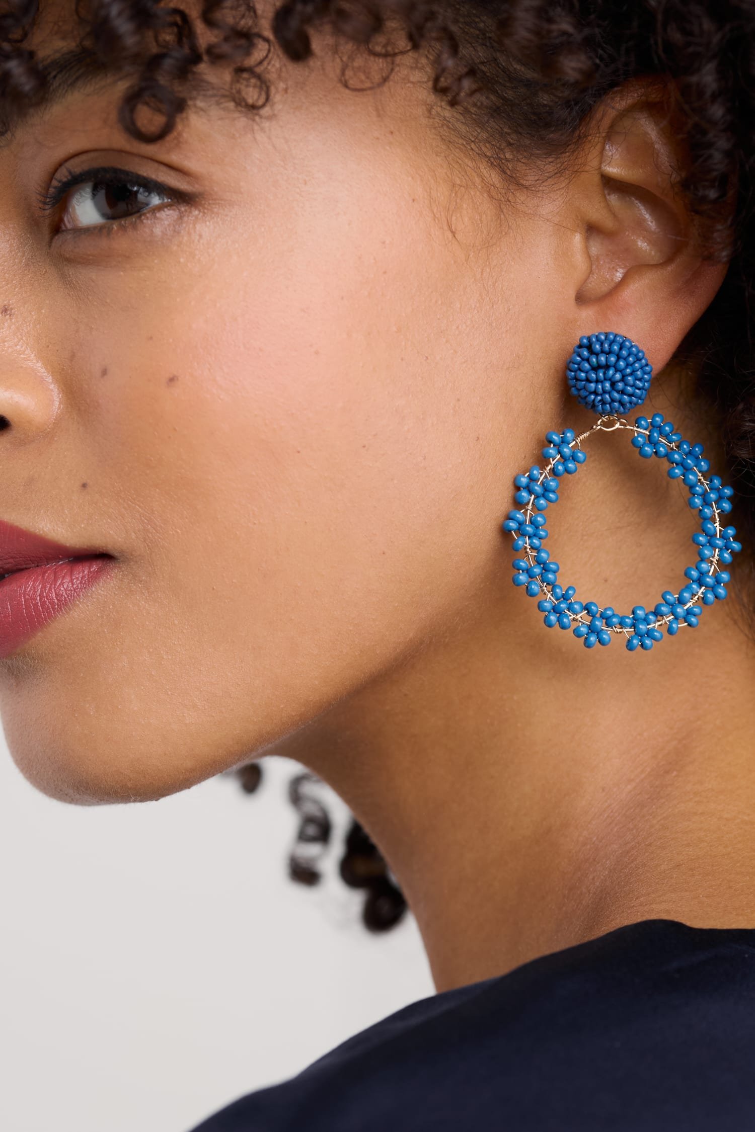 Stud earrings with a drop hoop, decorated with bright glass beads clustered in the shape of a flower. We love the joyful pop of colour this gives to outfits, and the lovely swaying movement of the hoops.