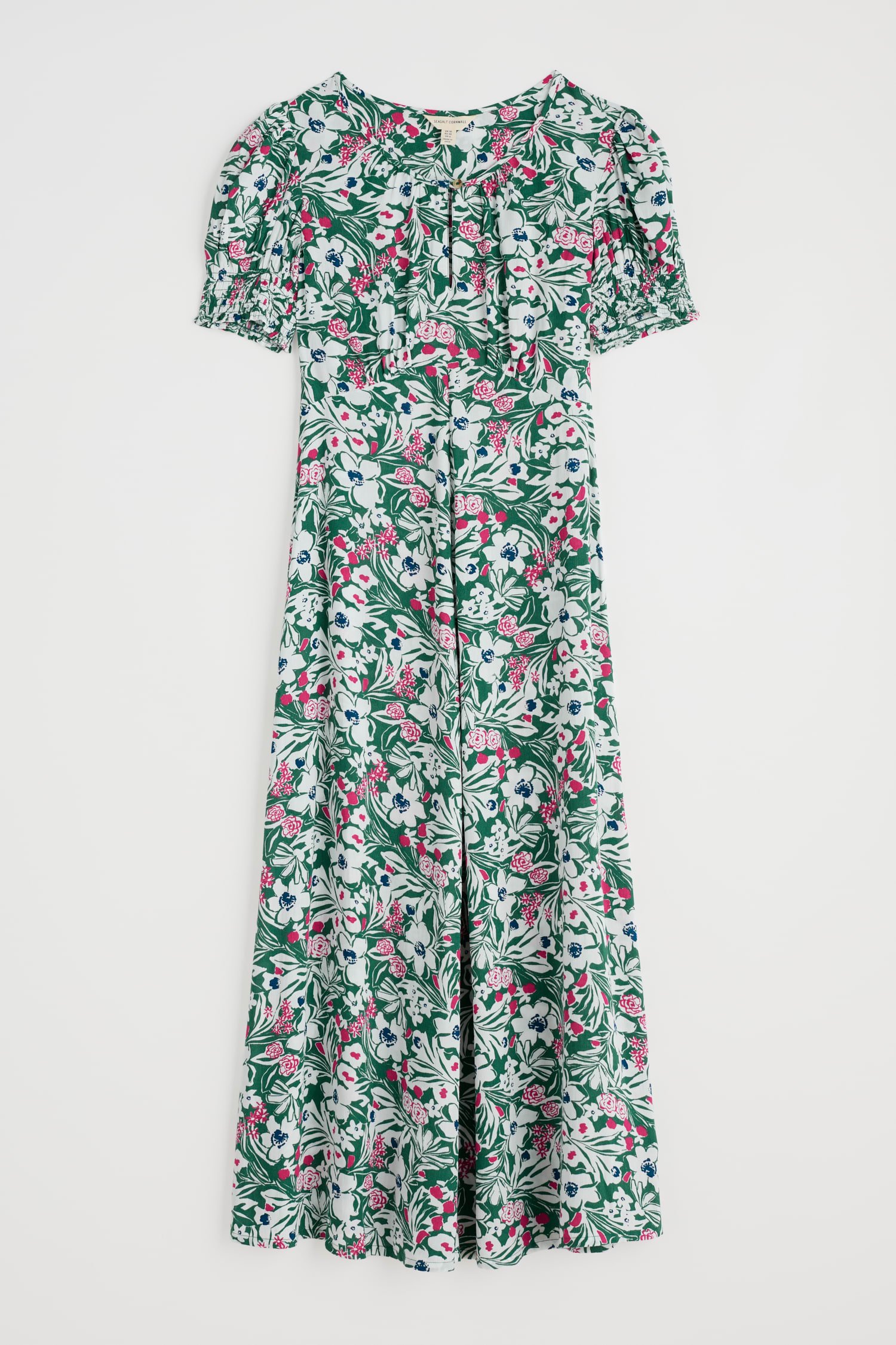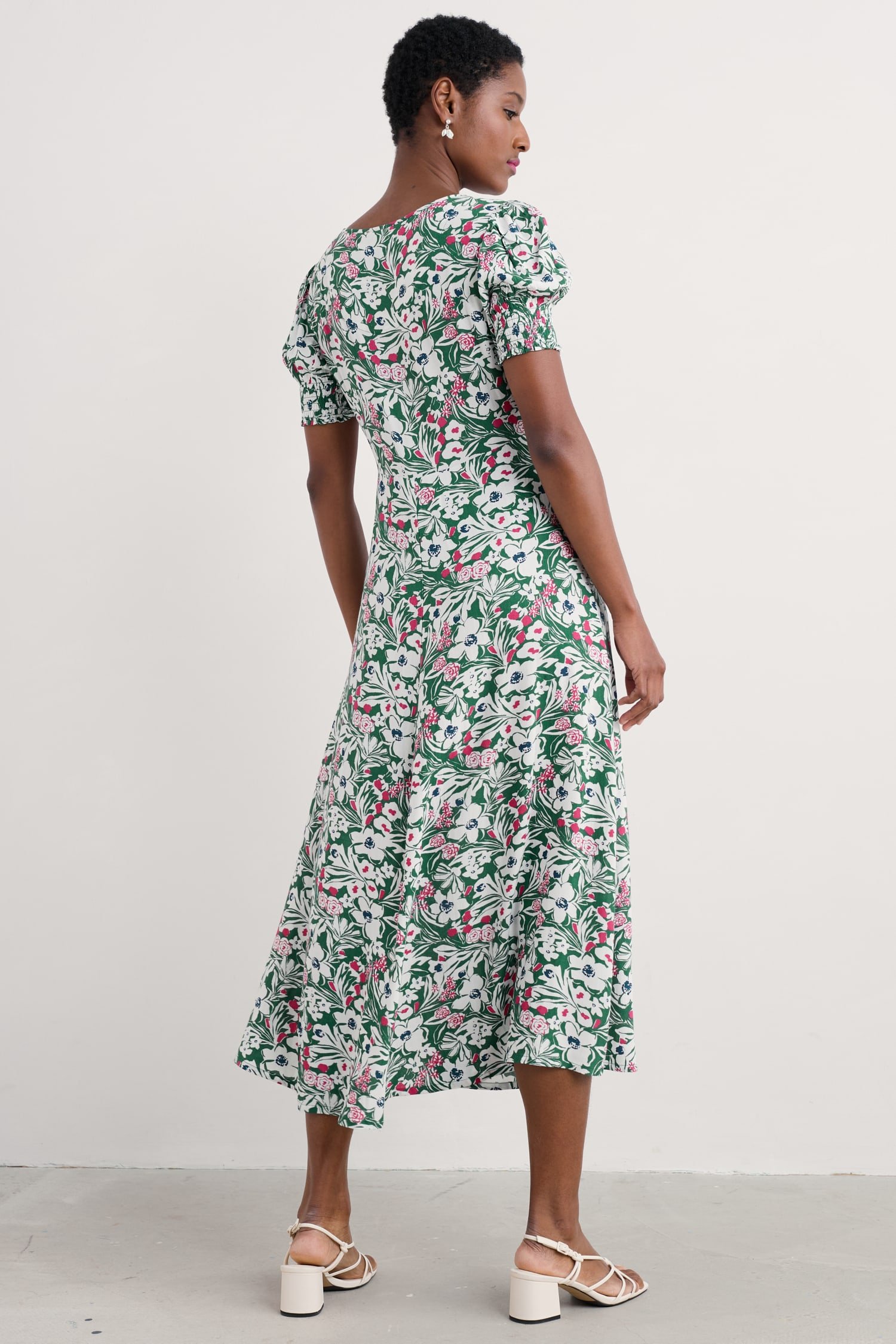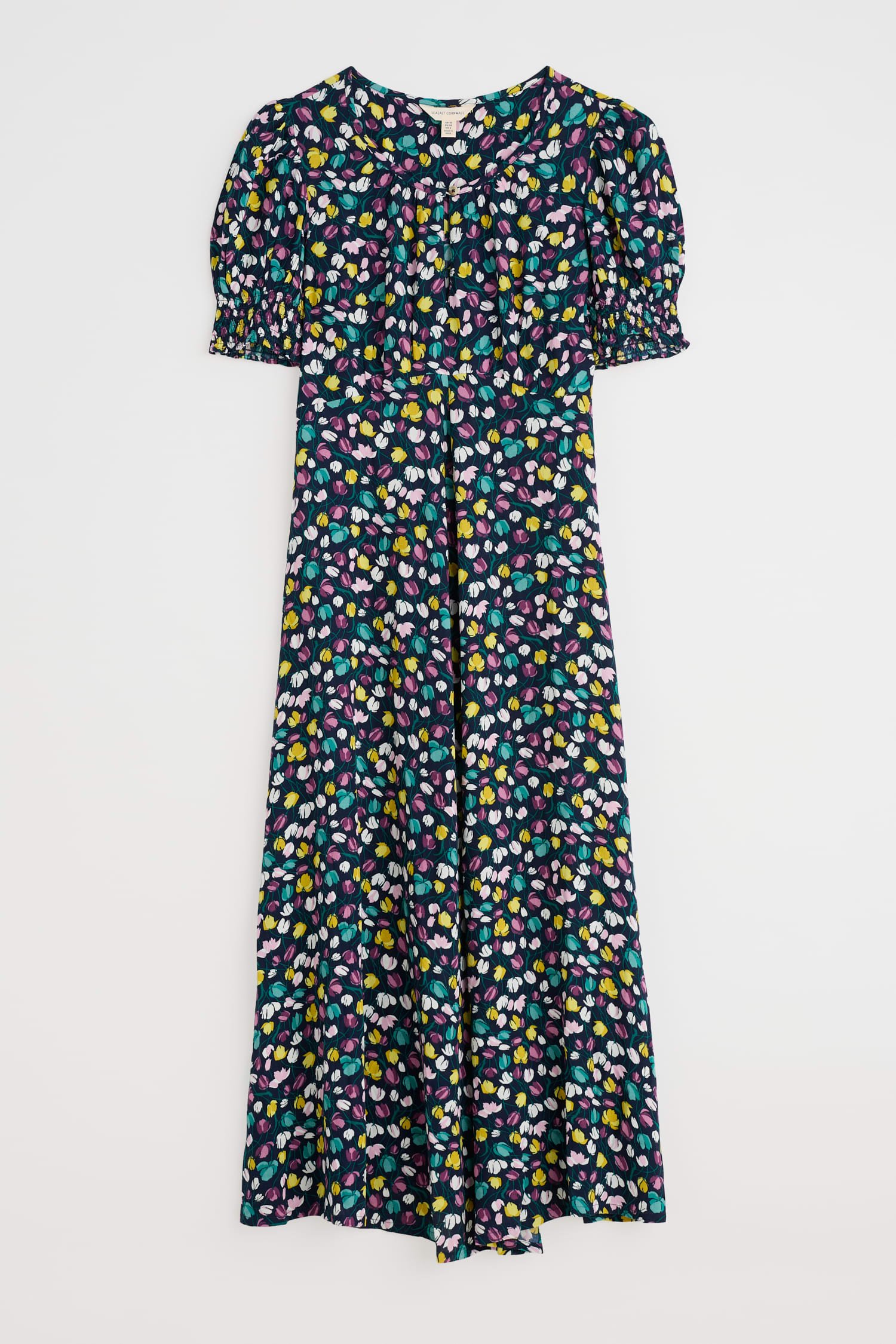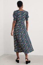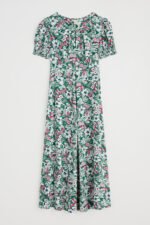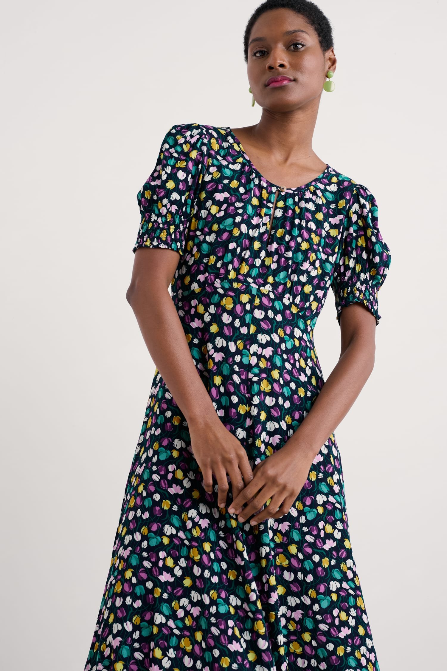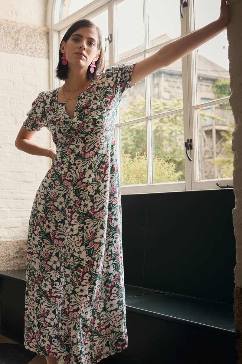A romantic, vintage-inspired dress with a skimming Empire Line fit and shirring at the cuffs for a subtle blouson sleeve. The simple scoop neckline has a deep notch detail with a button fastening.