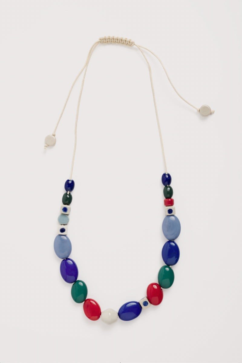 Richly coloured resin and ceramic beads on an adjustable cotton cord, with smooth and pebble textures inspired by the Cornish coast. We love this style over our favourite Sailor Shirt, tunics, and shirts – anything and everything!