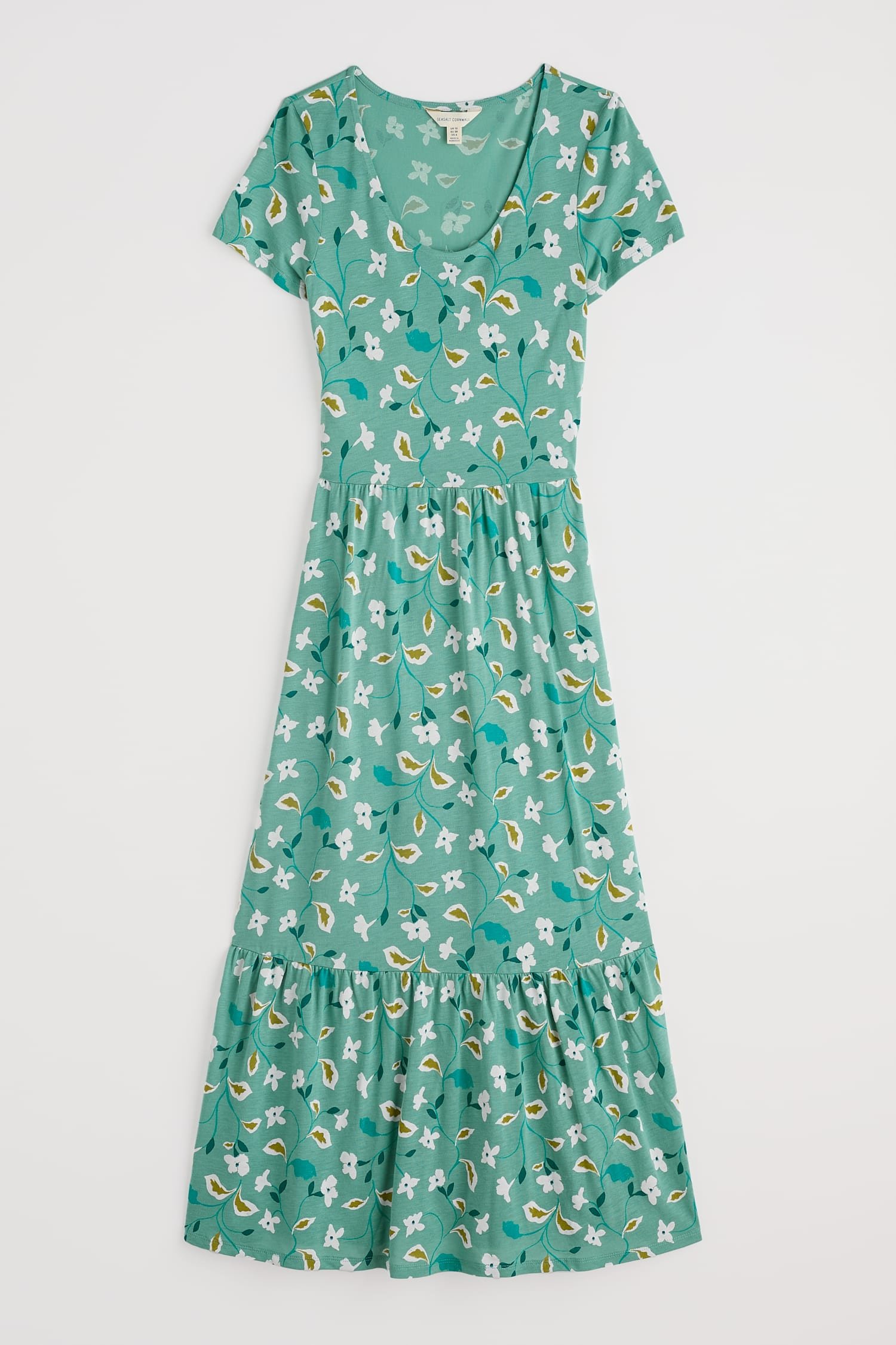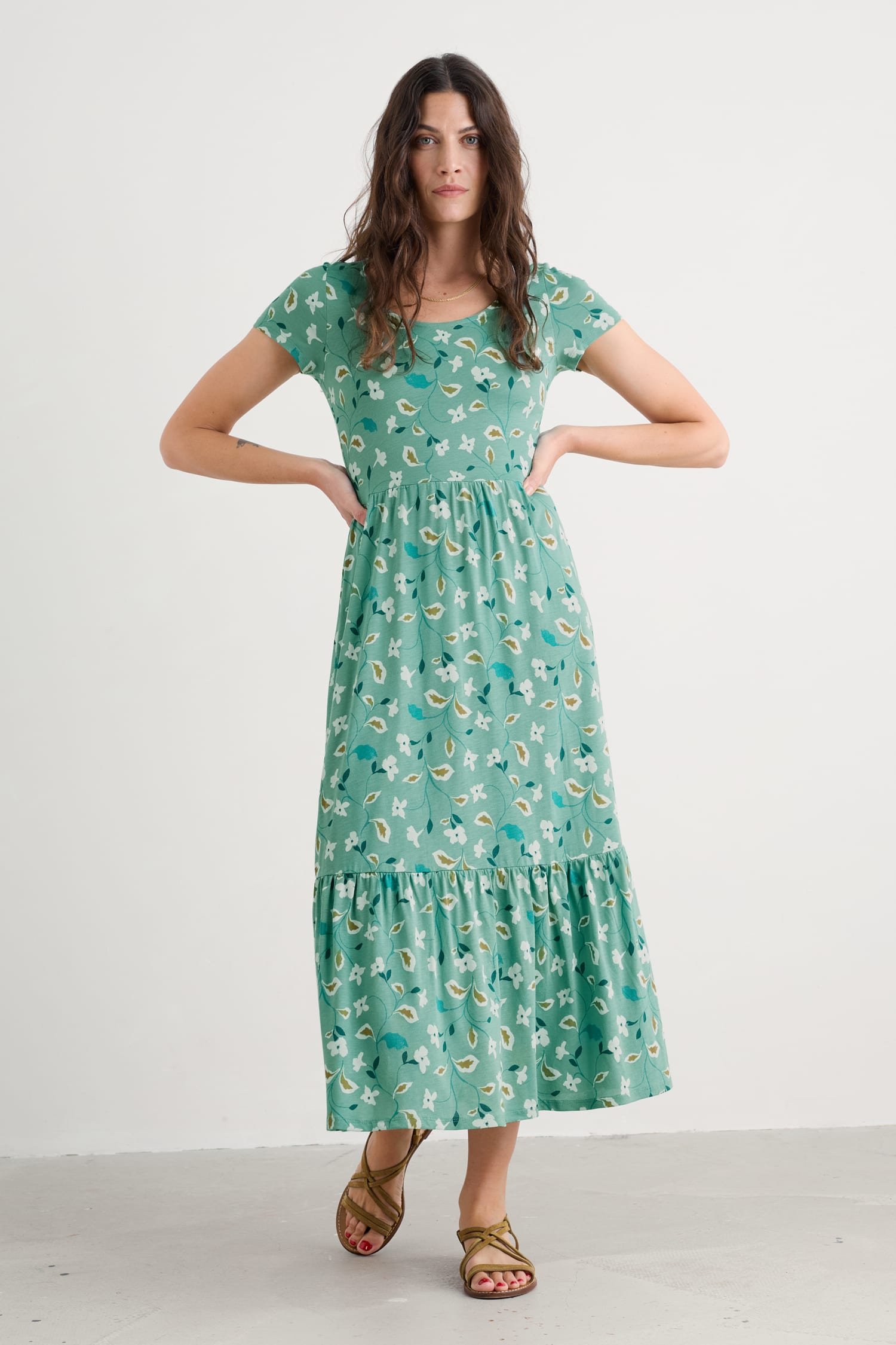 A swaying summer dress with a gathered waist, made from a breathable jersey blend with bamboo-derived viscose. The deep tier at the bottom hem gives its seasonal print a lovely movement.