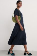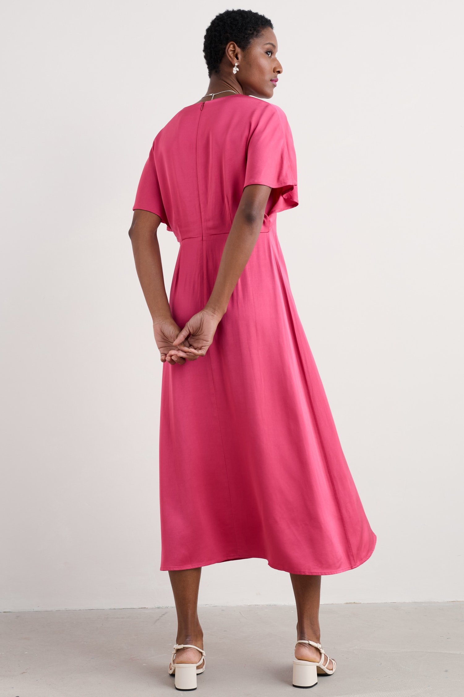 A luxurious satin dress for parties, weddings, evenings out and more; any occasion where you need a simple, elegant showstopper. The empire line silhouette has a shaped gathers that reflect the V-neckline, and the flutter sleeves have a lovely movement.