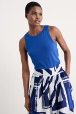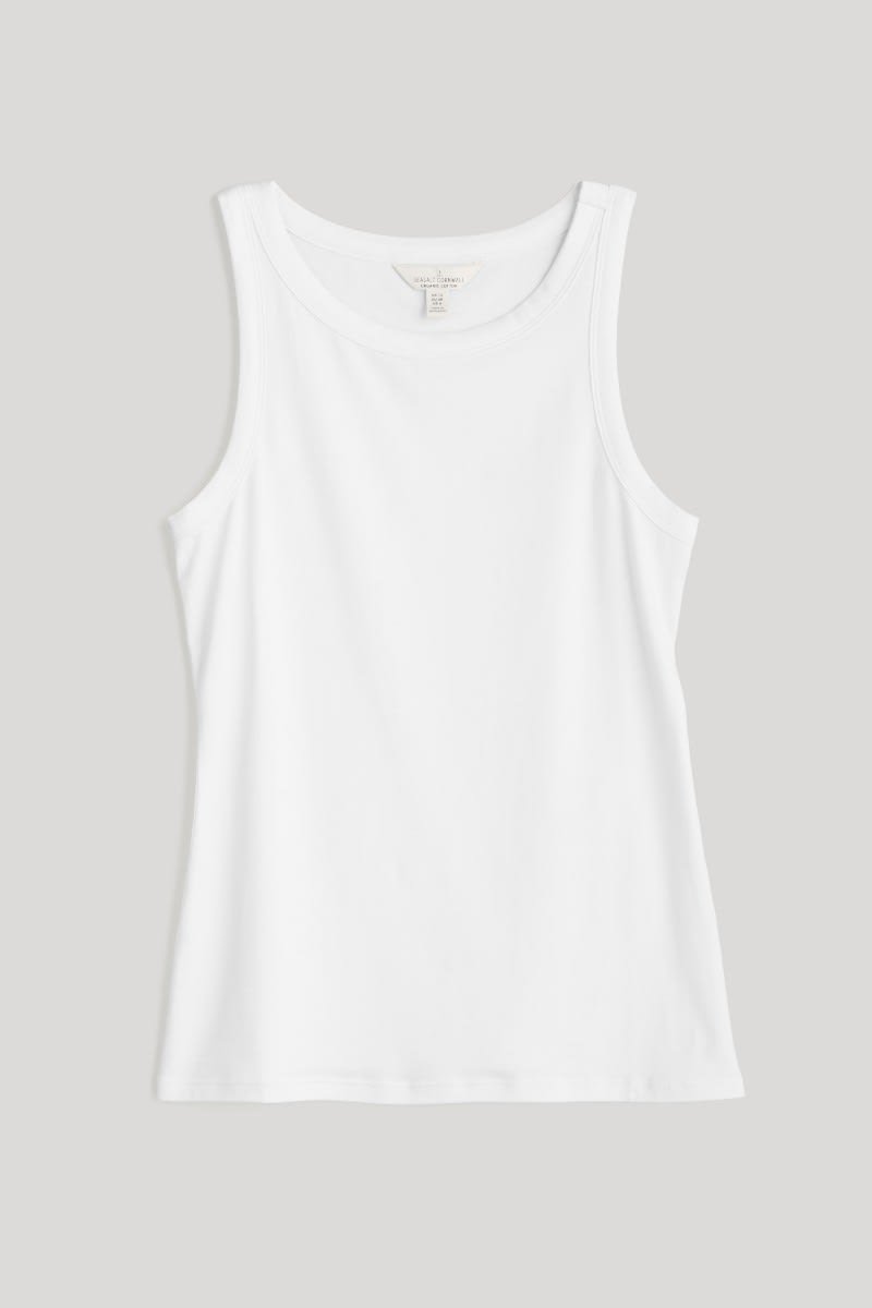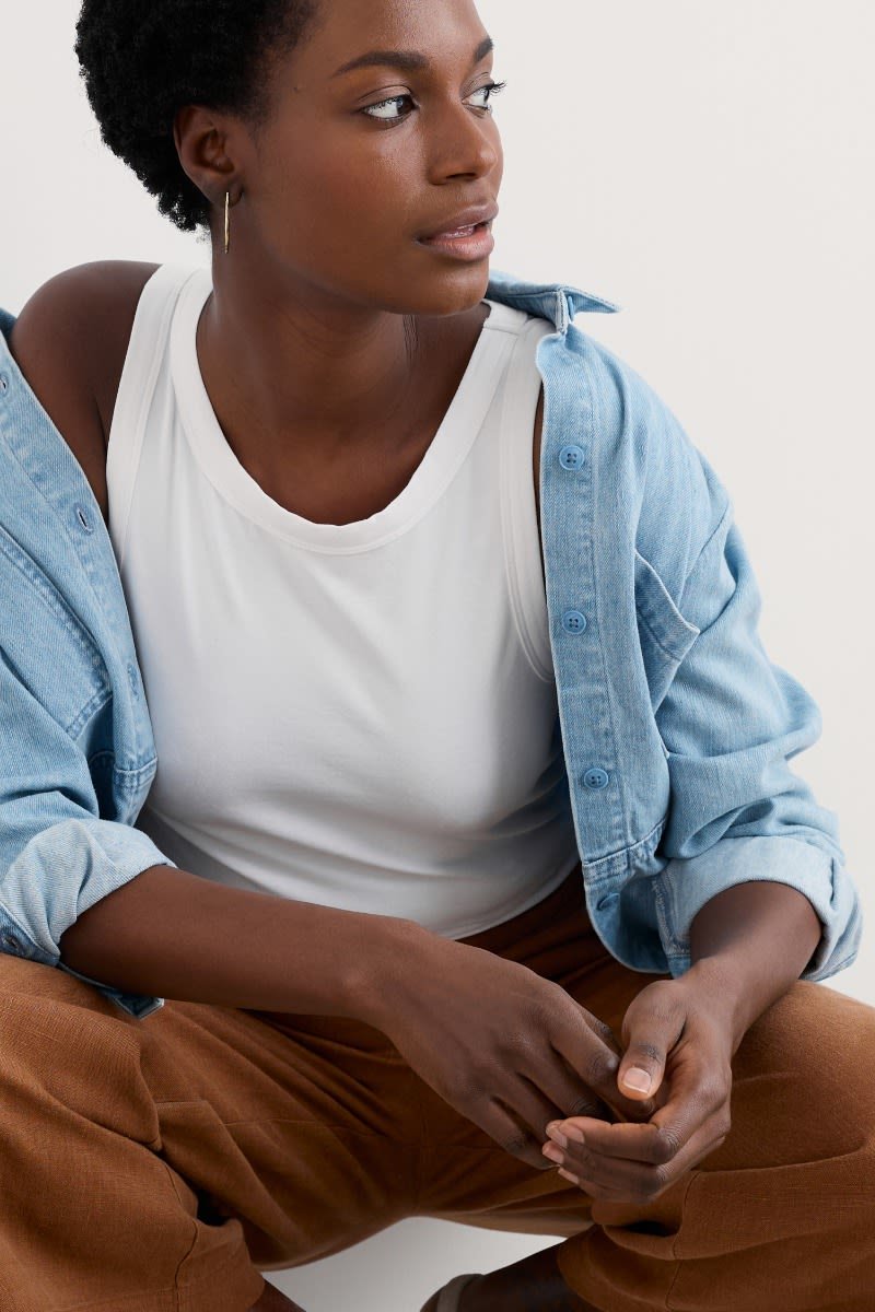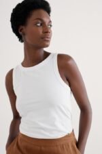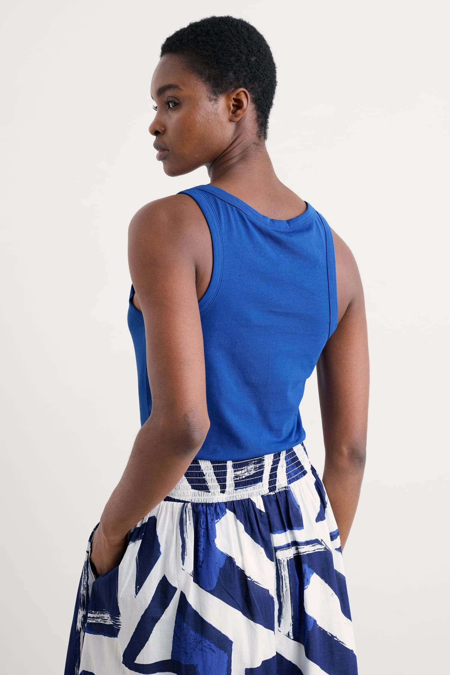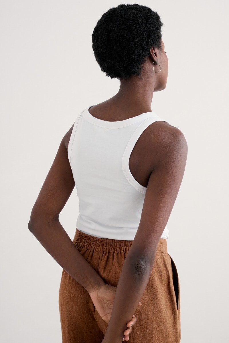 A racerback jersey tank top made from breathable GOTS-certified organic cotton. One of our simplest summer staples, perfect for beach trips or as a crisp white contrast under colourful linen layers.