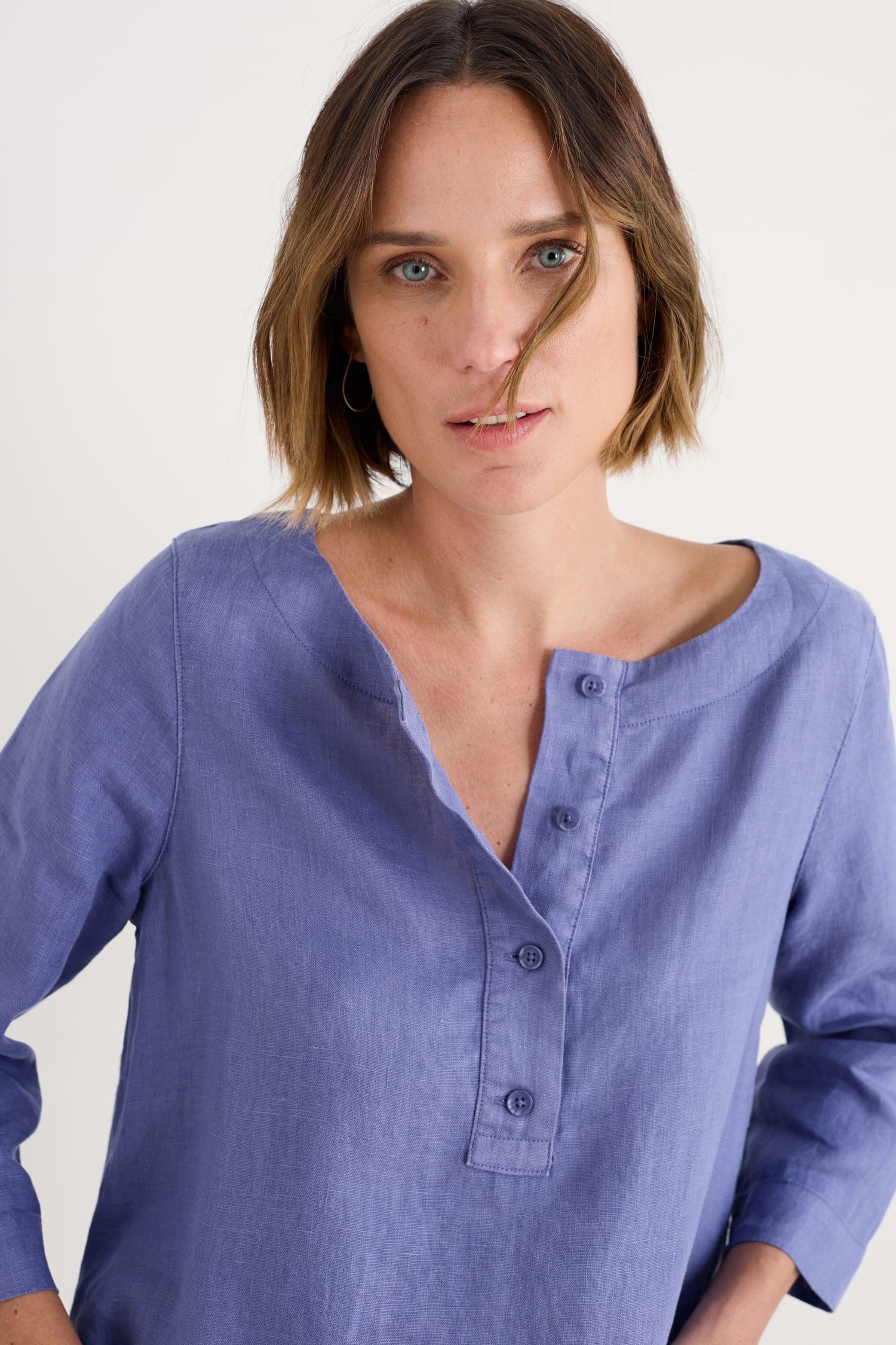 A versatile tunic with a half-button placket at the neckline, made from breathable linen. The colour has been garment-dyed for unique highs and lows, and should develop more character with every summer of wear. We love wearing it with leggings, and will pop an Easel Top underneath if we need extra warmth or a pop of contrast colour.