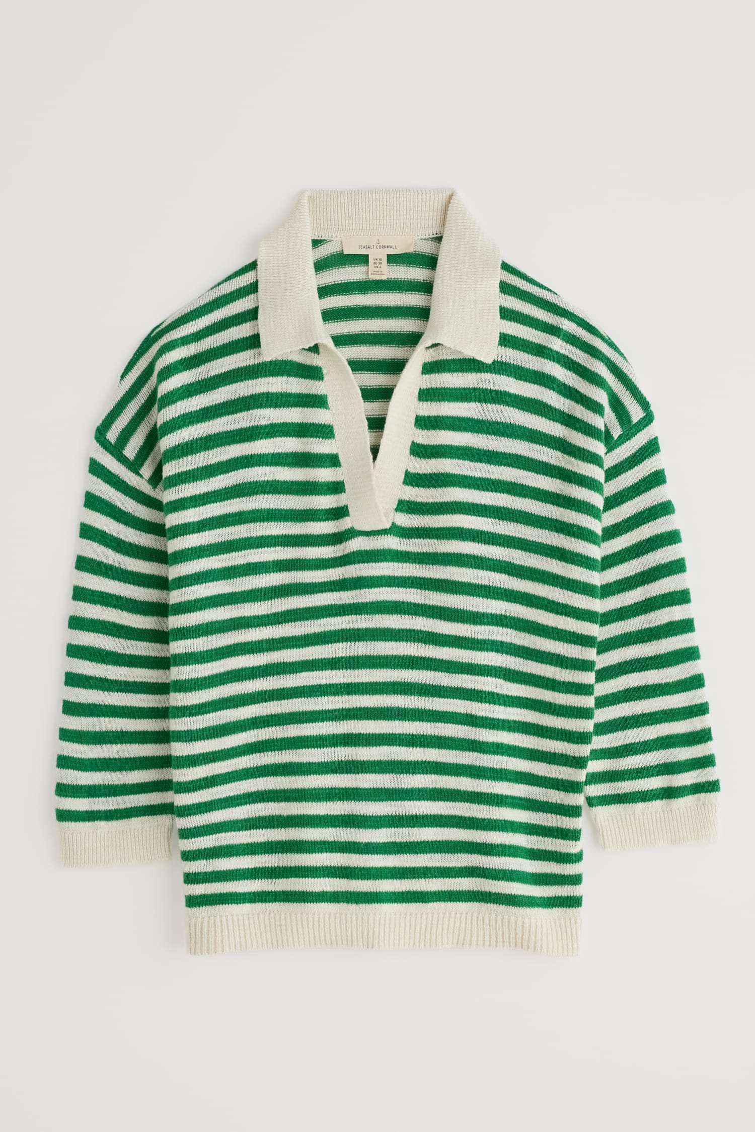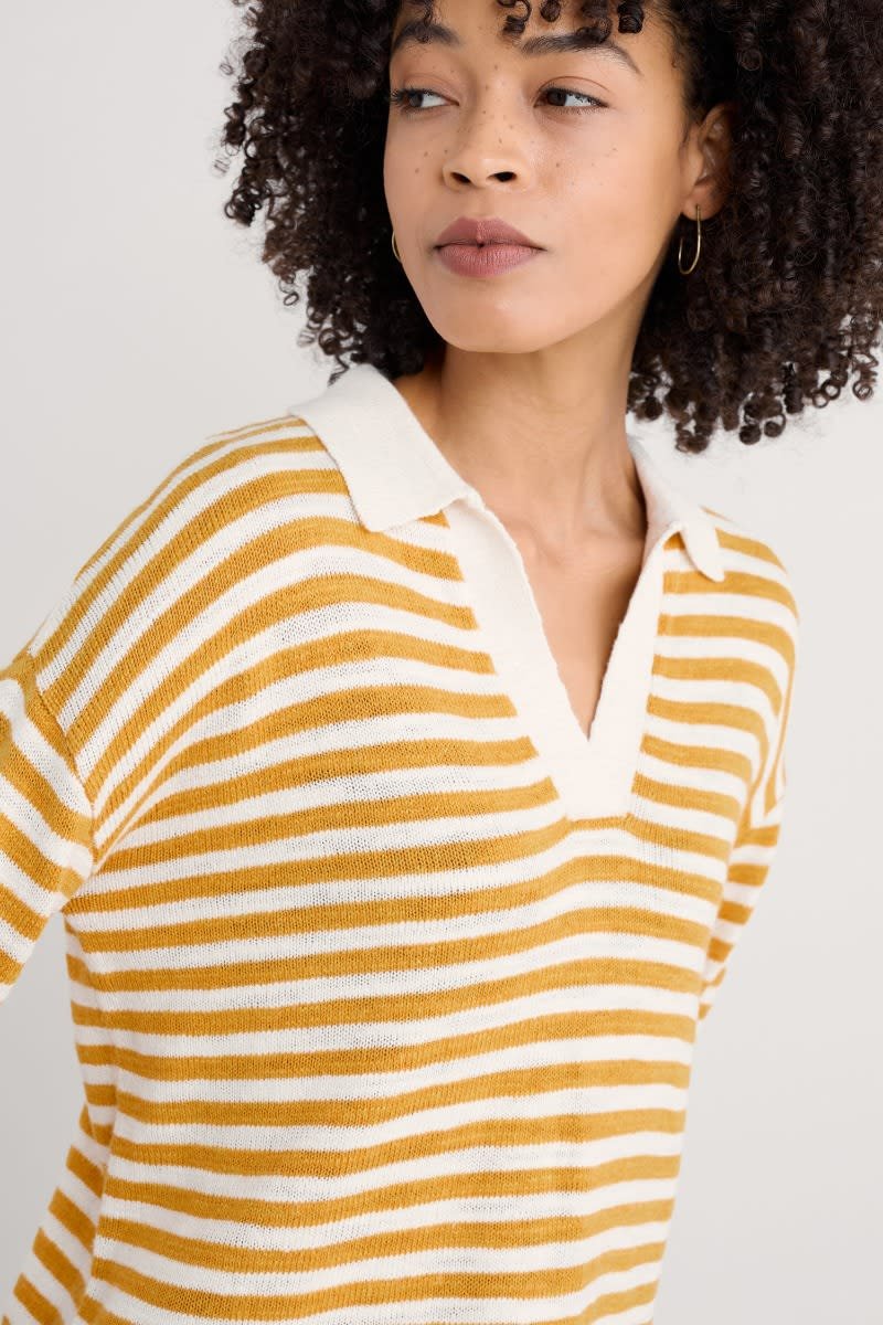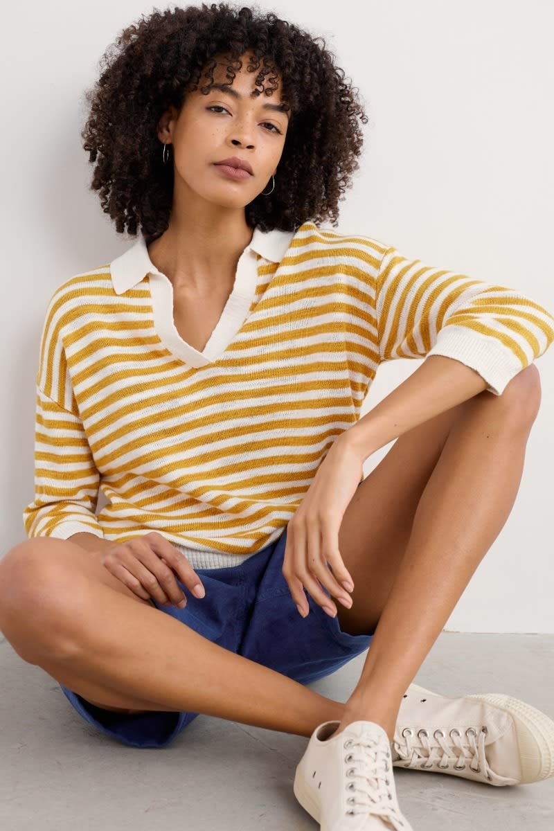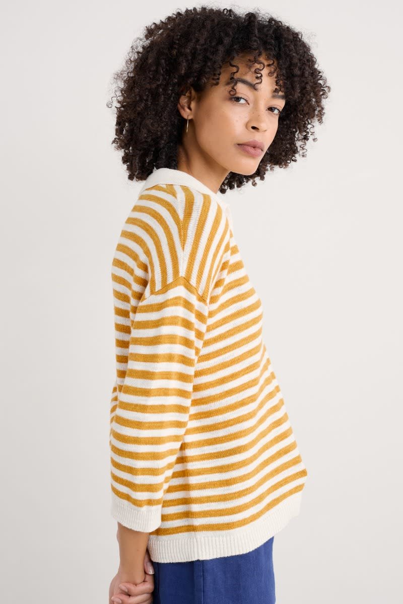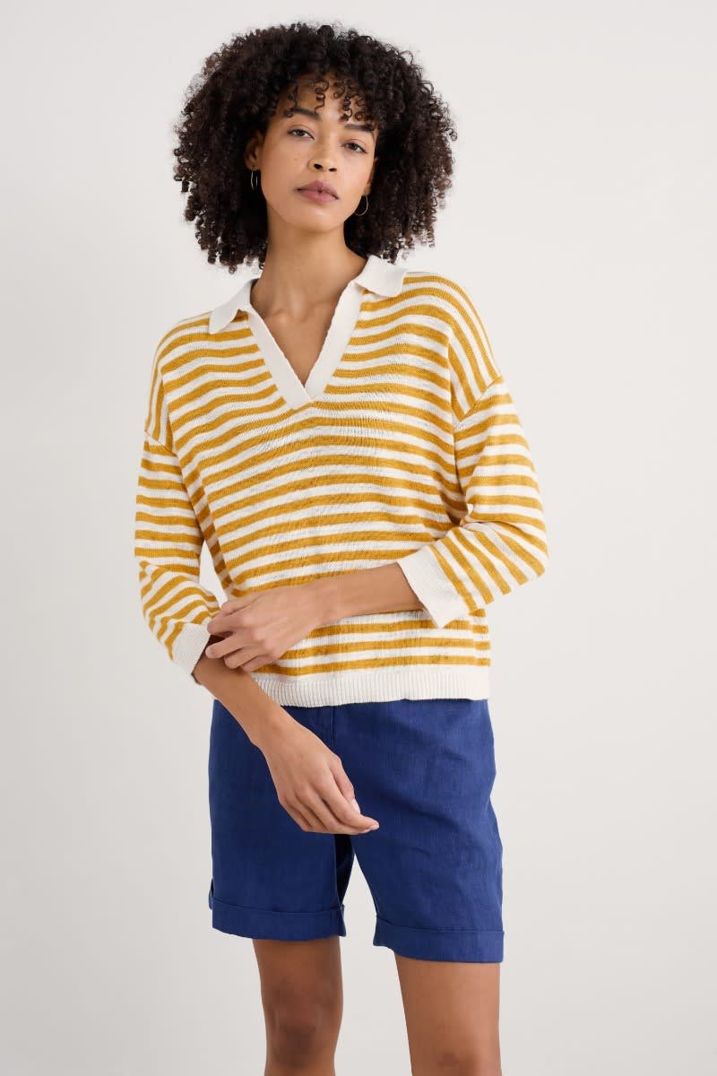 A light and airy jumper in a breathable organic cotton and linen blend. We’ve given the Gwynver a relaxed fit with a dropped shoulder and three-quarter length sleeves. A collar and deep V-neck give it a refined yet casual feel that’s perfect paired with shorts or linen trousers.