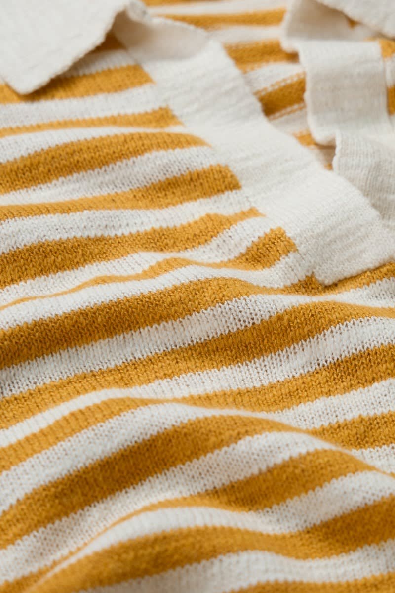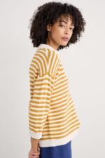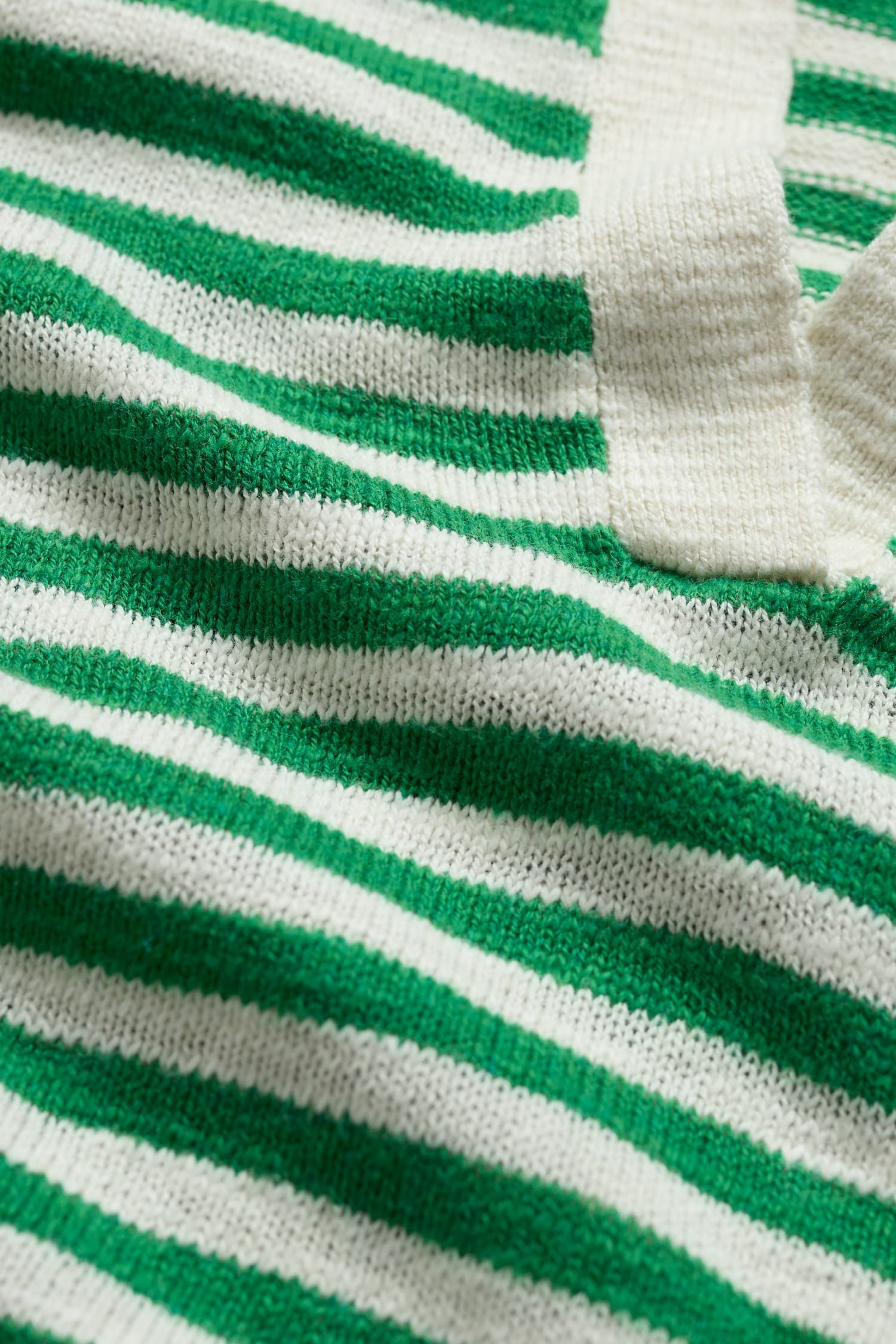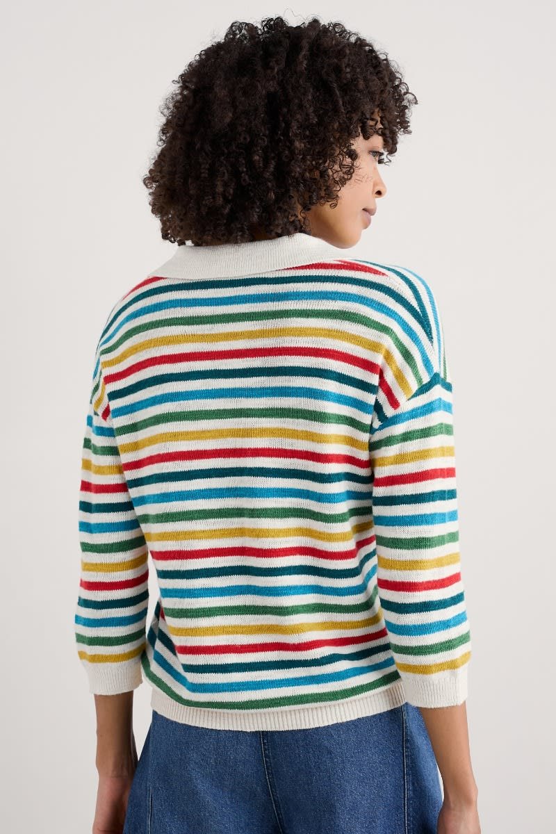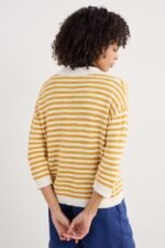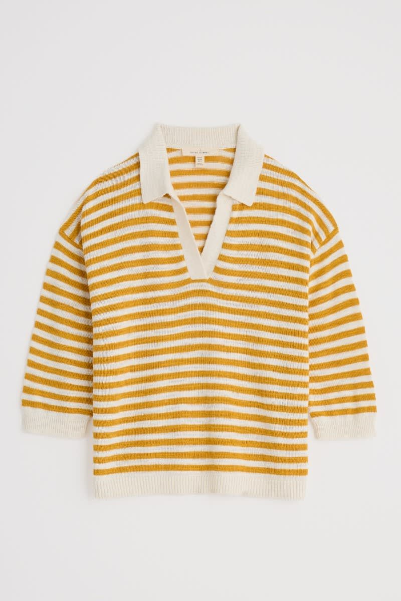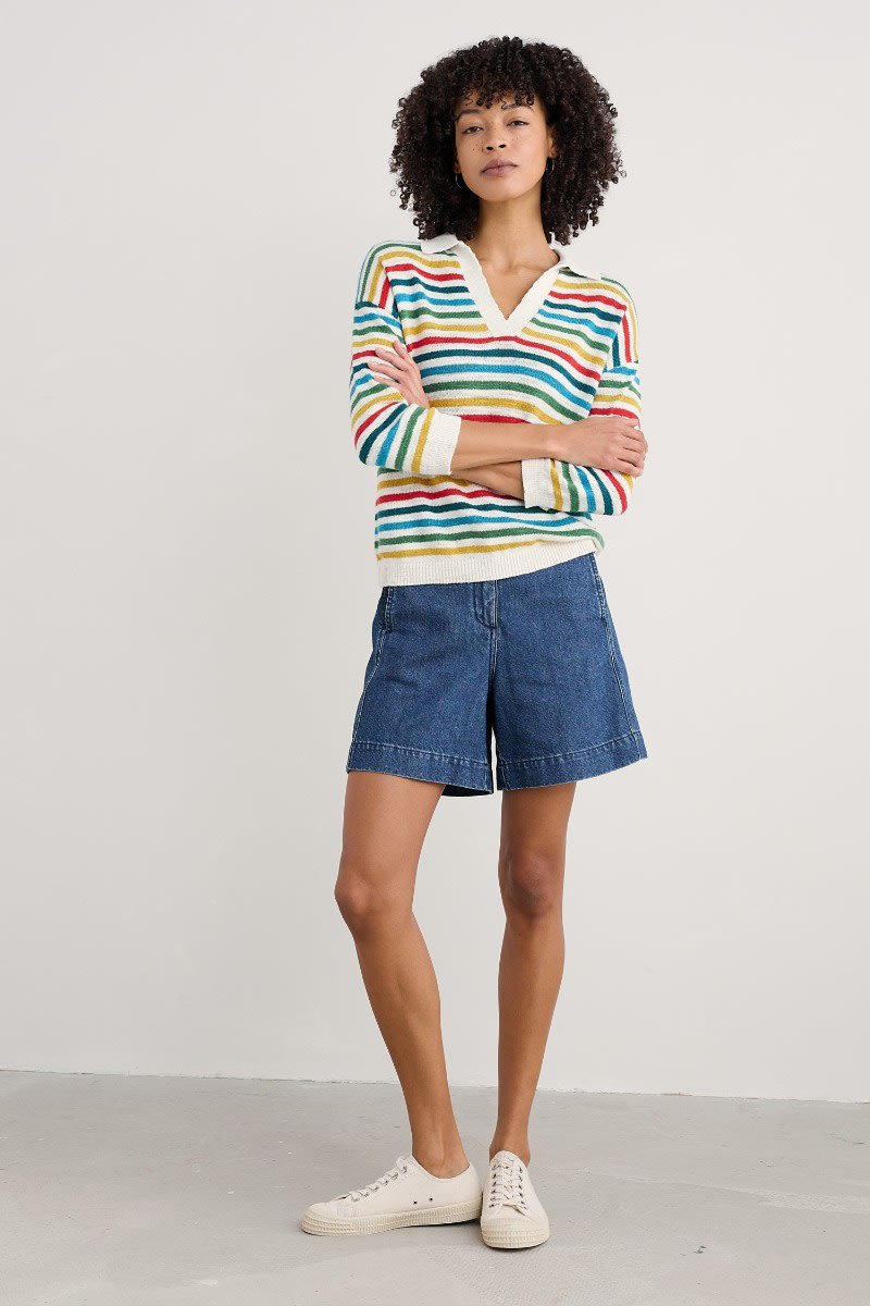 A light and airy jumper in a breathable organic cotton and linen blend. We’ve given the Gwynver a relaxed fit with a dropped shoulder and three-quarter length sleeves. A collar and deep V-neck give it a refined yet casual feel that’s perfect paired with shorts or linen trousers.