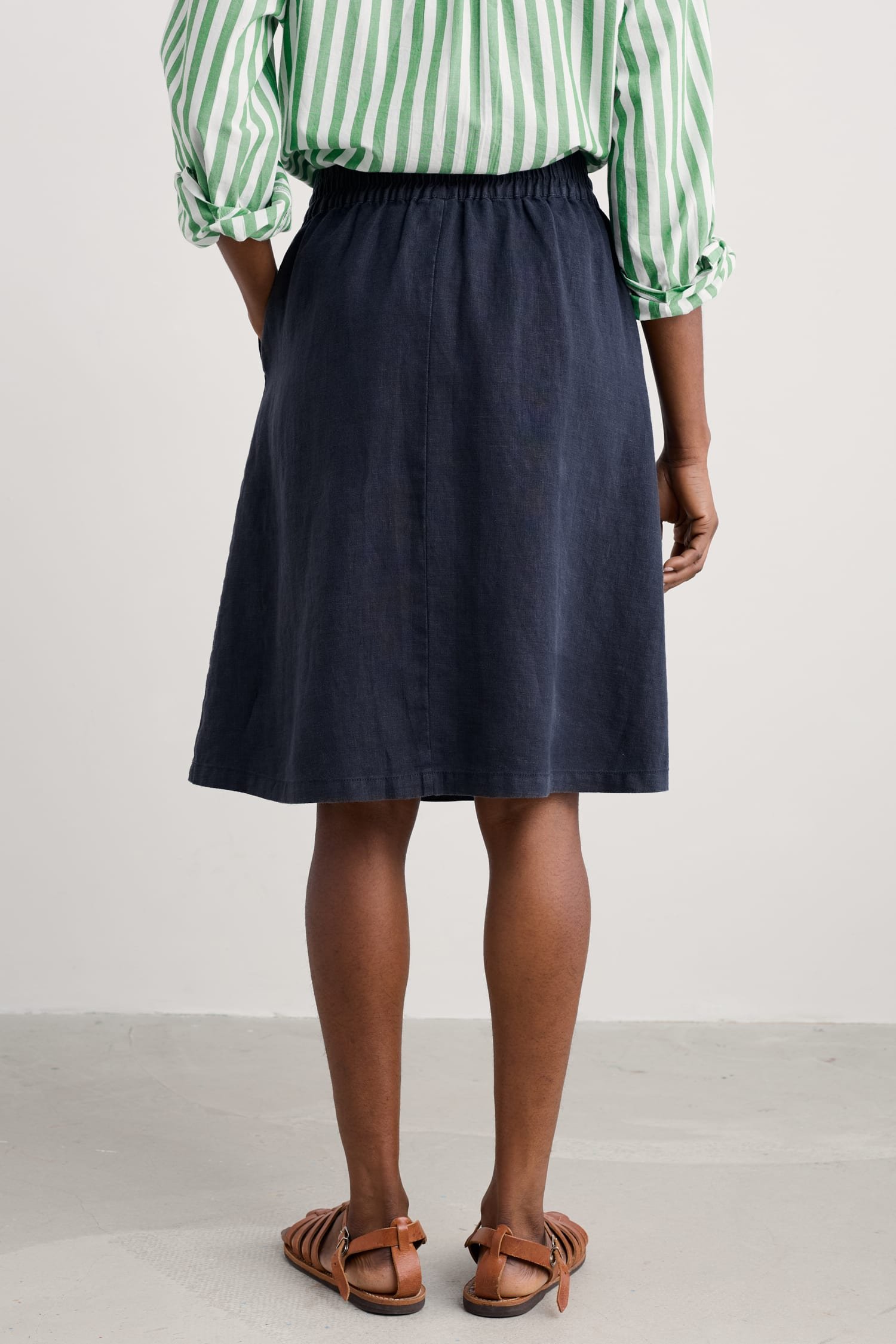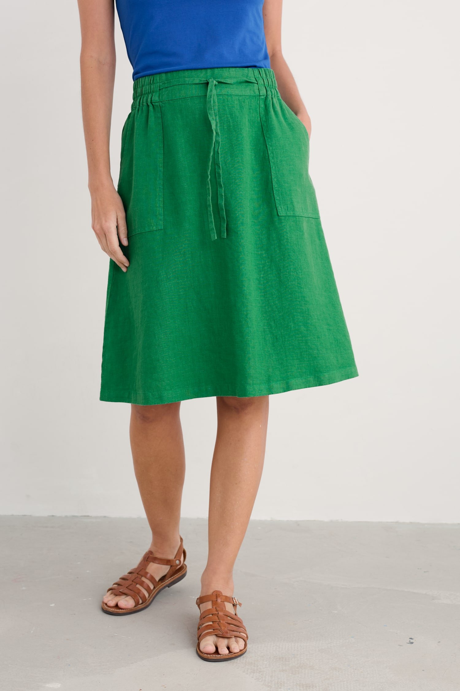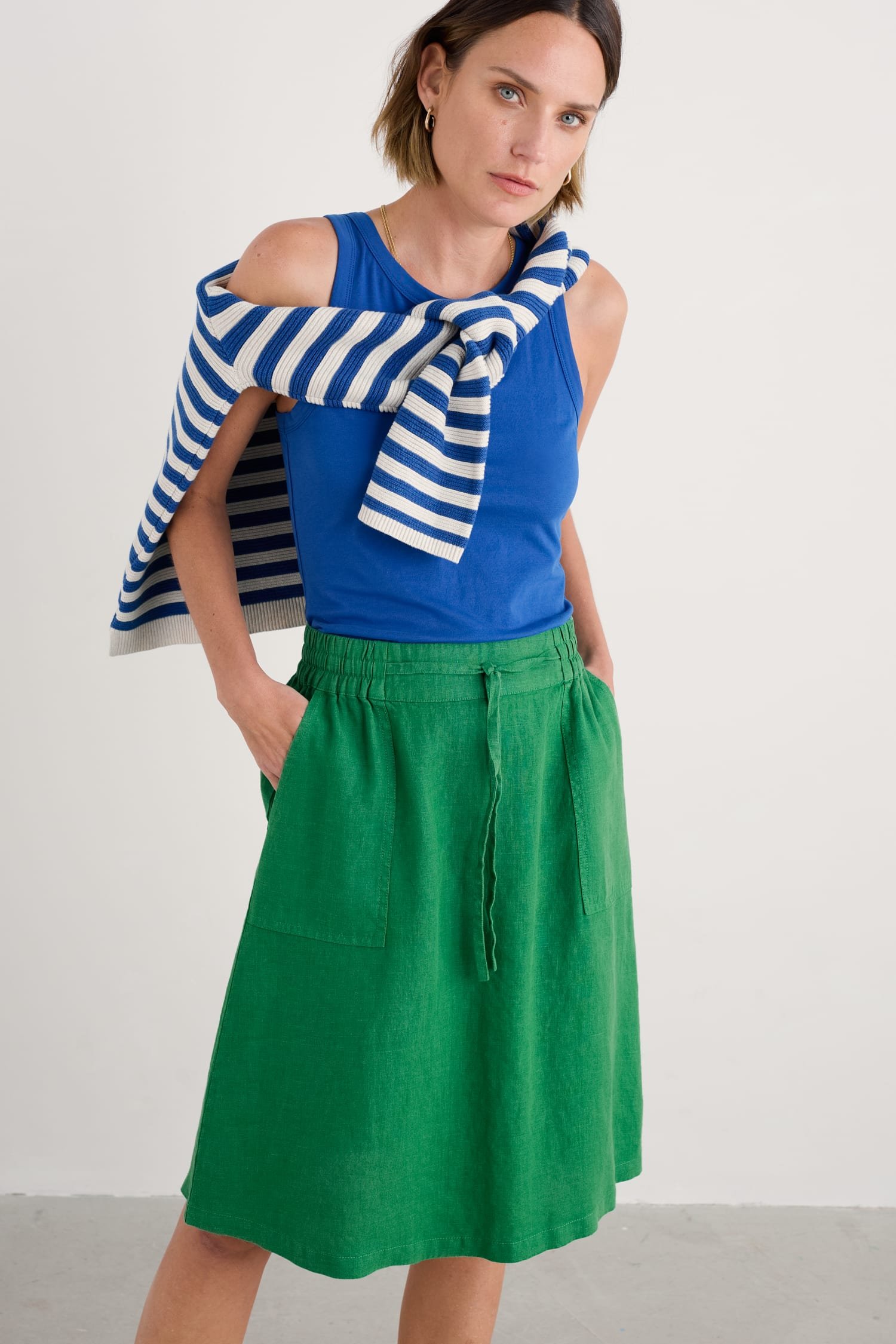 A light and airy knee length linen skirt with a comfortable elasticated waistband and large patch pockets. Available in a collection of garment-dyed shades with a naturally lived in look that gets better with every wear.