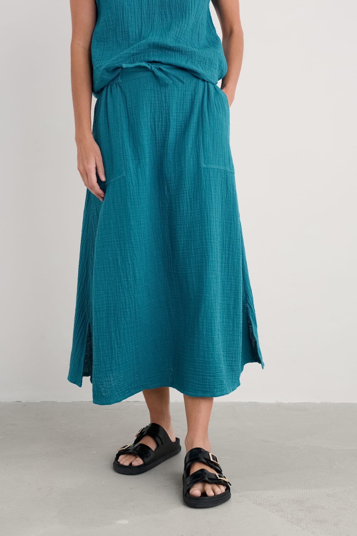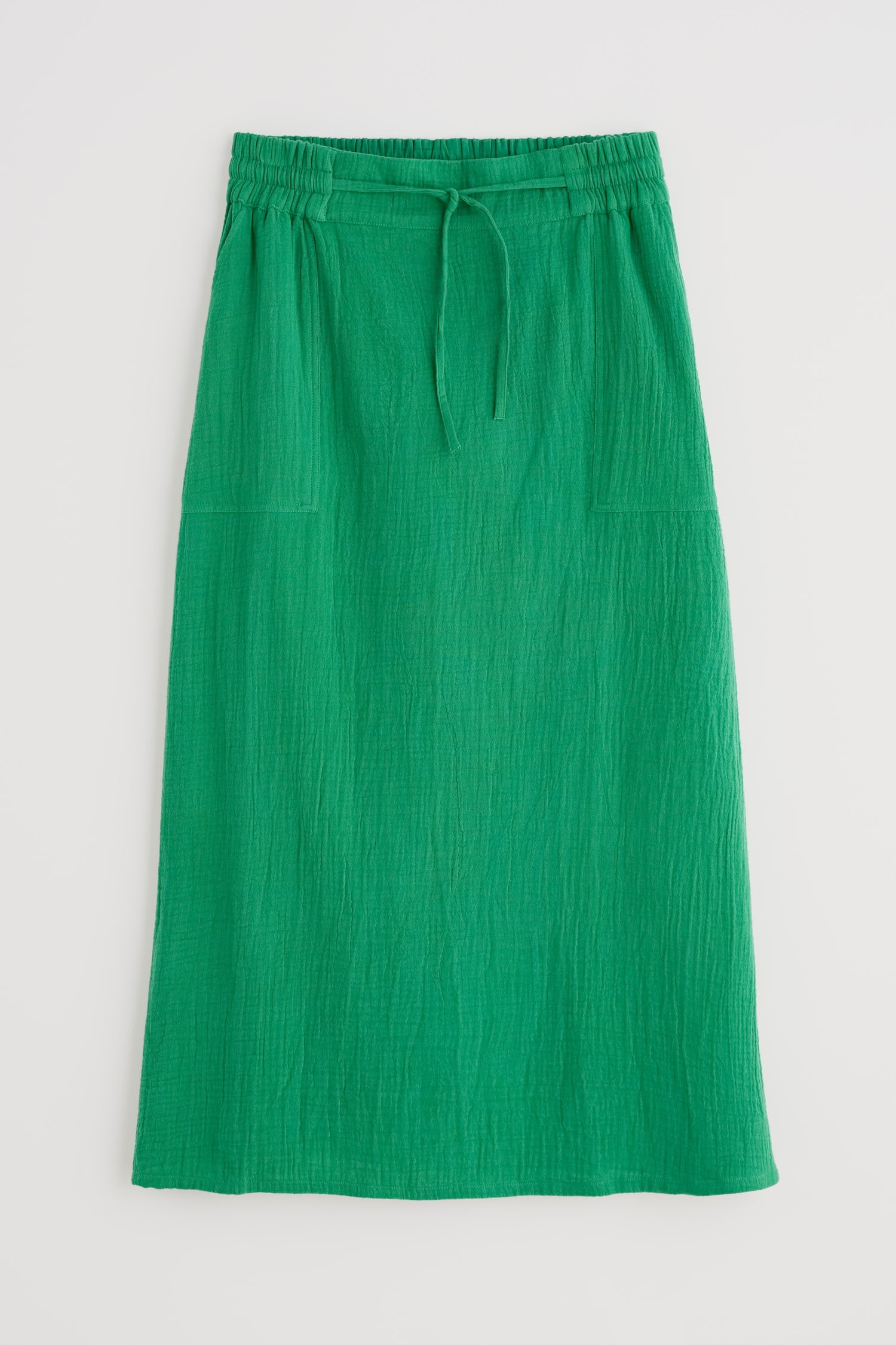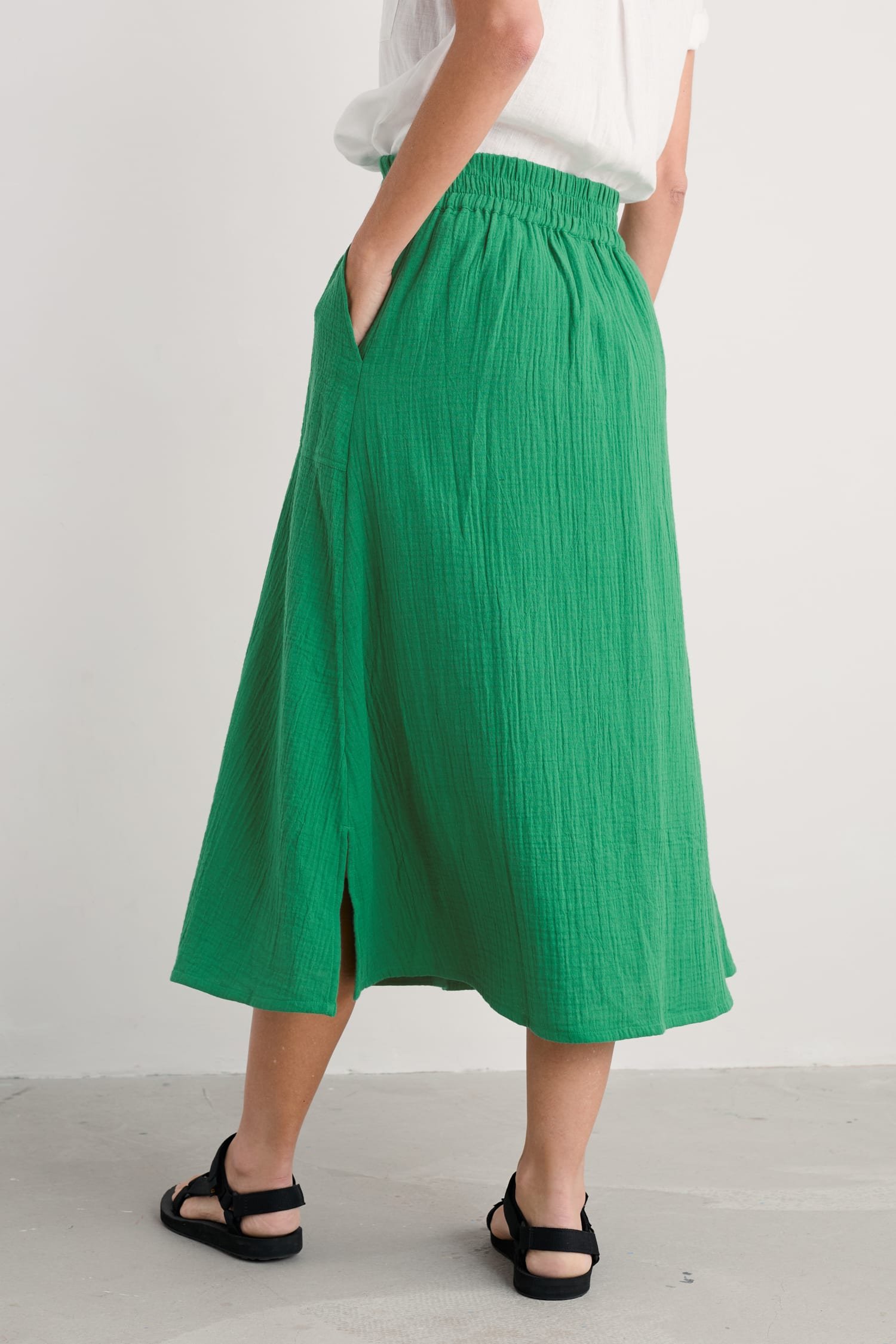 Lightweight, loose and airy, the ankle length Bee Orchid Skirt is the perfect summer skirt. Made with organic cotton, the skirt has a relaxed straight fit with side slits at the hem for added movement. The deep waistband is elasticated for comfort, with an adjustable drawstring to get just the right fit. Finished with deep patch pockets.