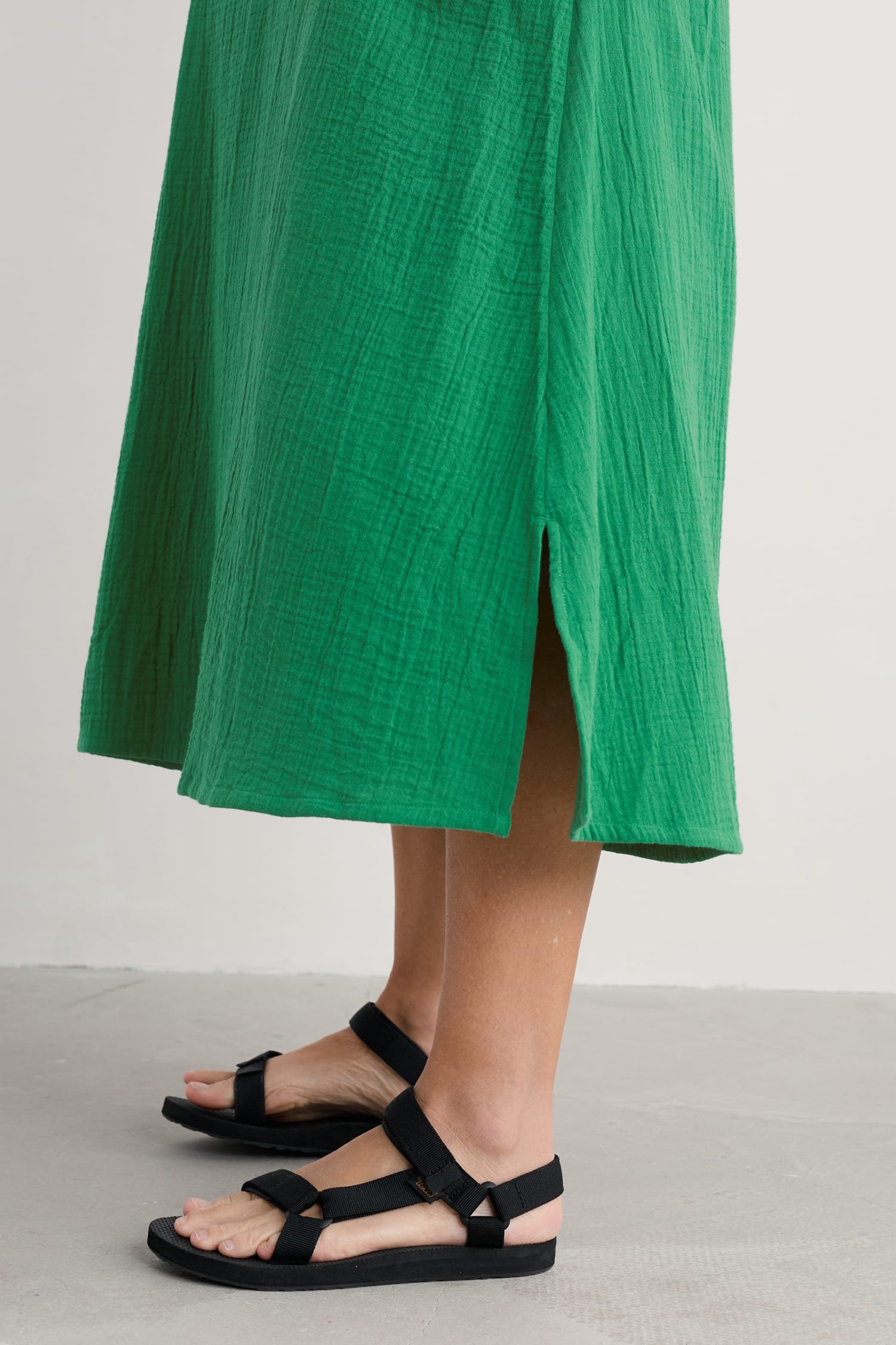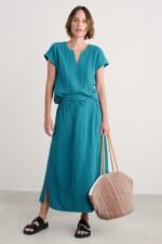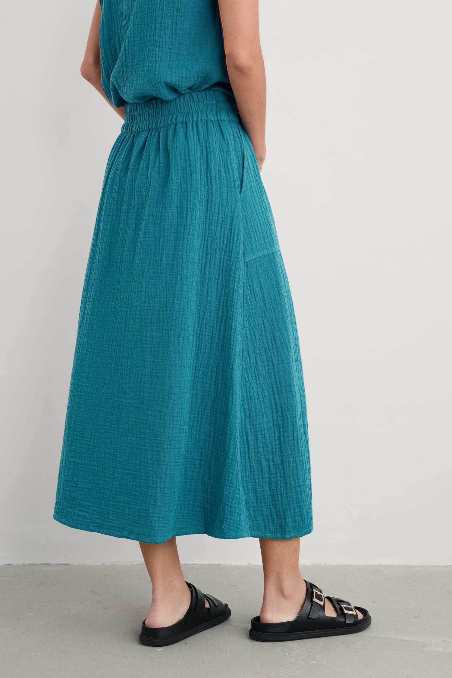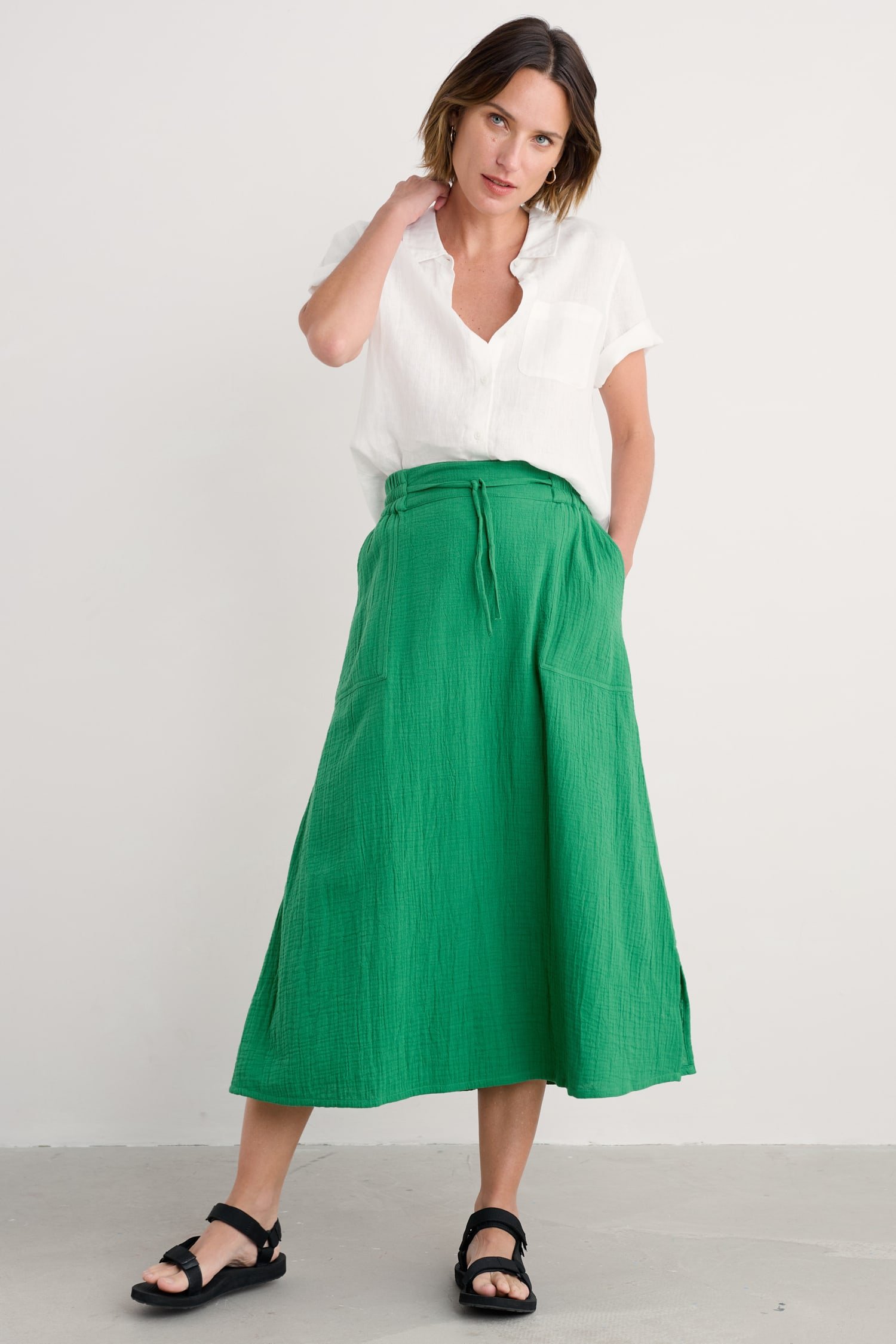Lightweight, loose and airy, the ankle length Bee Orchid Skirt is the perfect summer skirt. Made with organic cotton, the skirt has a relaxed straight fit with side slits at the hem for added movement. The deep waistband is elasticated for comfort, with an adjustable drawstring to get just the right fit. Finished with deep patch pockets.