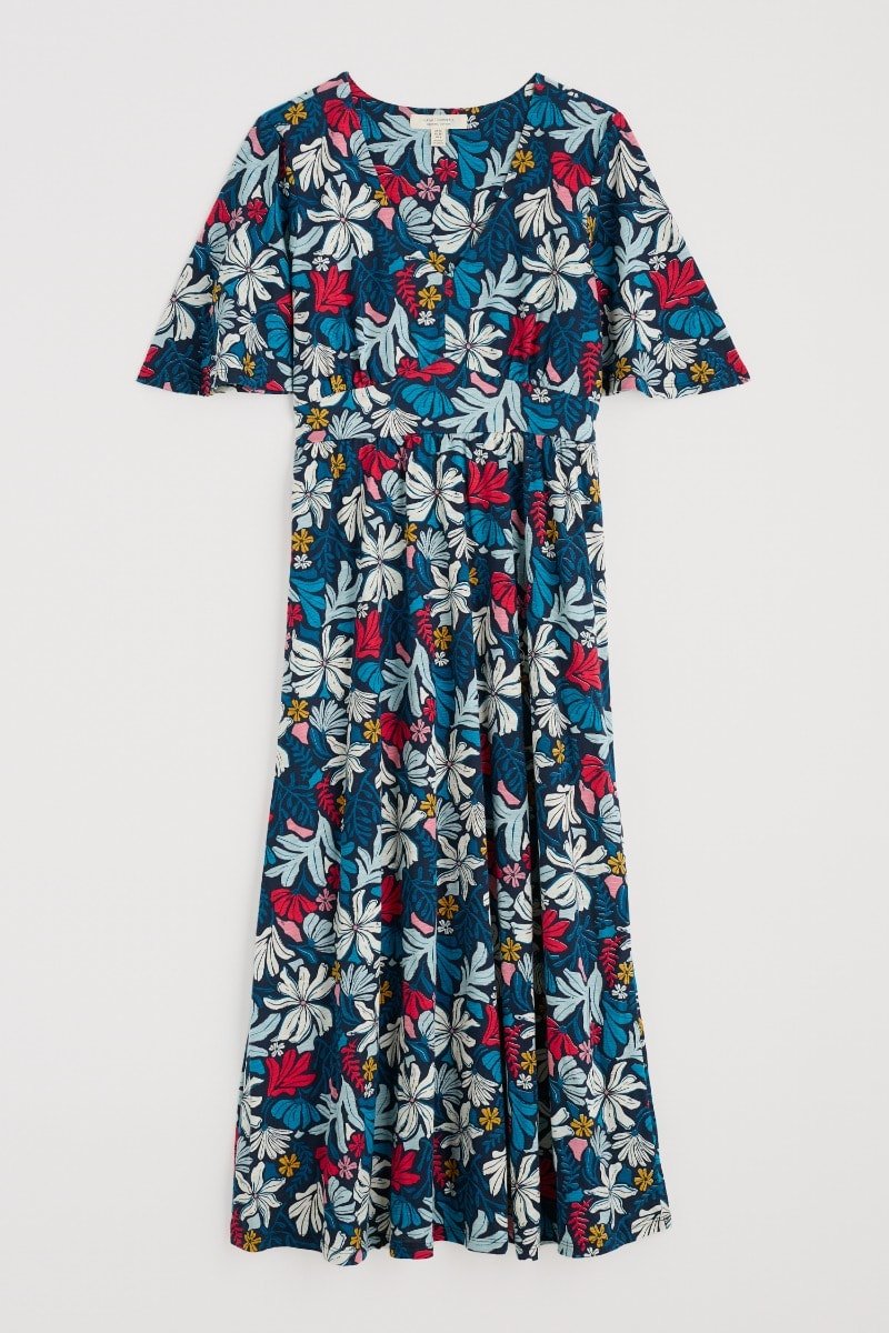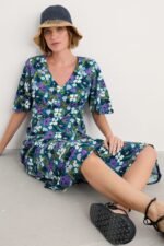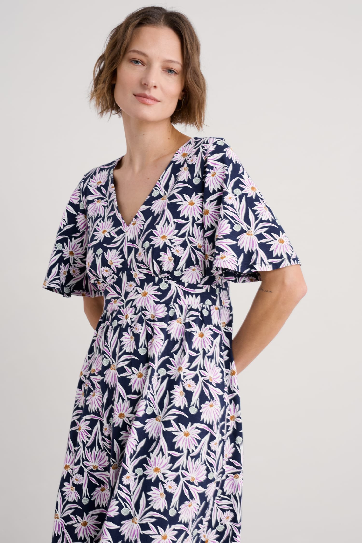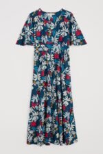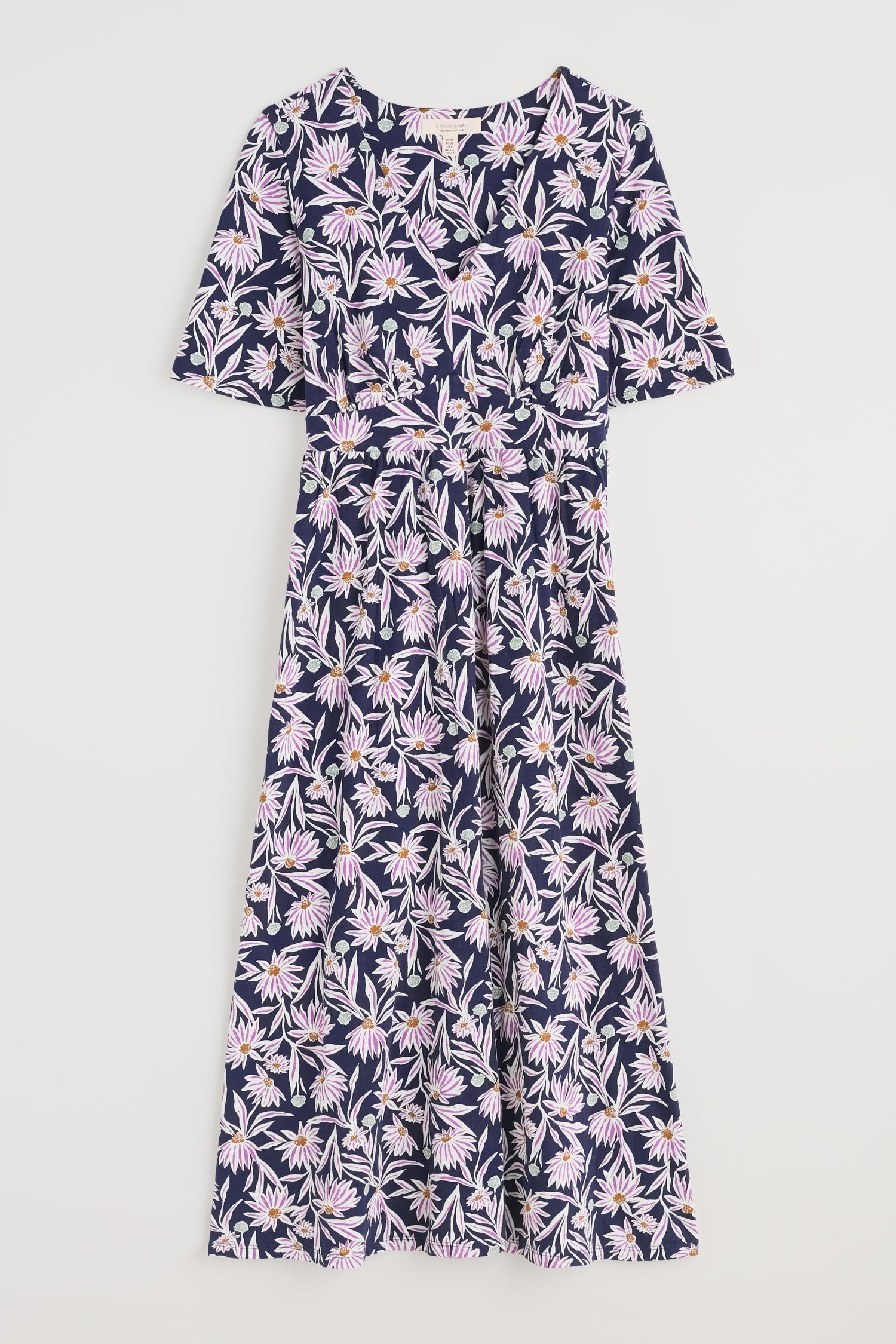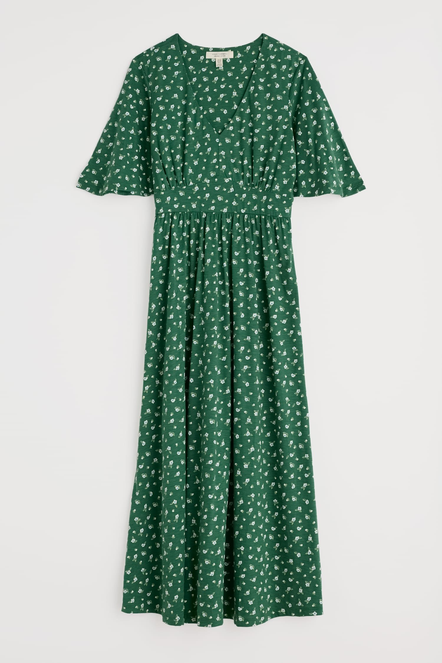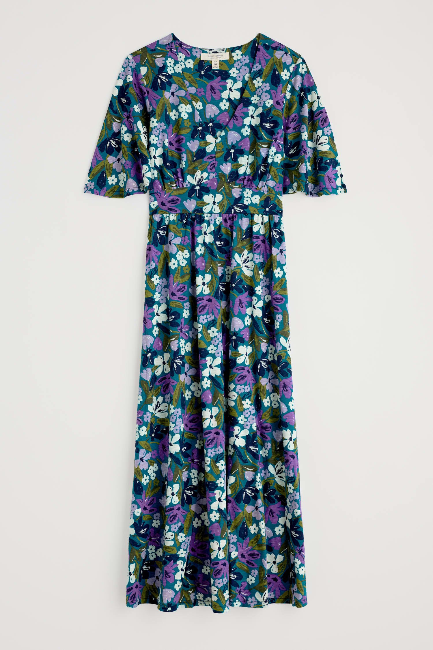 A vintage-inspired dress, made from beautifully soft organic cotton, with half angel sleeves and a deep V-neck. The empire line is enhanced by the panel under the bust, which leads into the flowing, above-ankle-length skirt.
