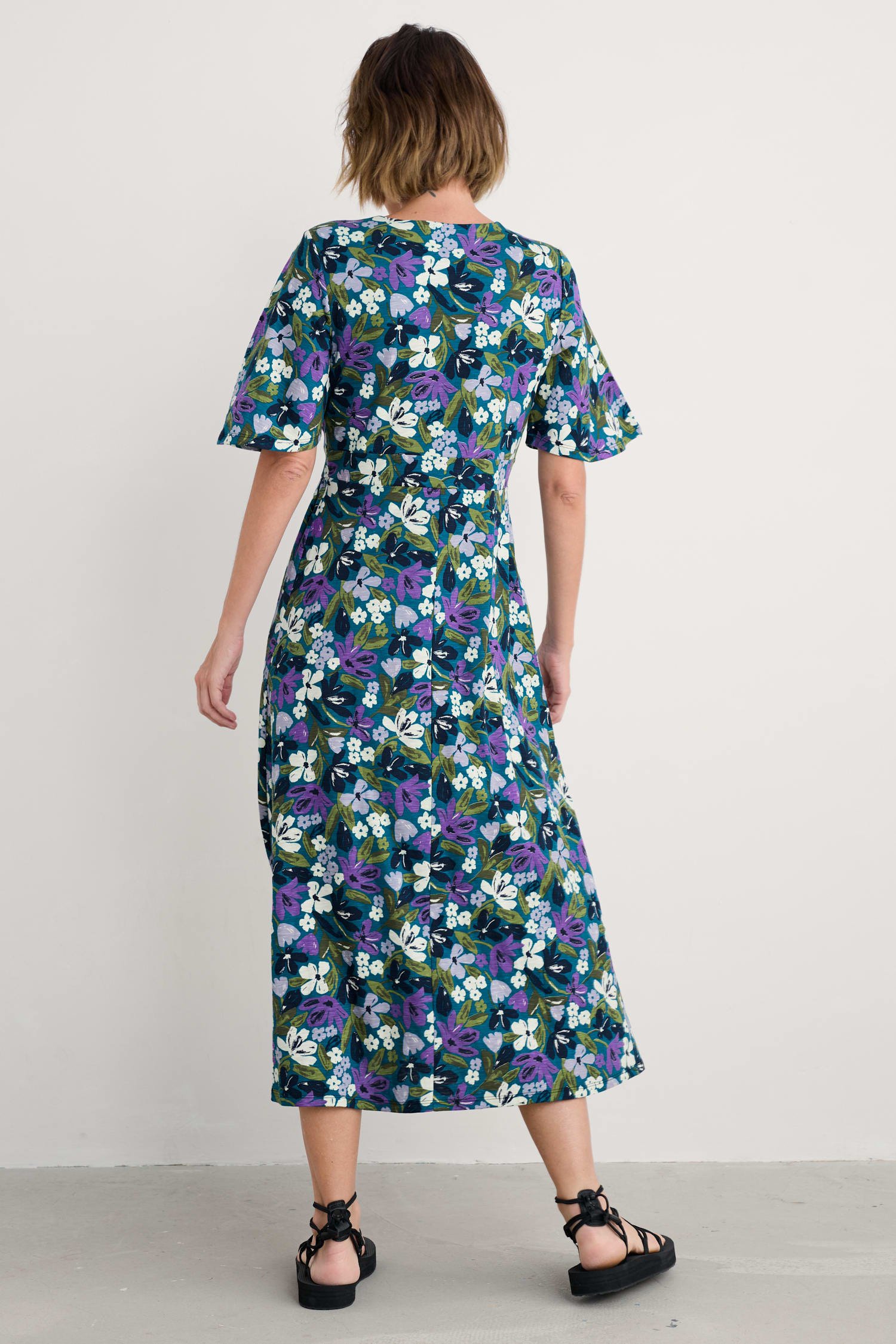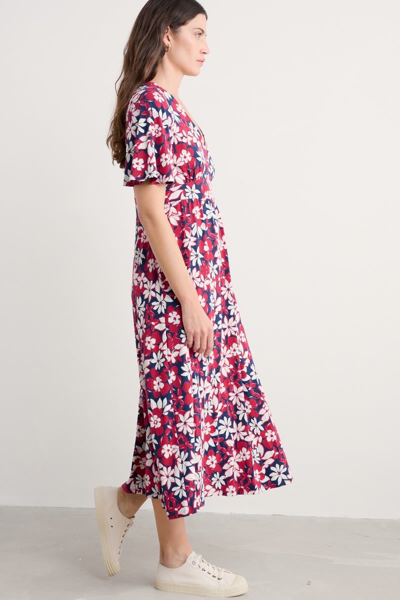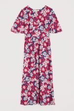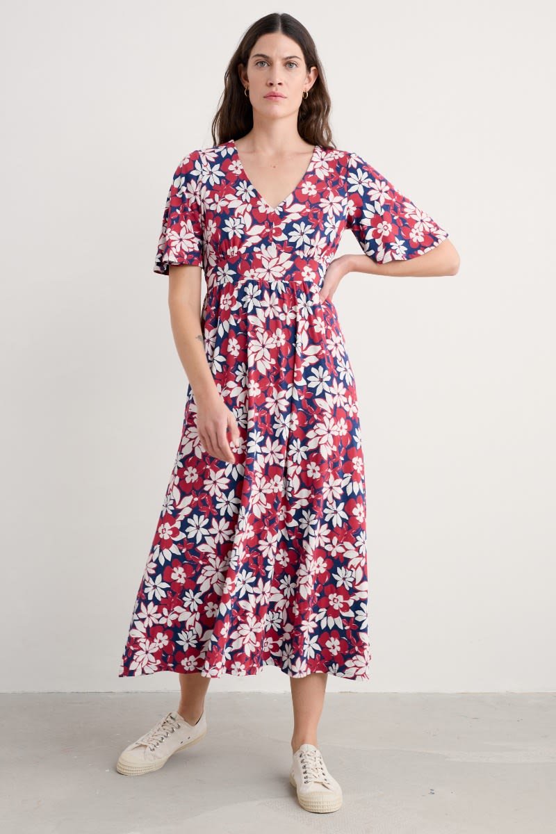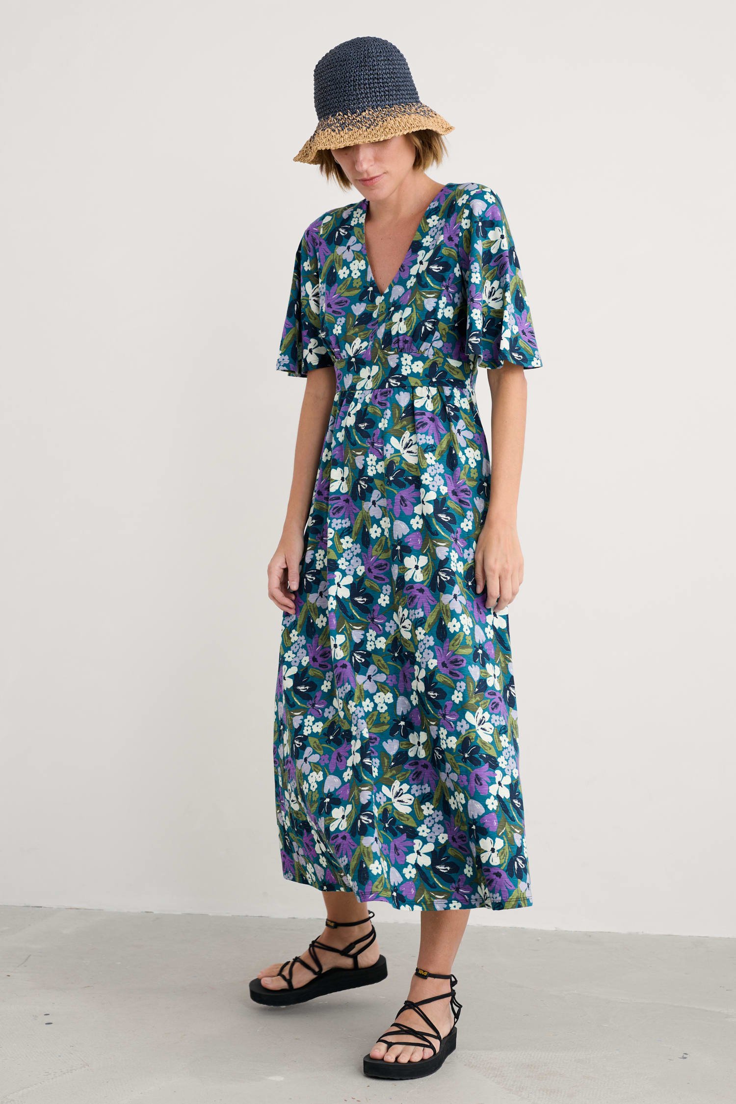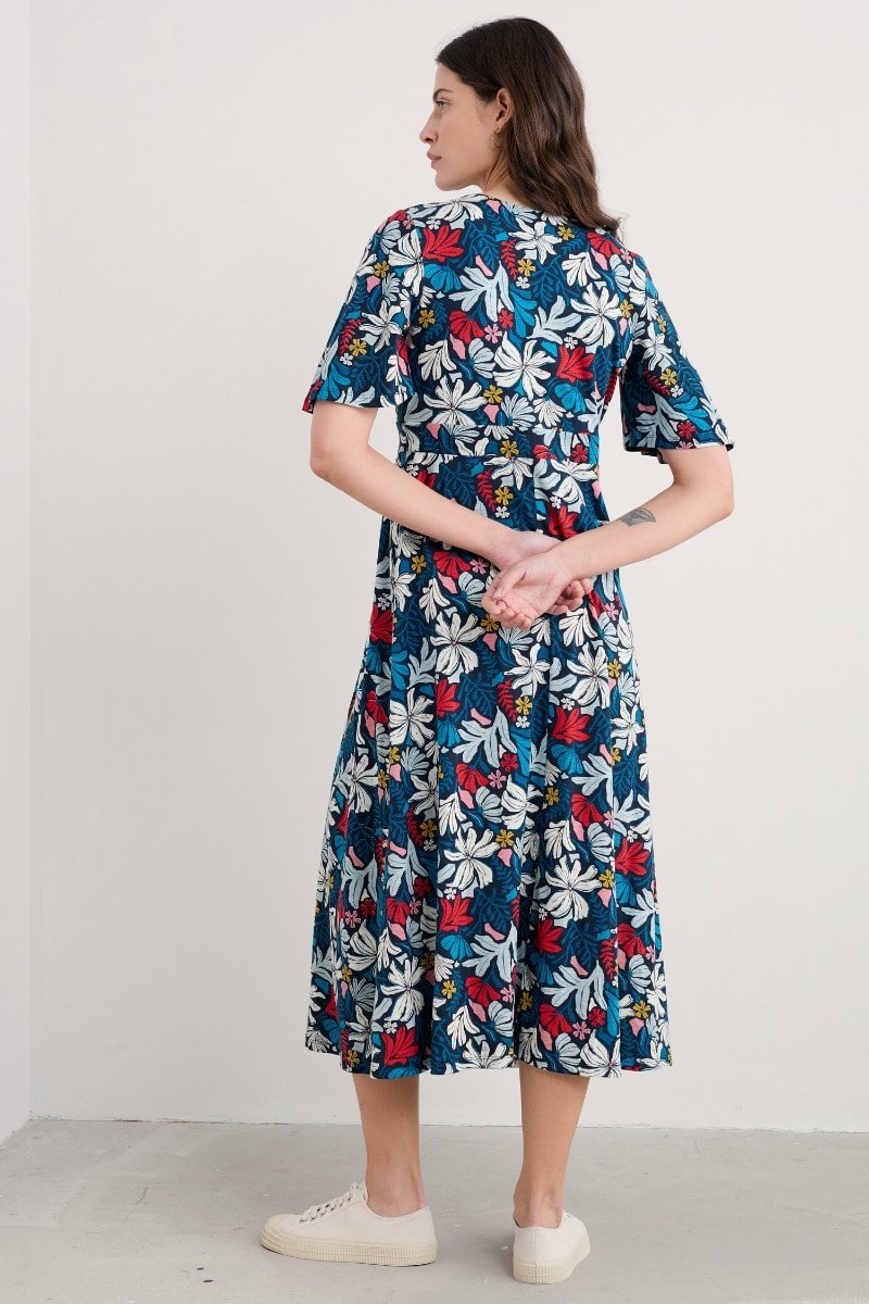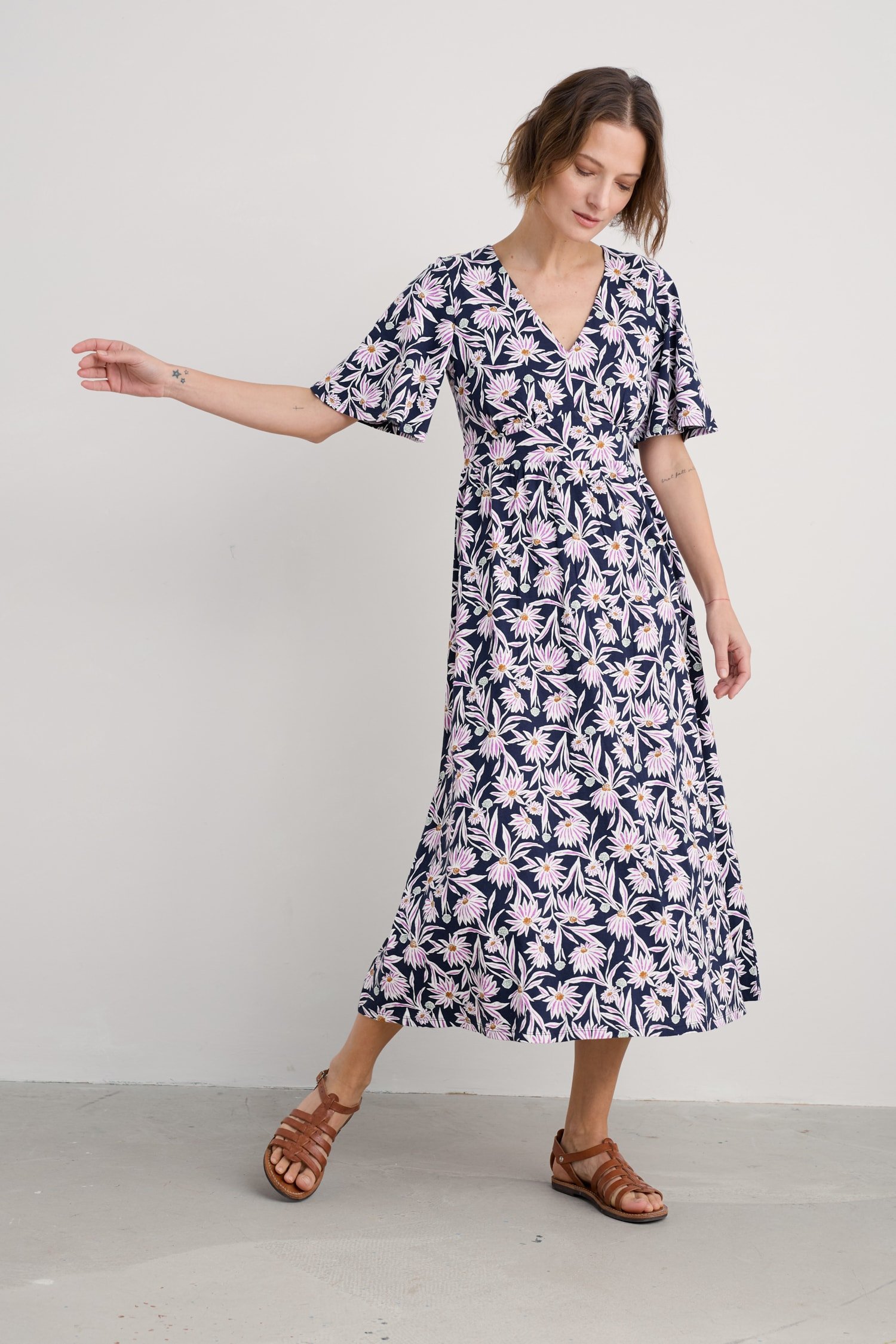 A vintage-inspired dress, made from beautifully soft organic cotton, with half angel sleeves and a deep V-neck. The empire line is enhanced by the panel under the bust, which leads into the flowing, above-ankle-length skirt.
