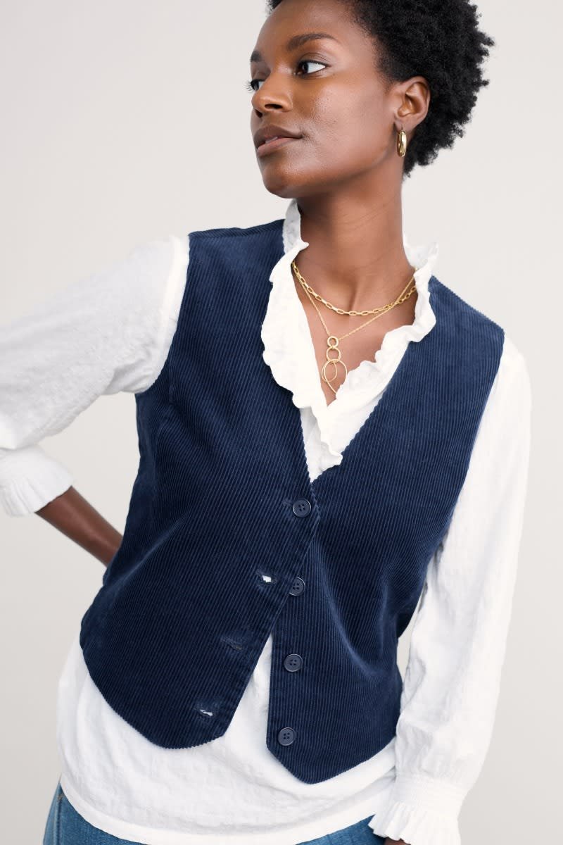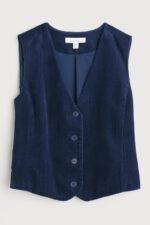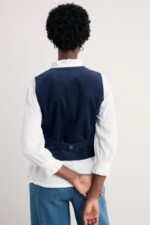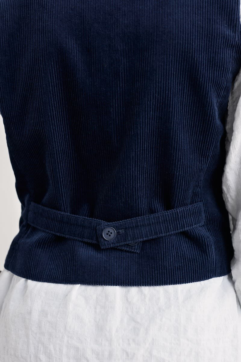 Our contemporary version of the classic waistcoat, crafted from soft organic cotton corduroy. Princess seams shape the waistcoat for a fitted outline, while its short length gives it a smart, tailored feel. We’ve taken time-honoured waistcoat details, such as the front button fastening and curved hem with side splits, and the adjustable self-fabric belt at the back. Wear it open over printed pieces or buttoned as a smart V-neck vest.