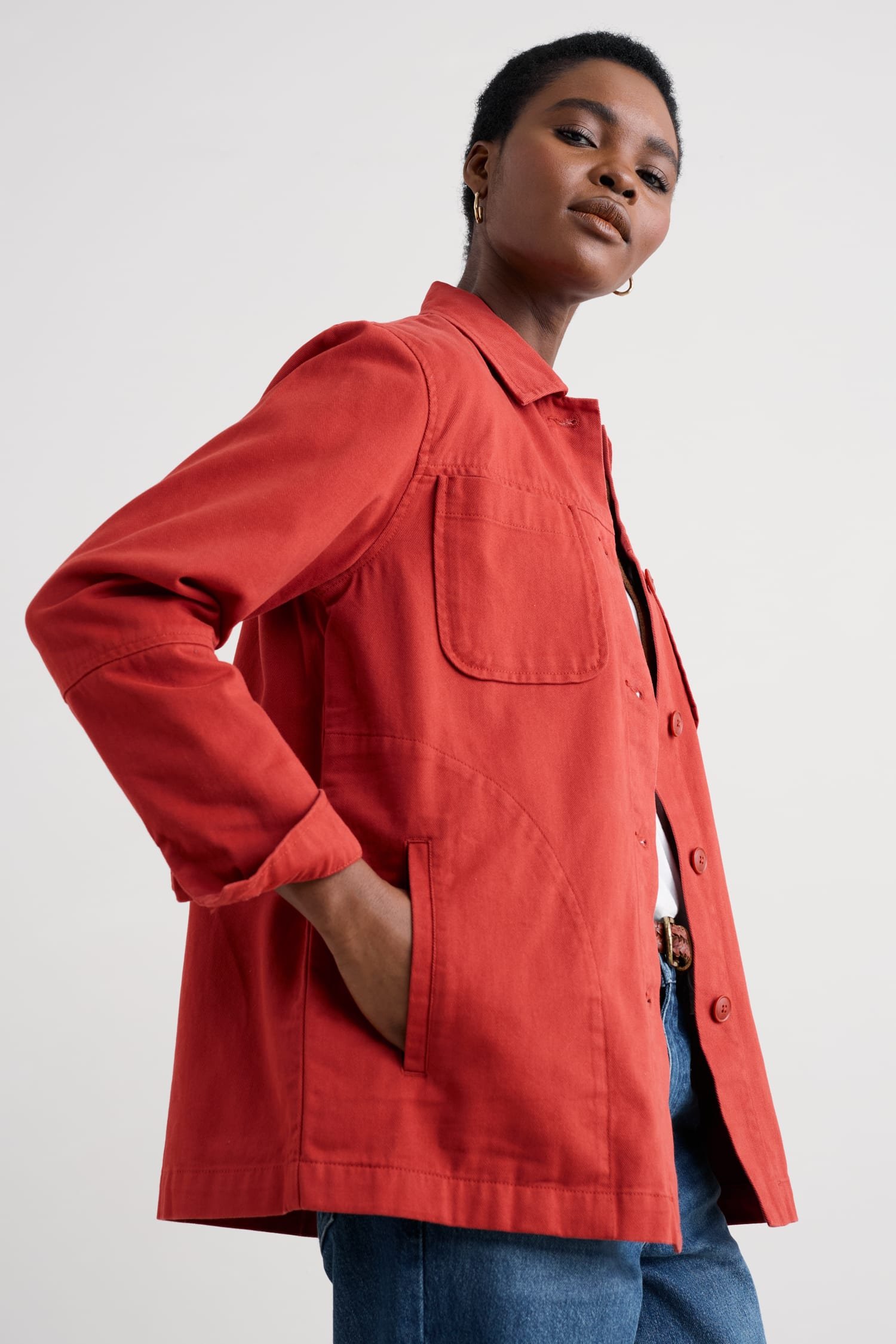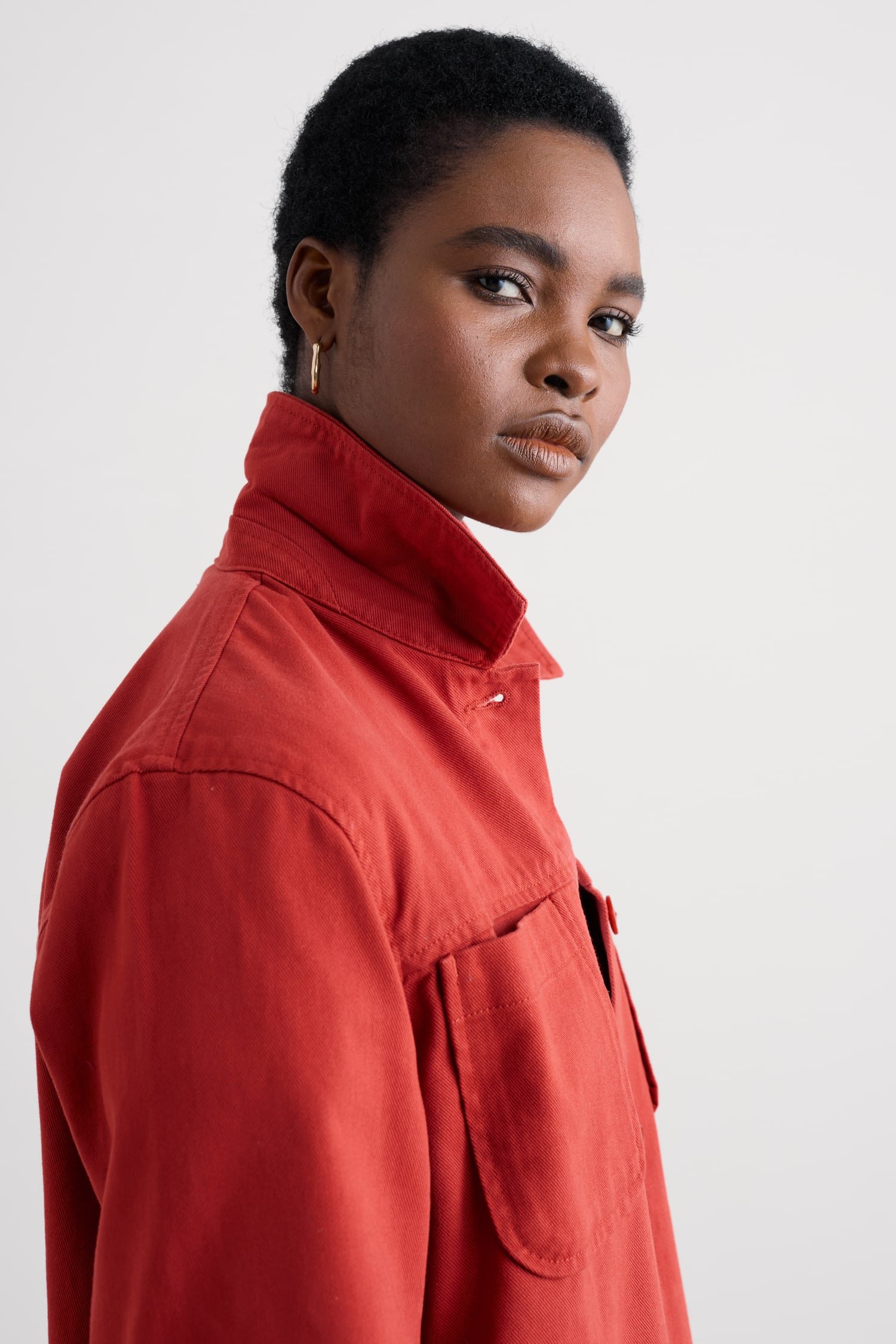 When you need a relaxed extra layer, reach for our oversized jacket, made from organic cotton twill. Inspired by traditional workwear, the thigh-length jacket has handy patch pockets, a collared neck and working cuffs. Dropped shoulders and soft blouson sleeves emphasise the casual feel, and details such as the mock-horn buttons and the self-fabric loop add thoughtful finishing touches.
