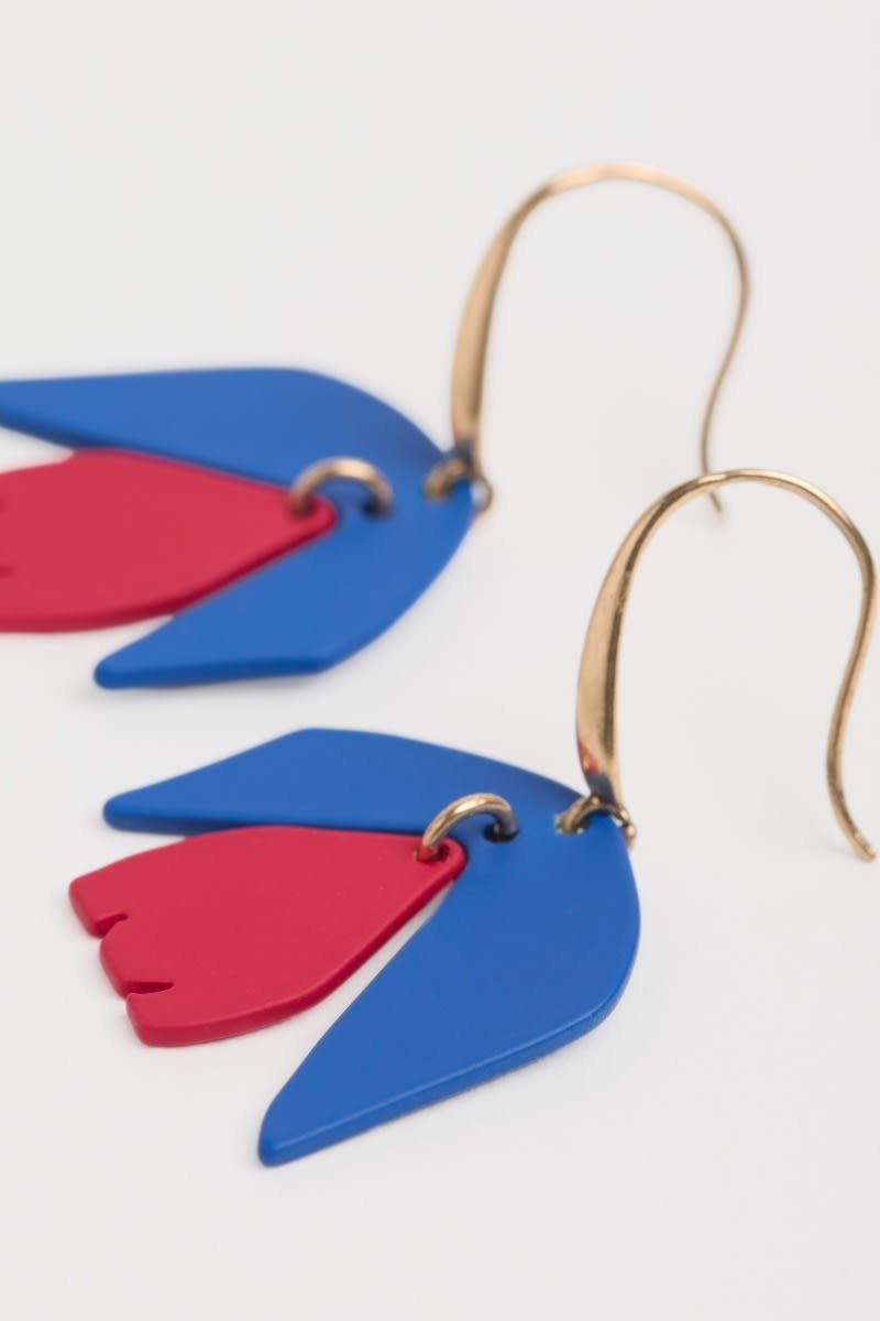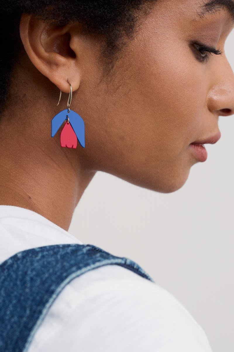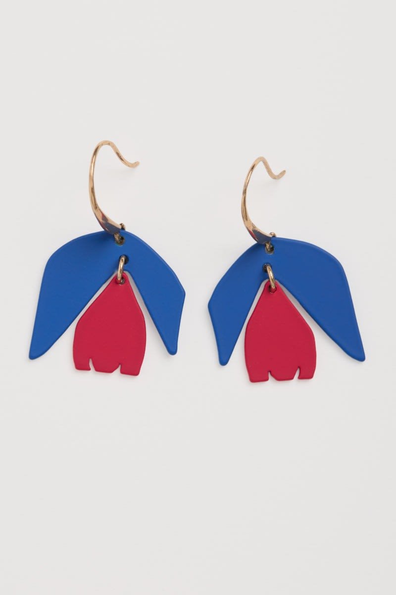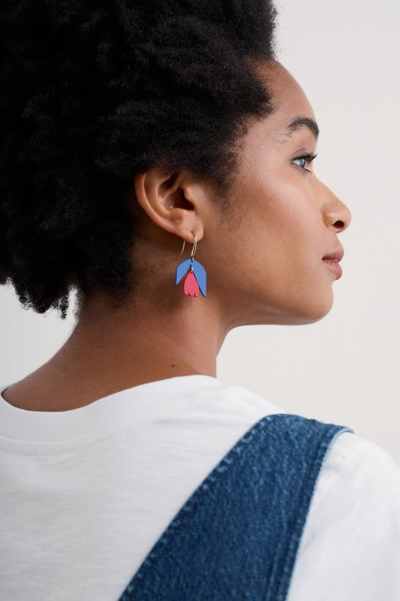 Bright and beautiful, these contemporary-style drop earrings are inspired by our own floral prints. The recycled brass is coated with smooth resin in eye-catching colours, complemented by the gleaming gold tones of the fastening. The petals are held together with rings, and sway gently when  when you move.