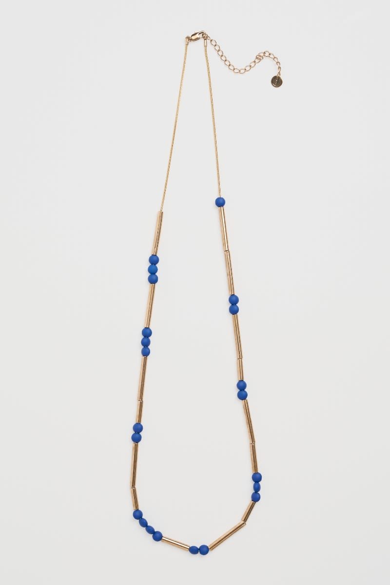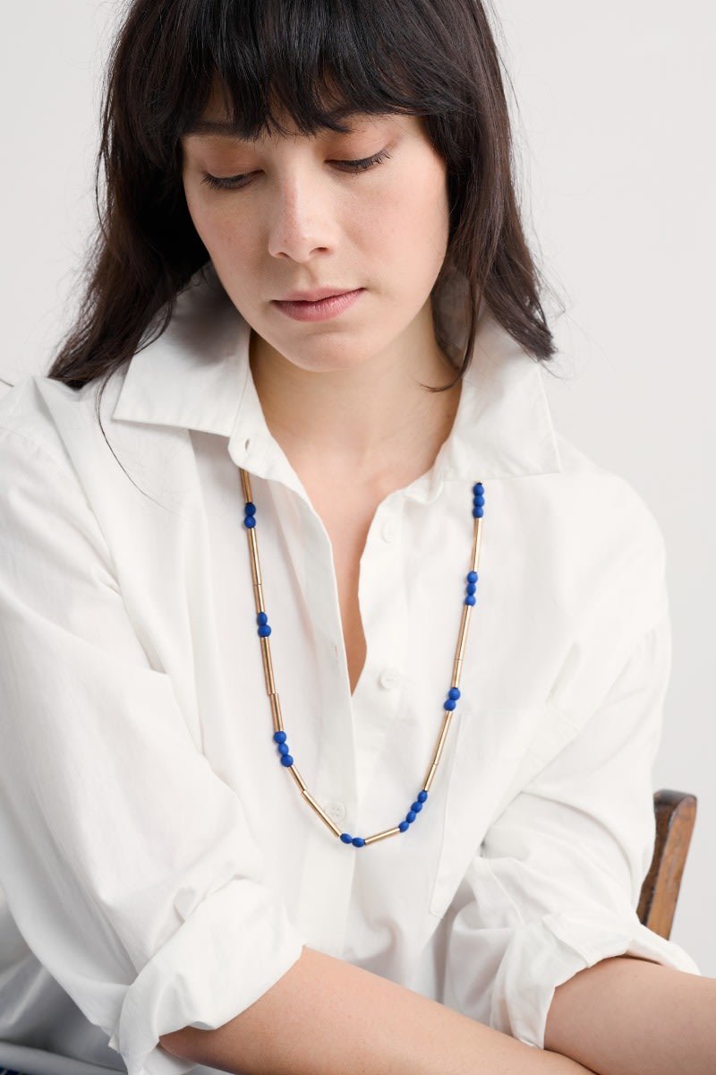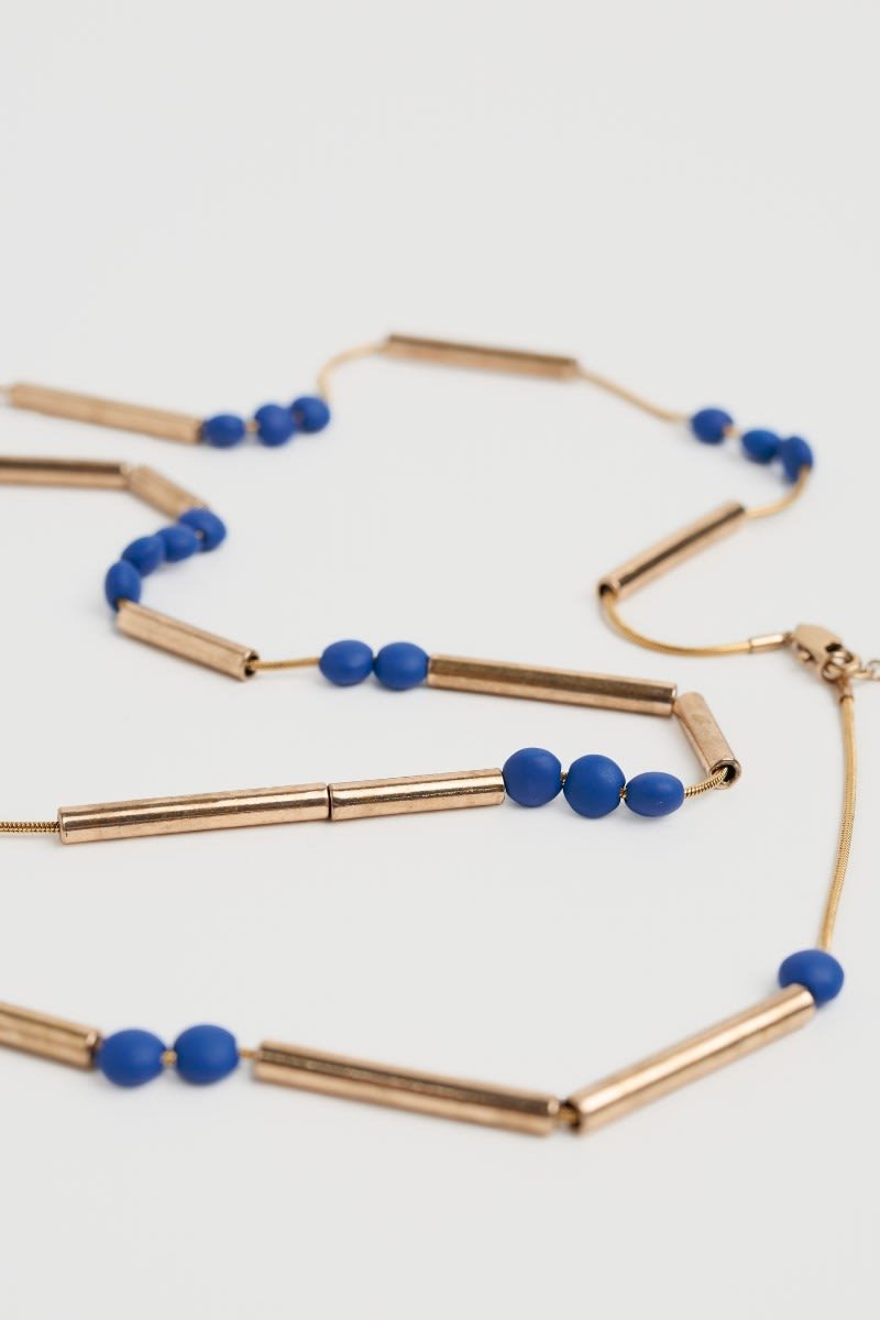 The warm gold tones of our Bowjey necklace contrast with the bright pops of colour from the beads. Its long and sleek design makes it an elegant way to complete your outfit, and you can adjust the length to best suit your style.
