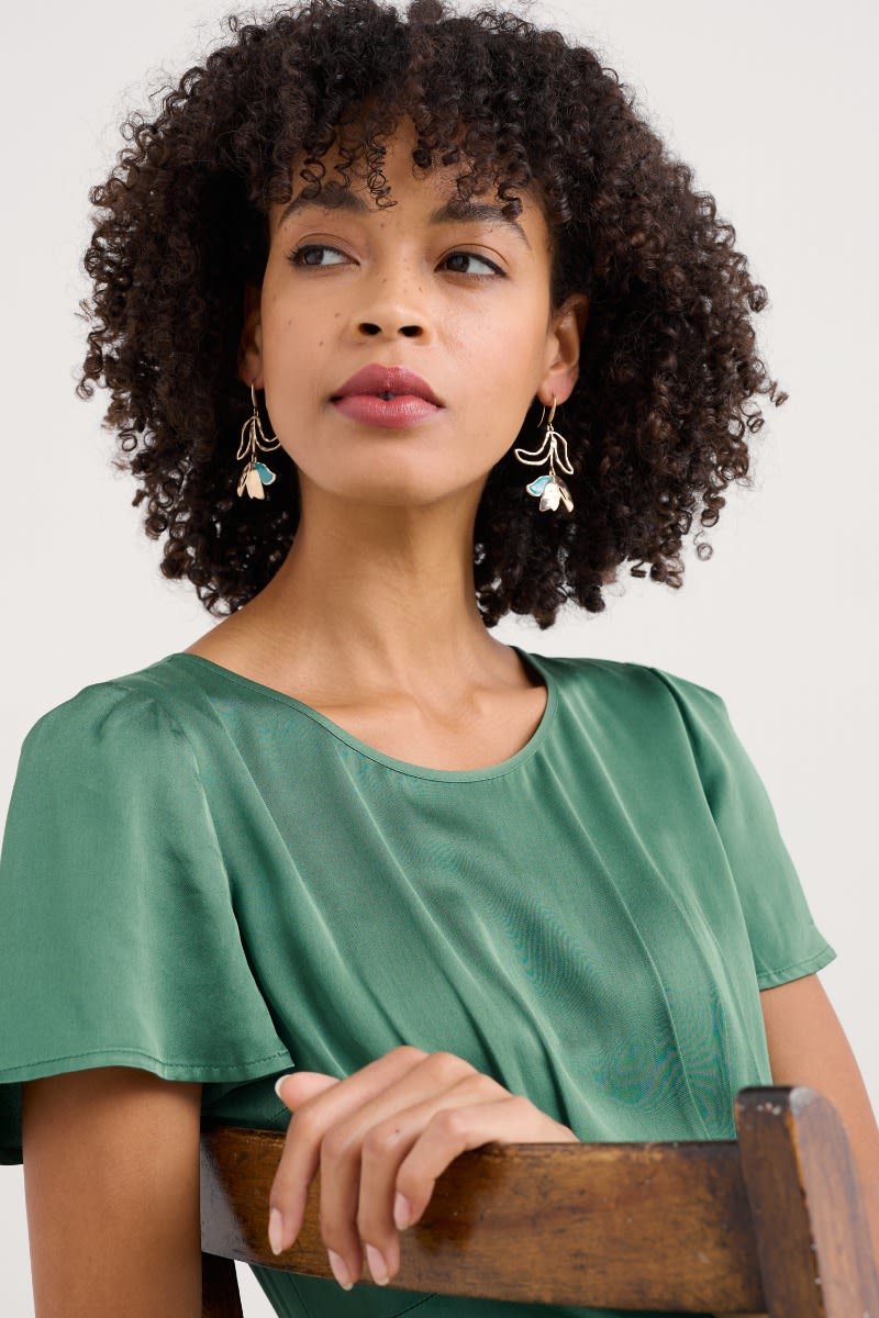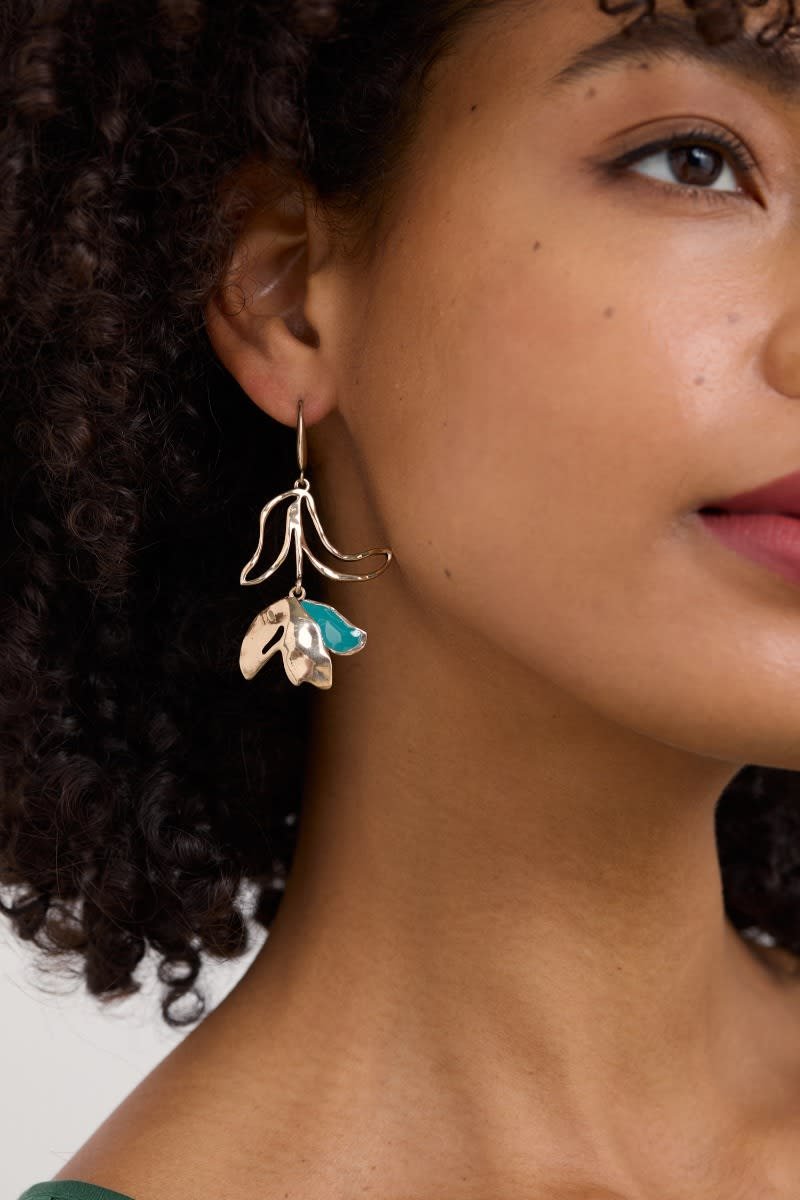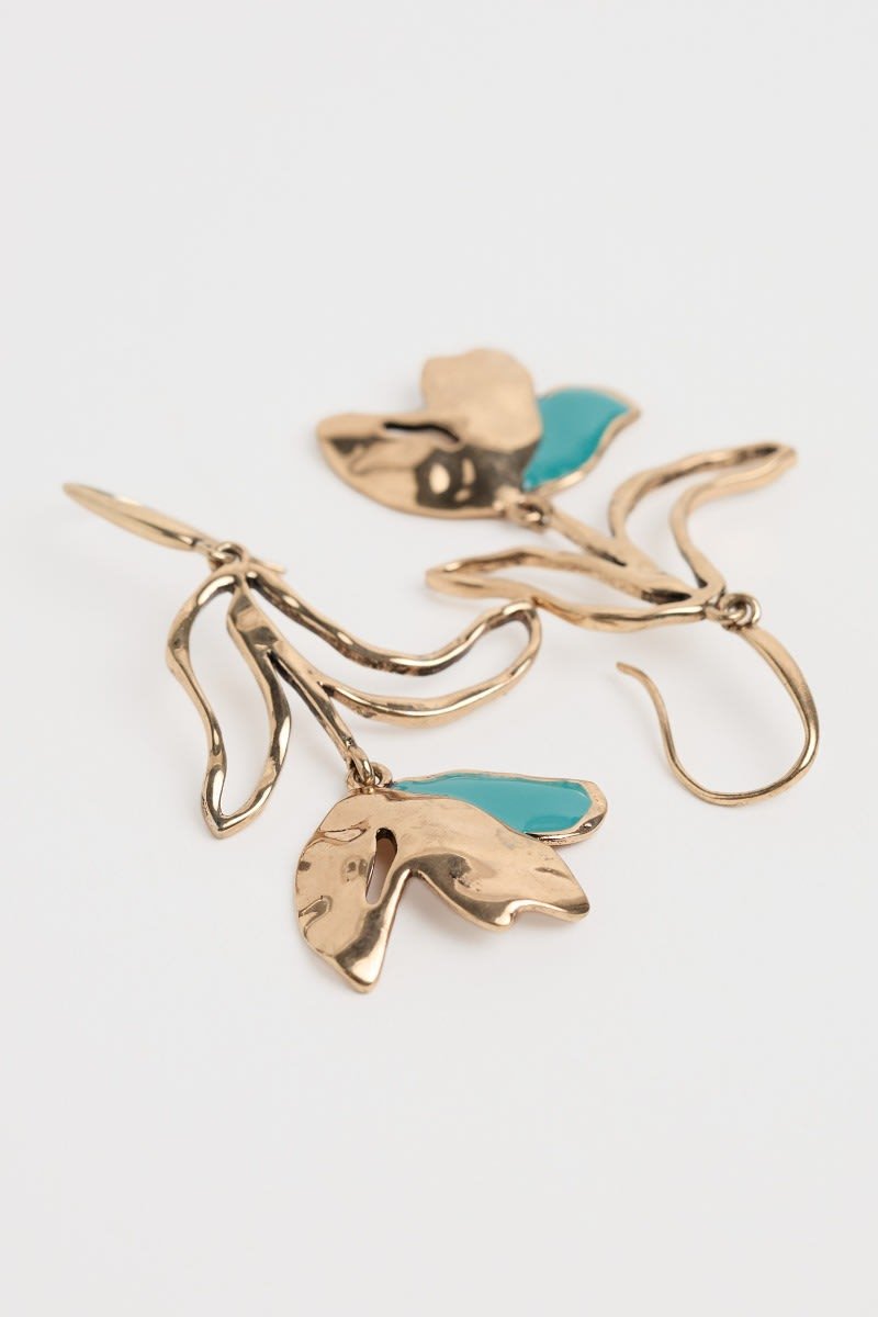 A contemporary take on classic floral earrings, with an antique gold-tone finish and a coloured resin detail. The flowers and leaves have a modern, organic feel, with a slightly textured finish that catches the light. The drop earrings hang elegantly from a comfortable hook fastening.