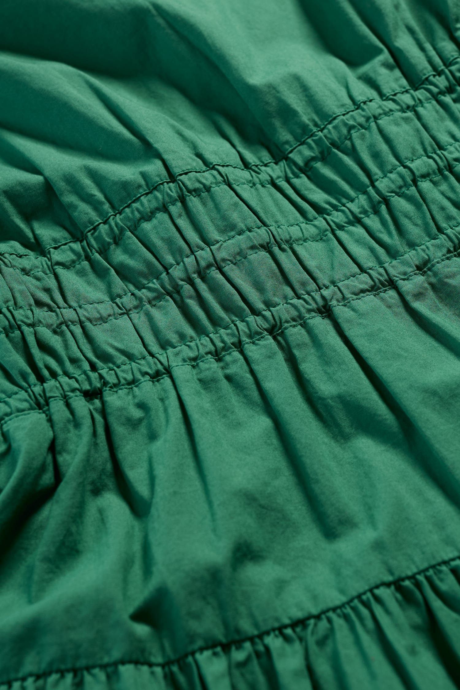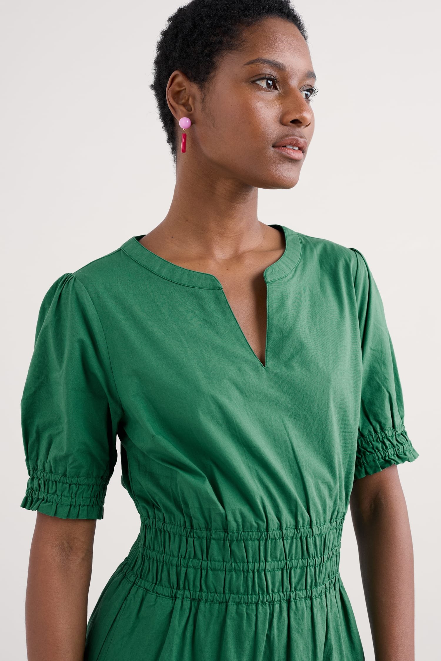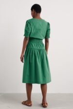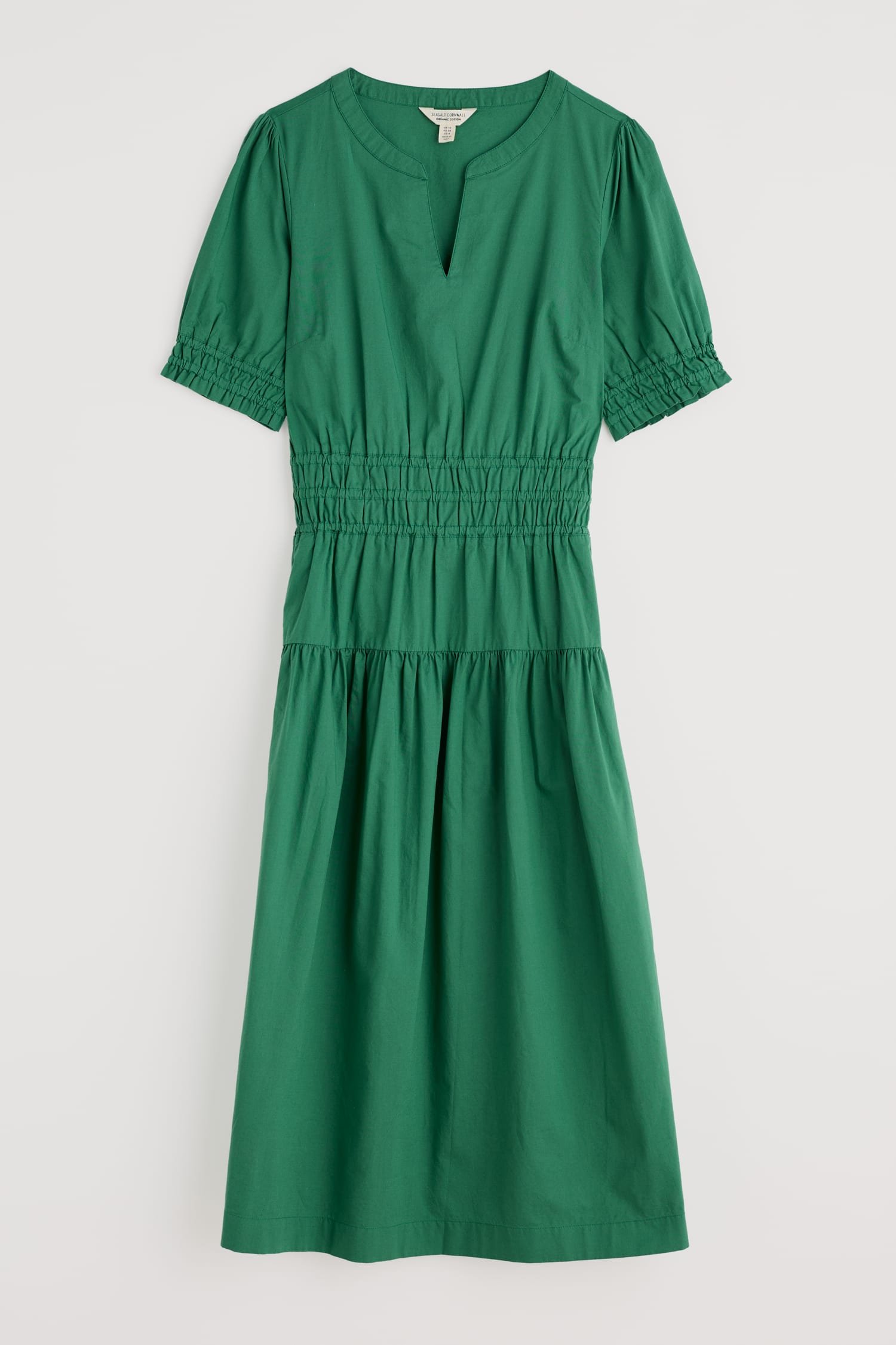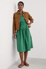 A smocked midi dress with a lovely vintage-inspired feel, crafted from GOTS-certified organic cotton. Shirring at the waist creates a classic shape, enhanced by the full A-line skirt with its deep tier, while soft gathers in the bodice add subtle volume. Frilled cuffs and a notched neckline add pretty extra details to this summery piece.