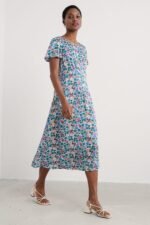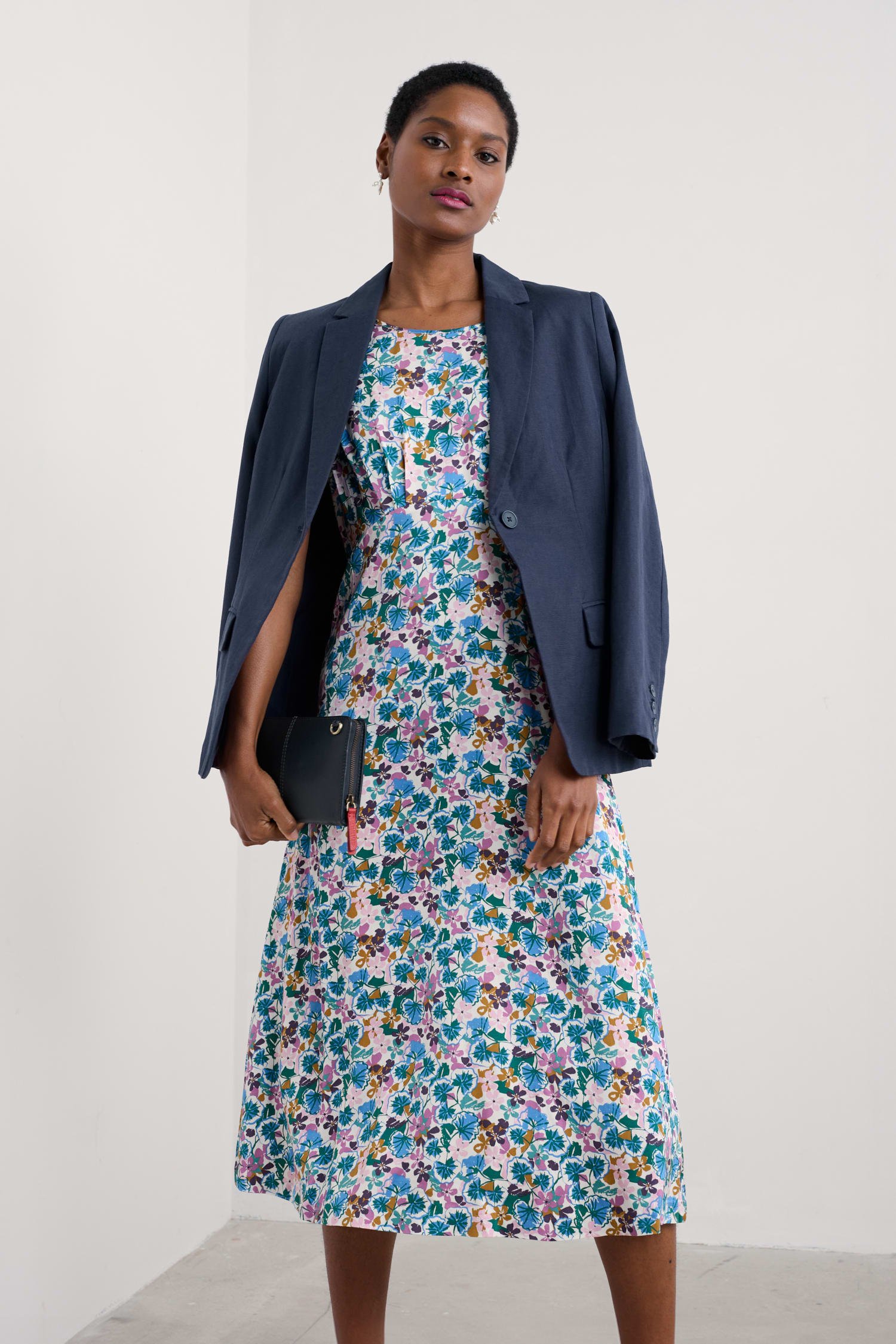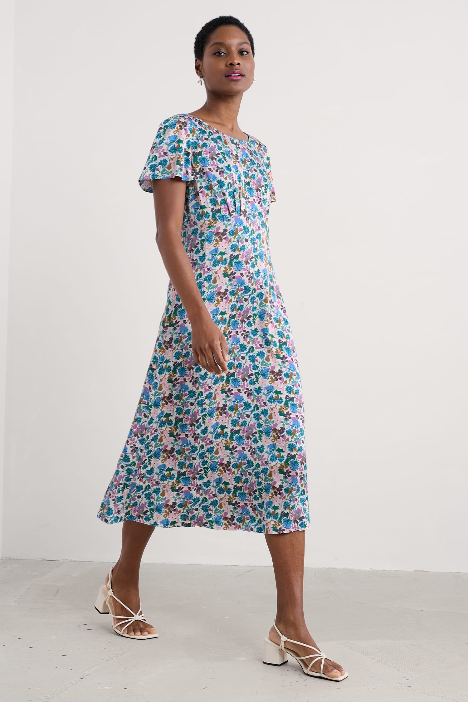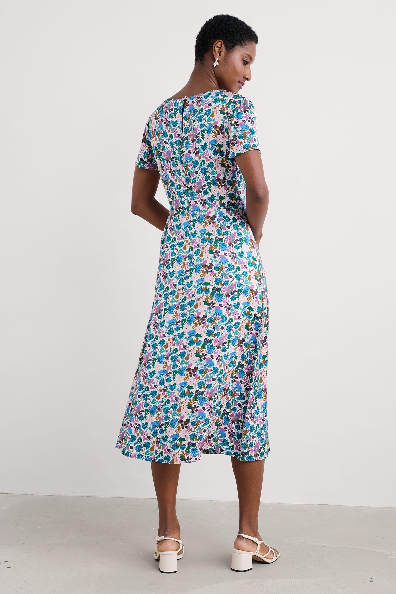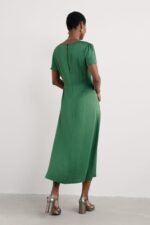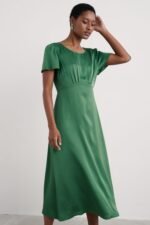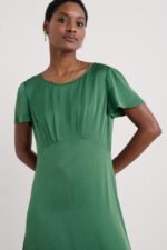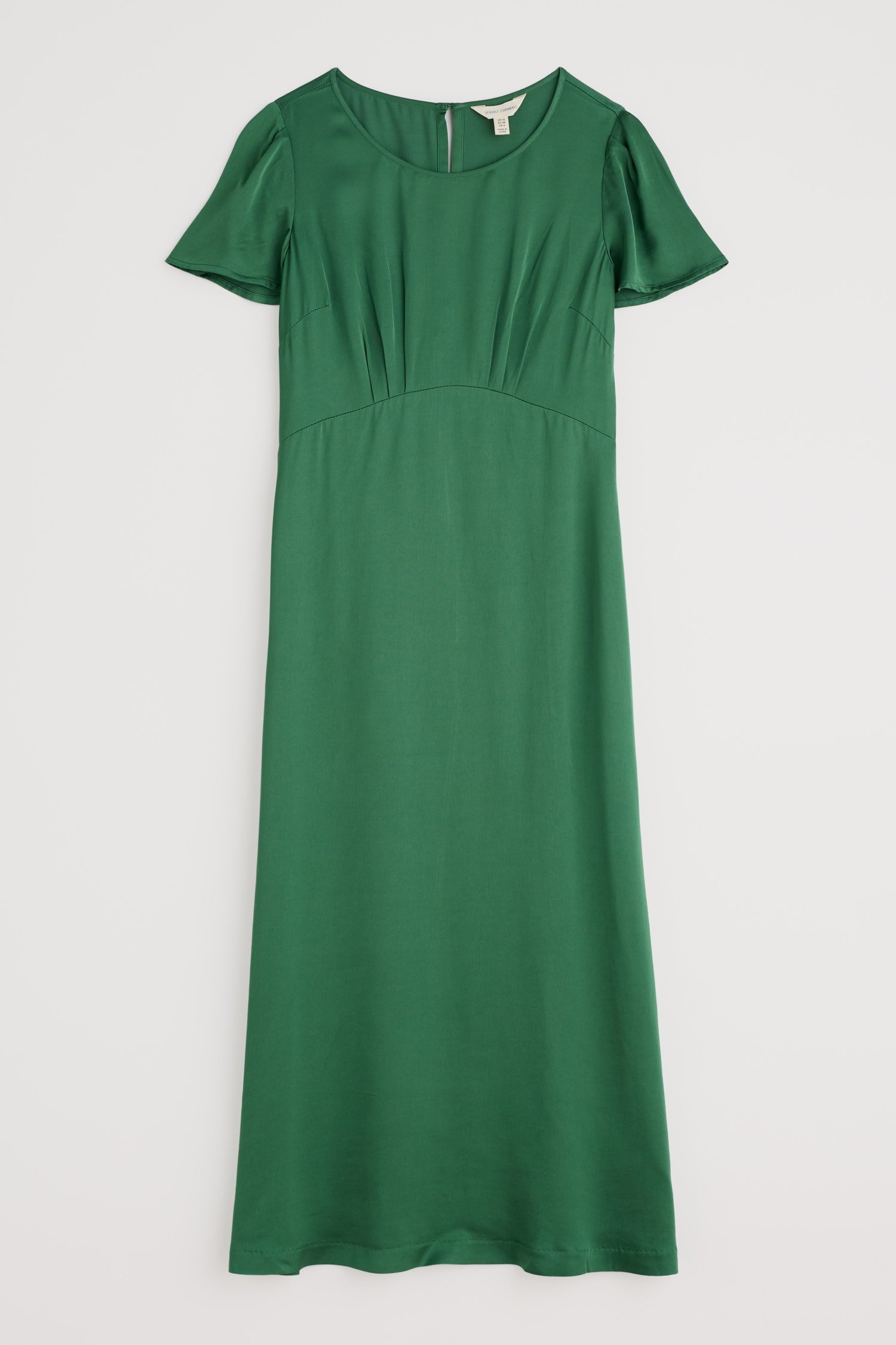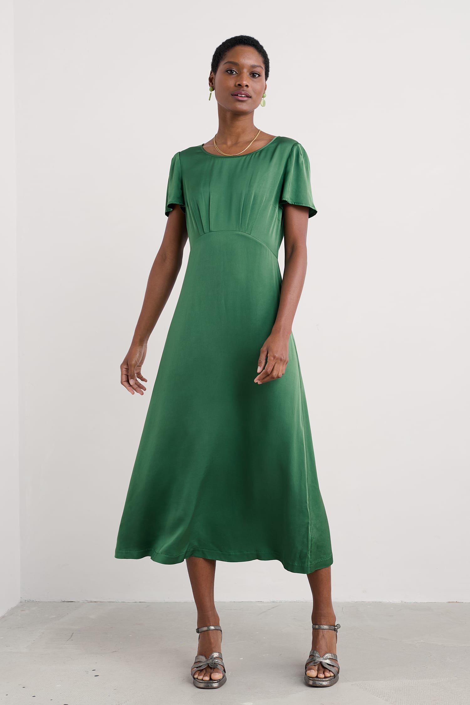 An empire line midi dress made from drapey satin. Its classic shape is emphasised by the curved waistband and darts at the bust and waist. Fluted short sleeves and a boat neckline help to keep the styling elegantly simple, while the keyhole and button at the back add a subtle extra detail.