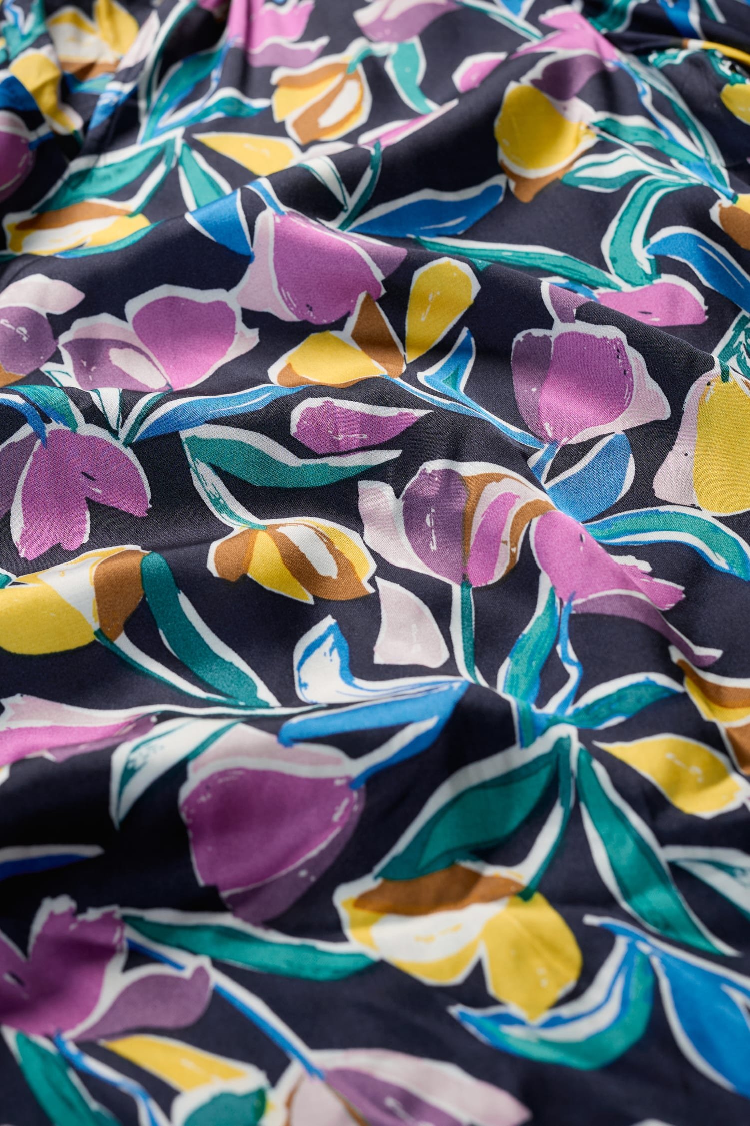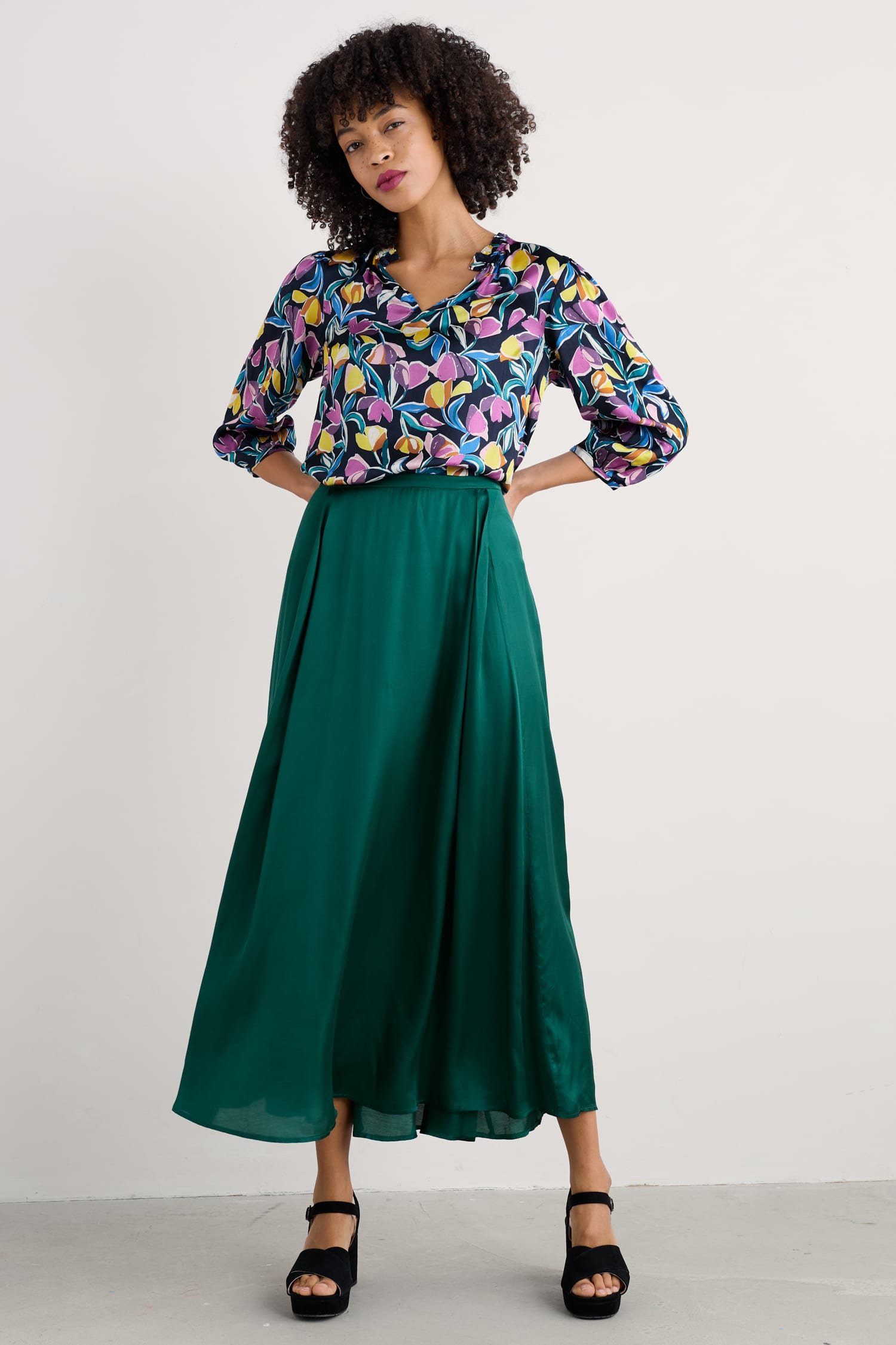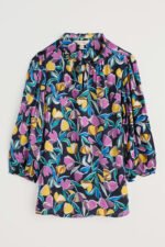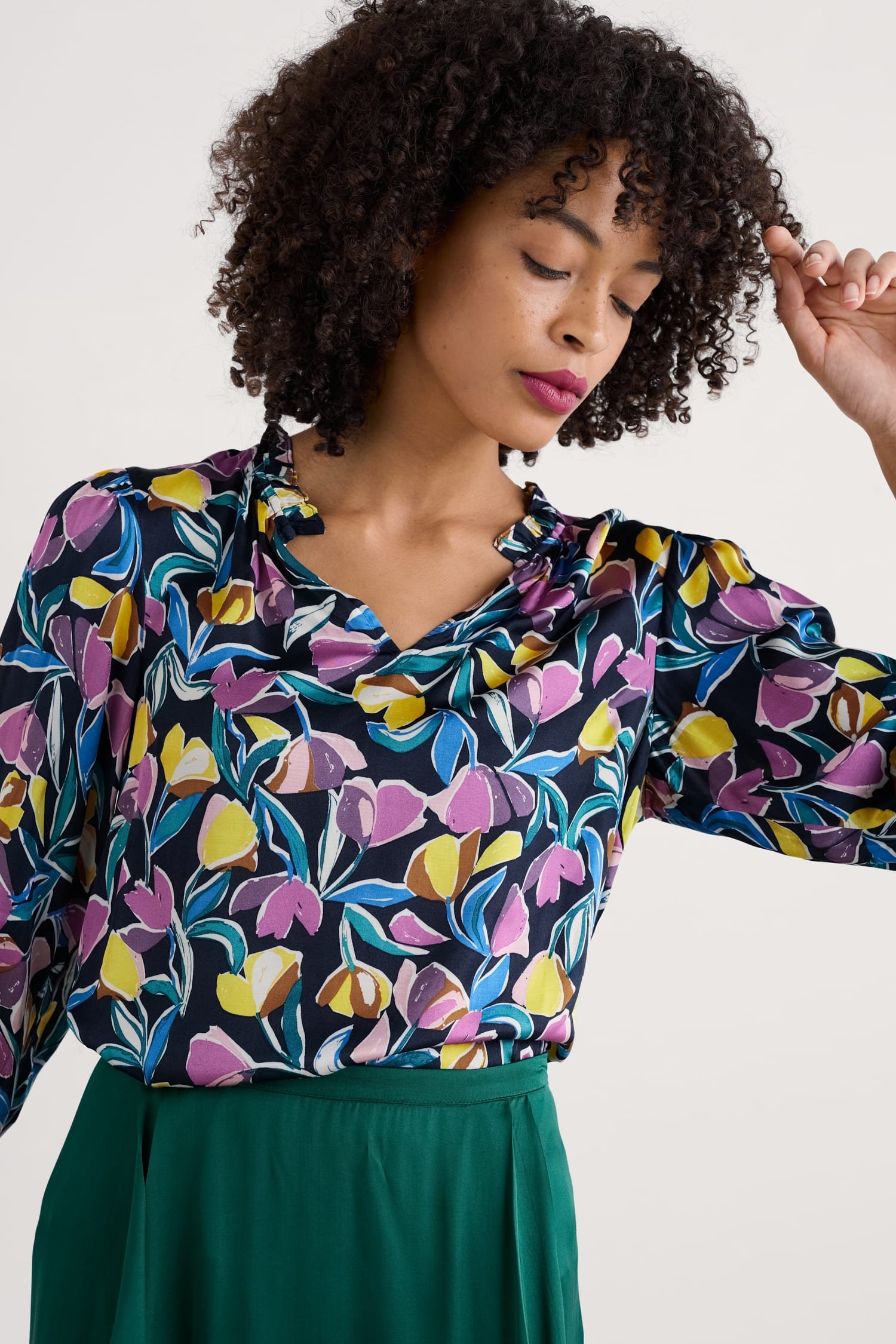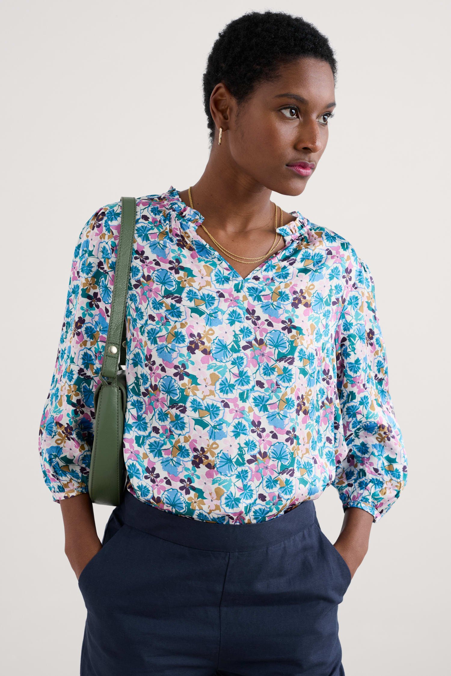 Our Flower Weave top is made from a drapey satin fabric for a soft and airy fit. The volume in the bodice is complemented by the three-quarter blouson sleeves. A frill at the neck dips into a notch neckline, creating a pretty focal point. A lovely piece in an original Seasalt print.