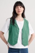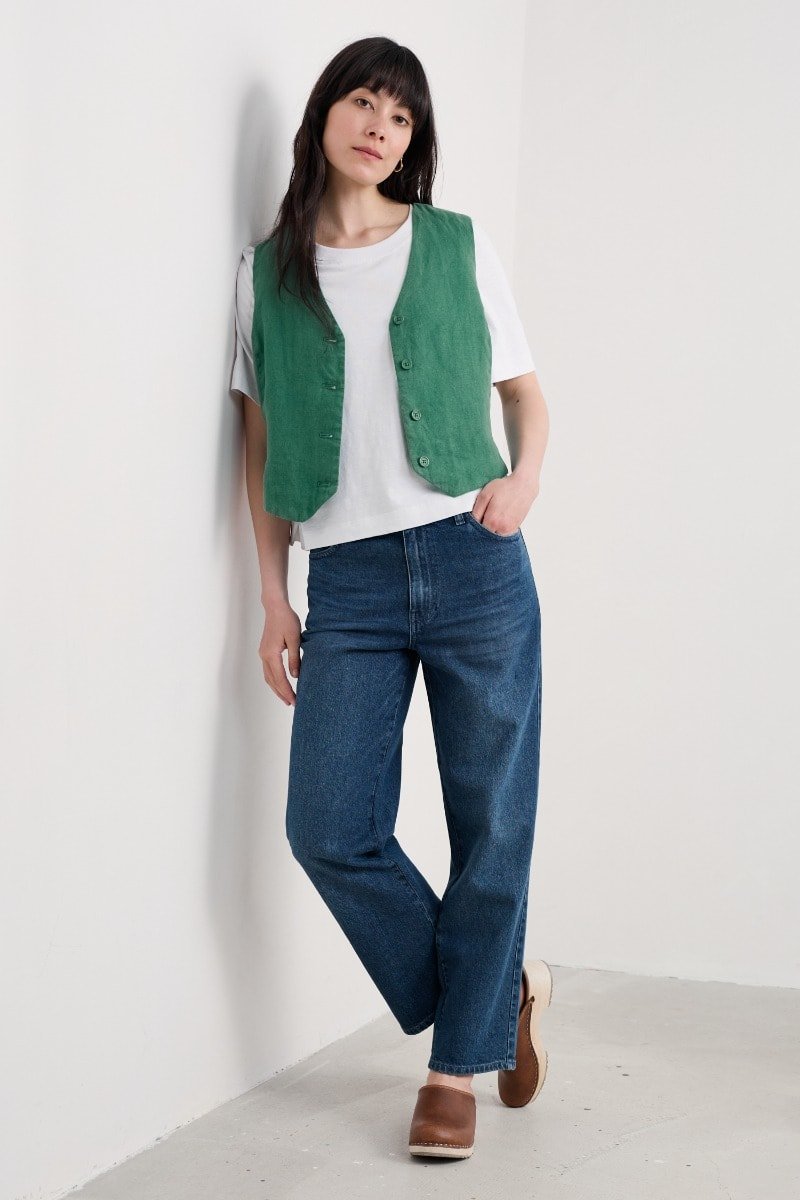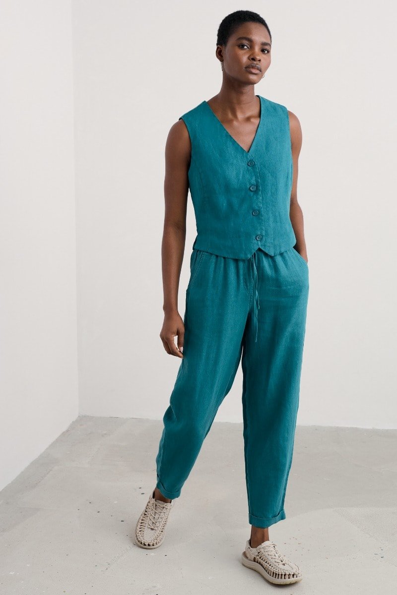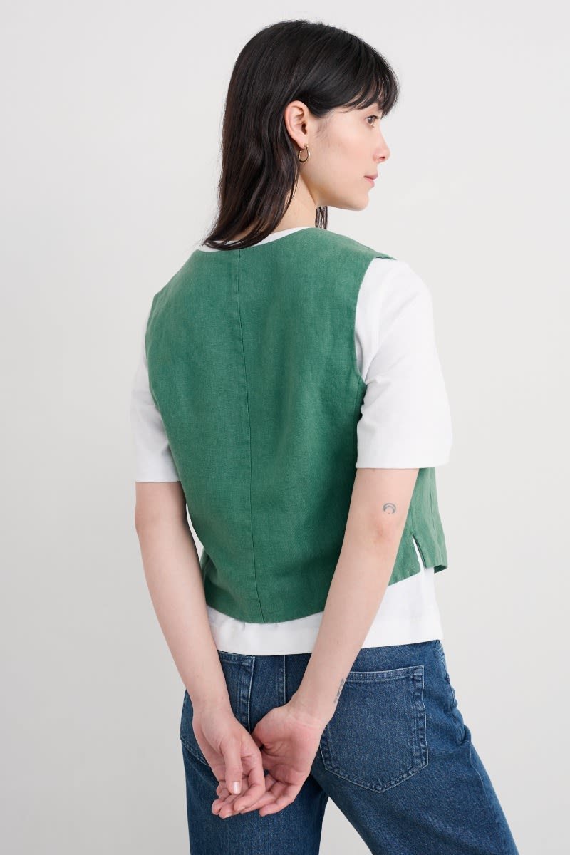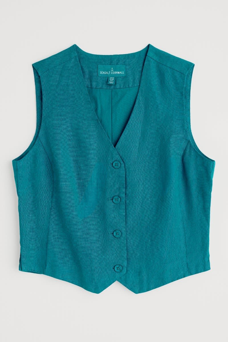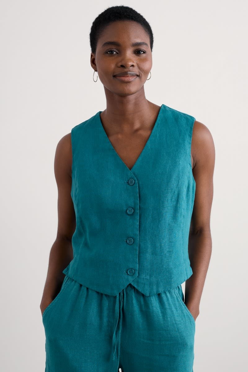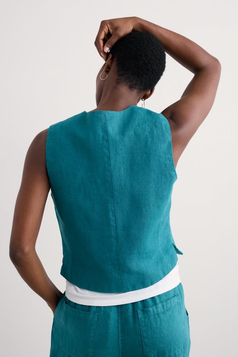 Crafted from pure linen, the Blinker Waistcoat is perfect for summer suiting or worn simply as a stylish vest. Princess seams create a flattering semi-fitted shape, with discreet side splits adding ease of movement. The four-button front, deep V-neck and pointed hem are a nod to traditional tailoring. A subtle statement piece for your seasonal wardrobe.