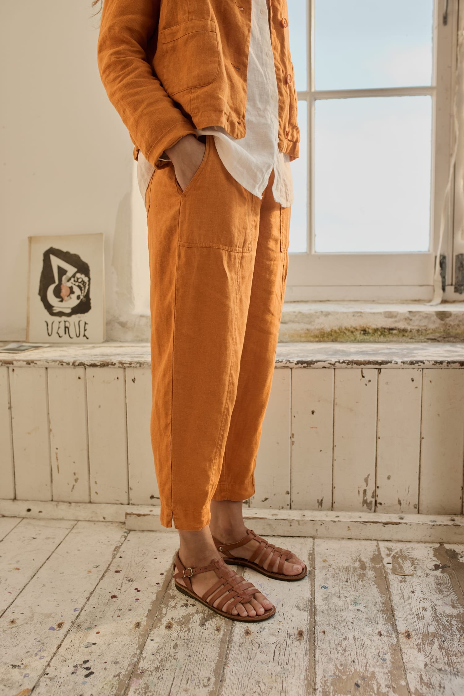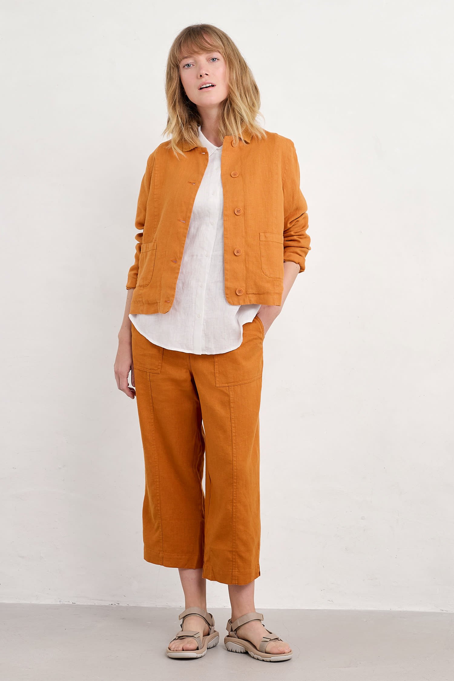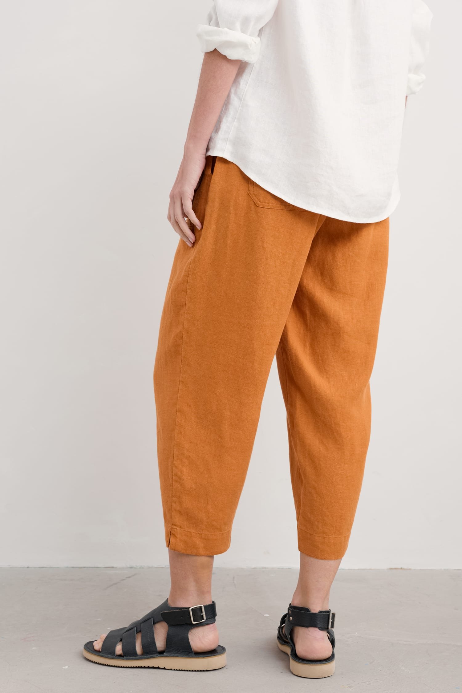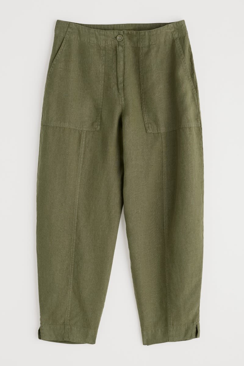Meet your new favourite crops. These straight-leg trousers are made from naturally cool and breathable linen, and have been garment-dyed for a rich colour with a lived-in look. We’ve added thoughtful details like a grown-on waistband for a smooth finish, and little side splits in the hems. There are two large utility-style pockets to the front as well as two patch pockets at the back.