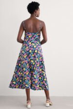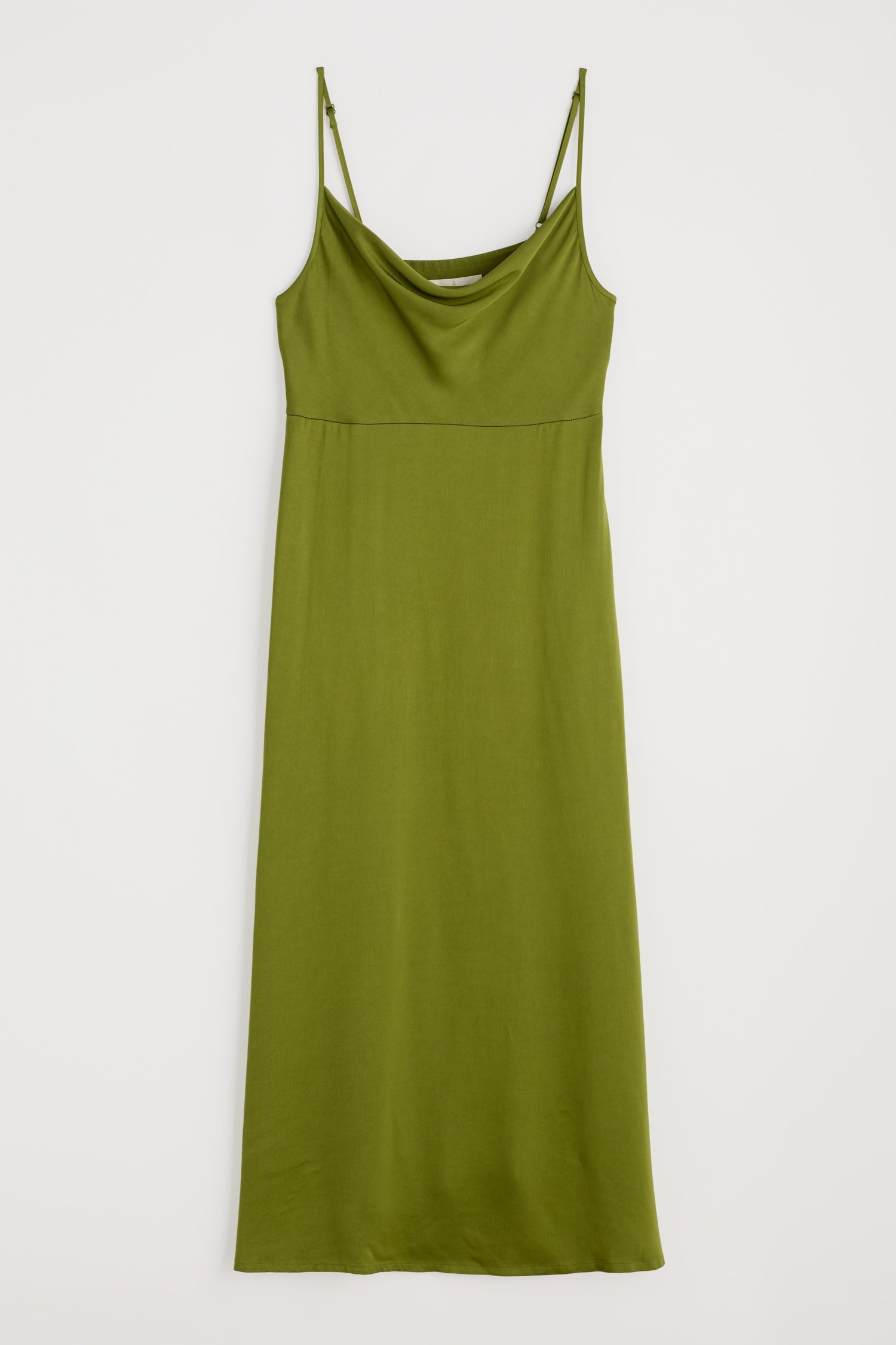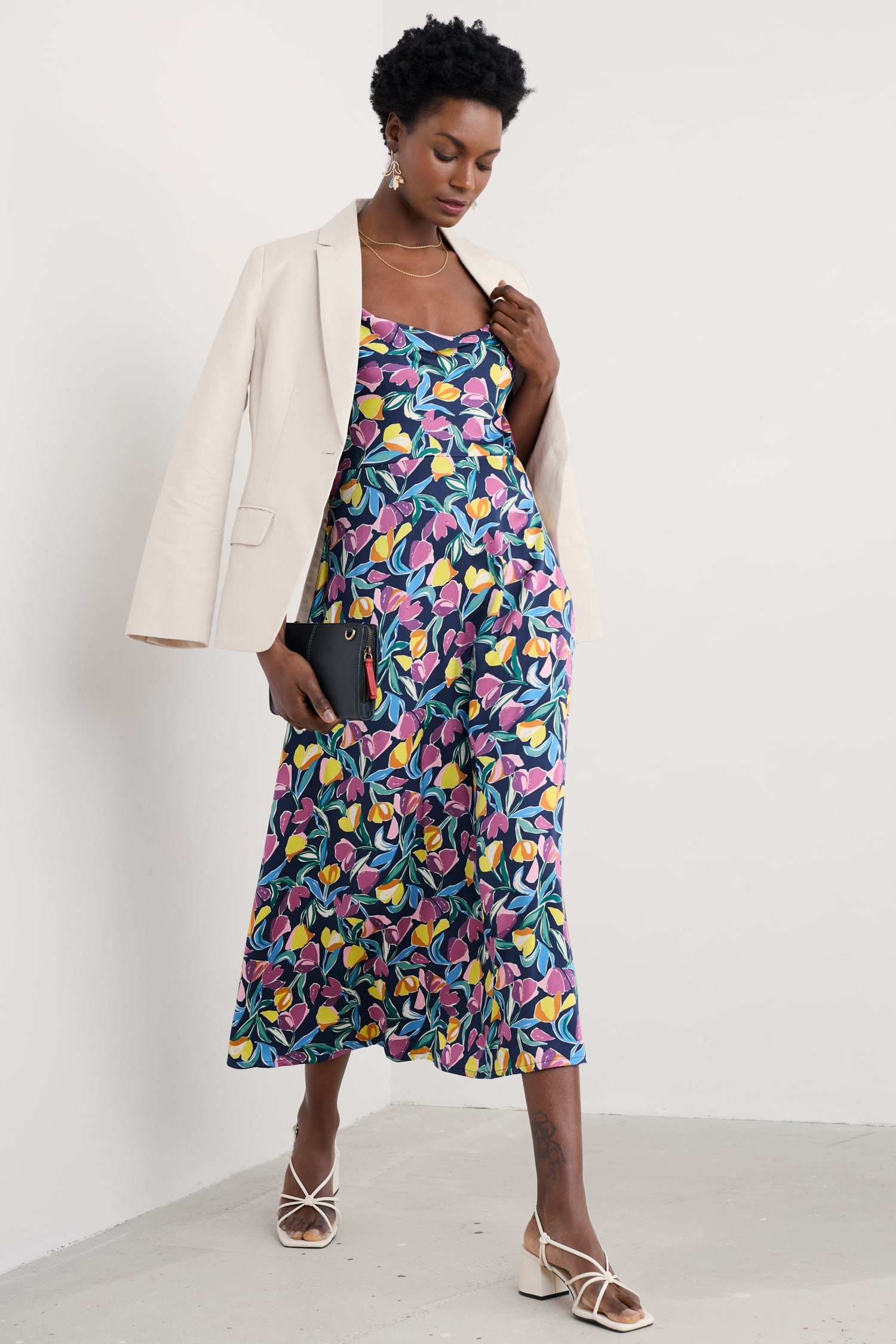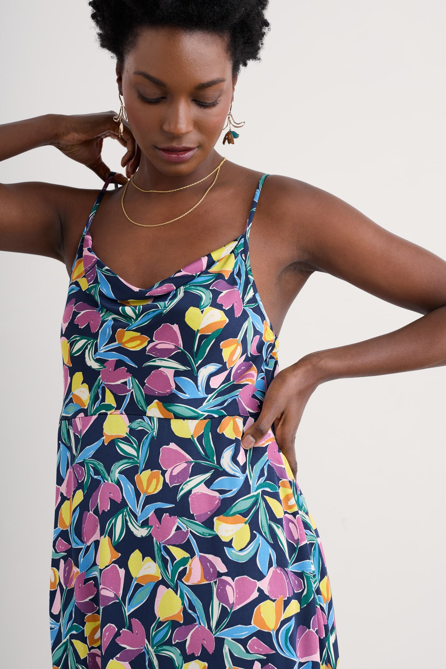 Our Housel Bay cami dress is made from drapey satin viscose, with a body-skimming slim fit and an elegant empire line cut. Its strappy bodice features bust darts for shaping, softened by the subtle cowl-shape neckline. The gently swaying skirt becomes fuller towards the midi-length hem. A beautiful piece for all kinds of summer occasions.