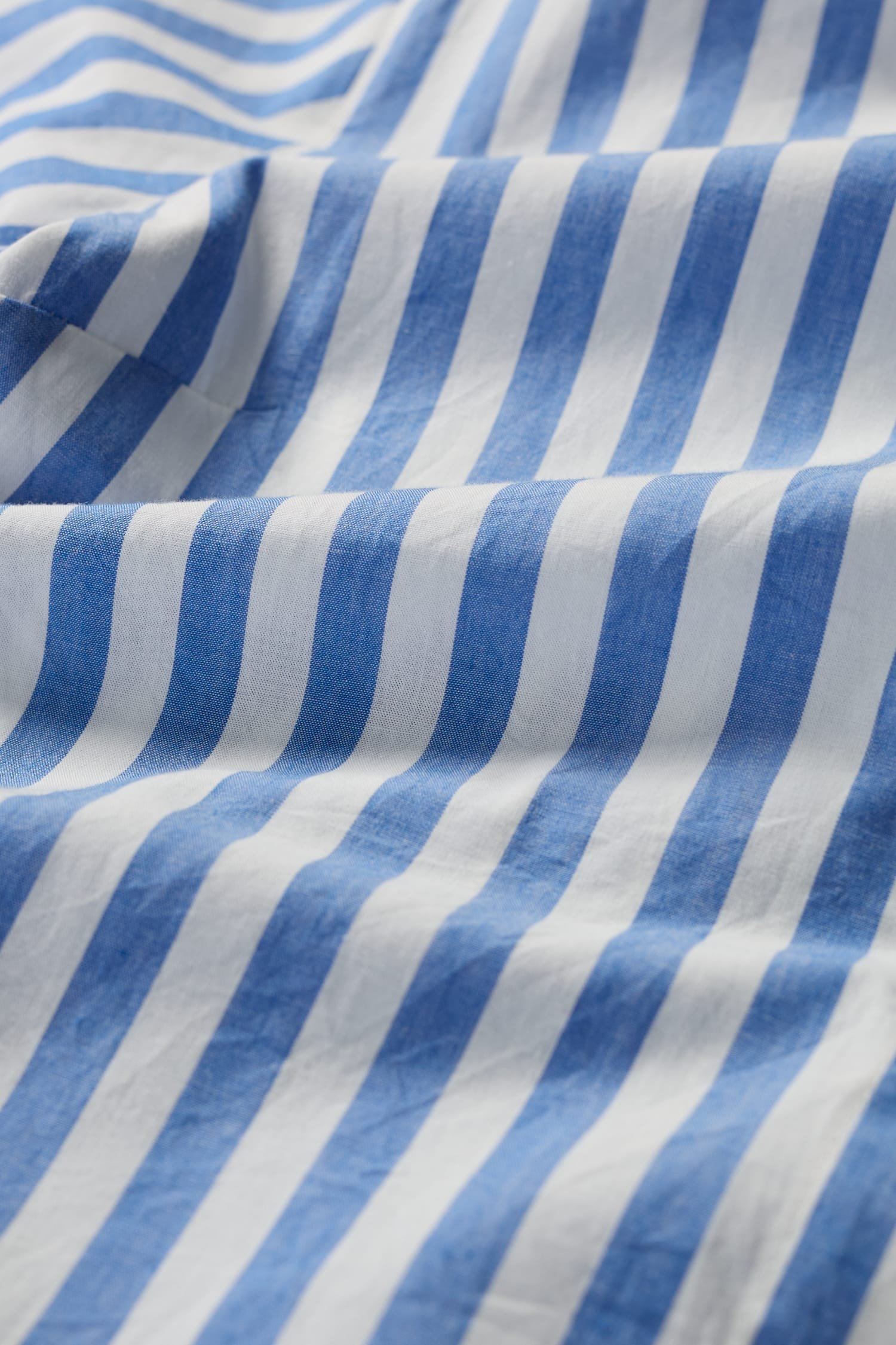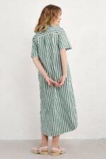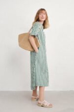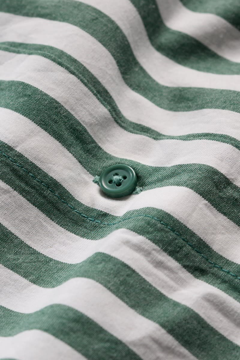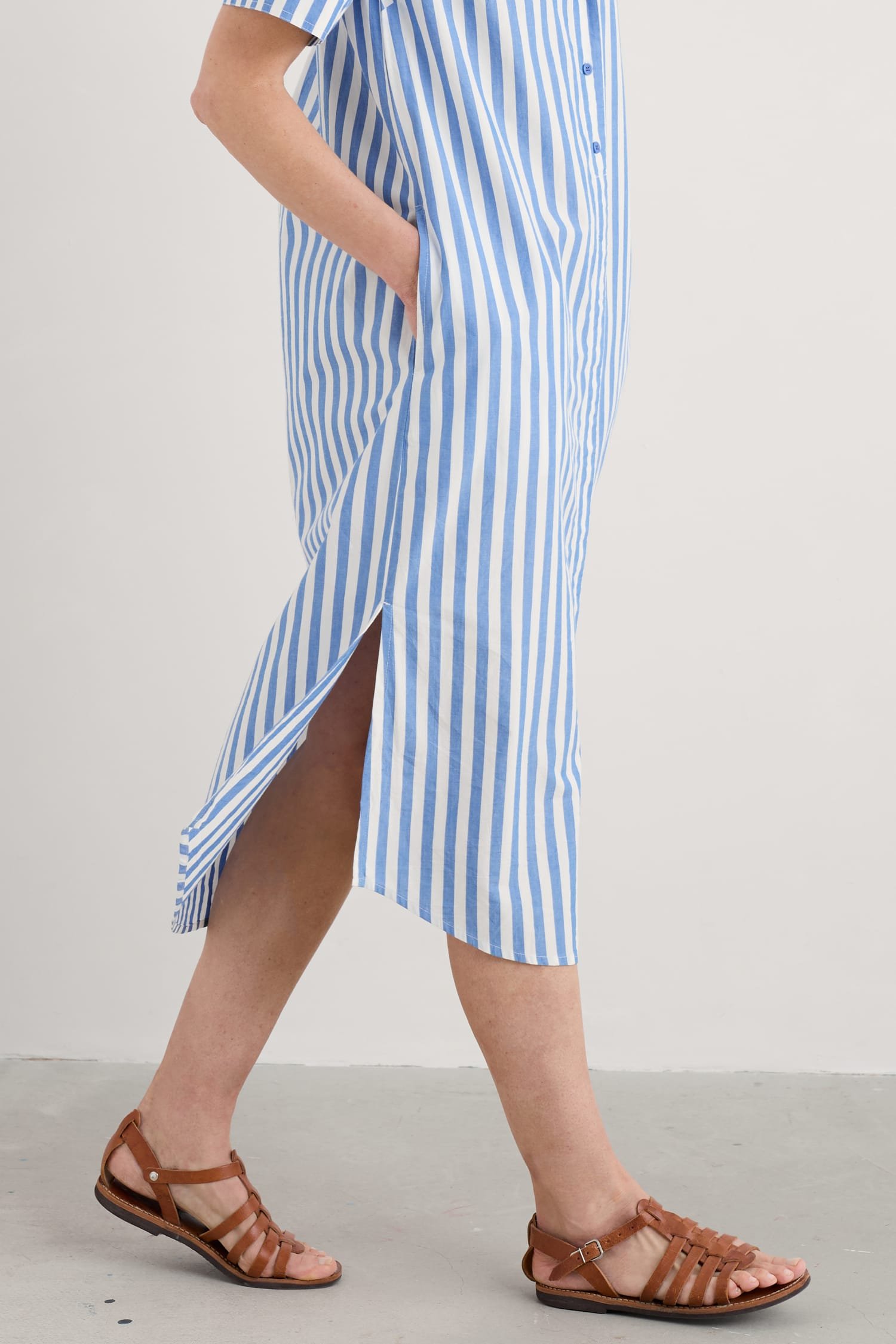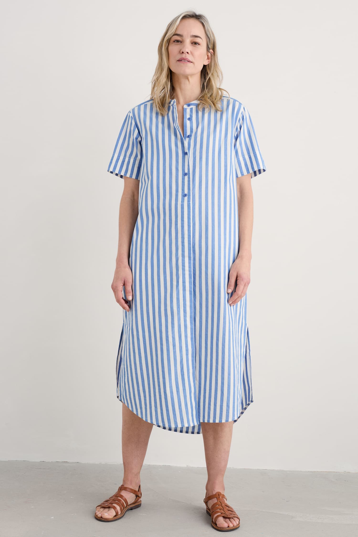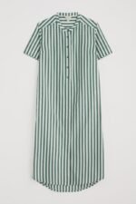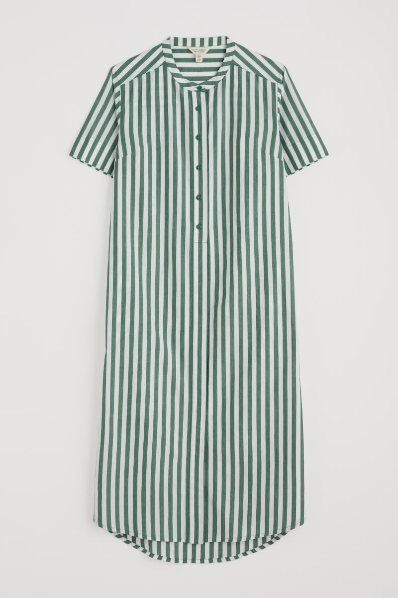 Our joyful new shirt dress is made has vibrant yarn-dyed seaside stripes. The soft organic cotton midi has a relaxed fit through the body, with a slight flare towards the curved high-low hem. The sleeves are a cool half length, and we’ve slipped in a pair of discreet side seam pockets. A grandad collar and half-button placket add classic shirting touches to this easy-wearing piece, which can also be teamed with trousers as an oversized top.