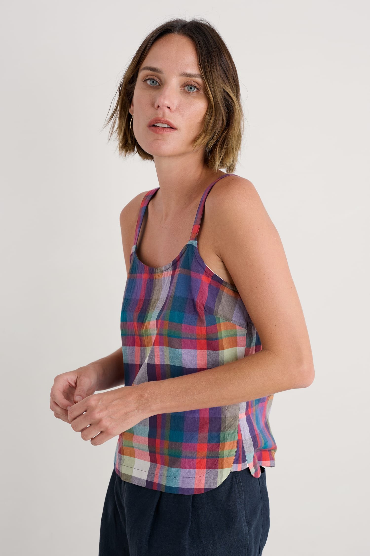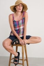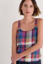 Vibrant yarn-dyed hues bring bold checks to life in our Hare’s Tail Vest. The organic cotton top has a lovely relaxed fit, with darts at the bust for a touch of shaping. Its wide straps create a gently scooped neckline, complementing the curved hem. A piece that’s sure to become a summer wardrobe favourite.