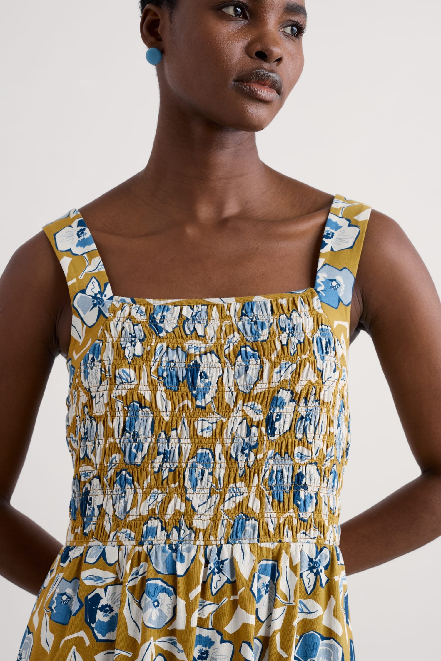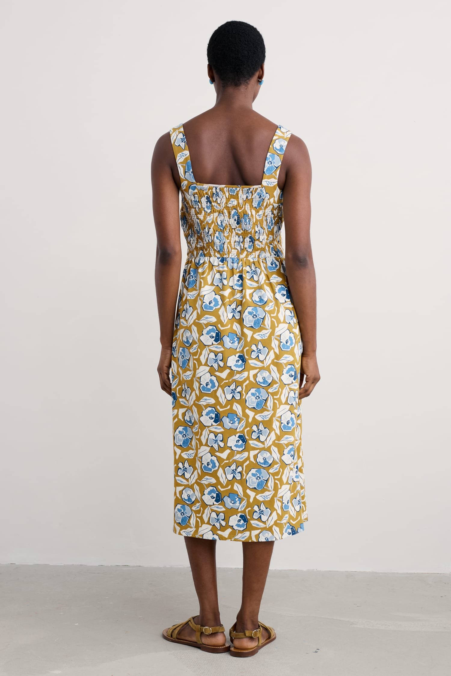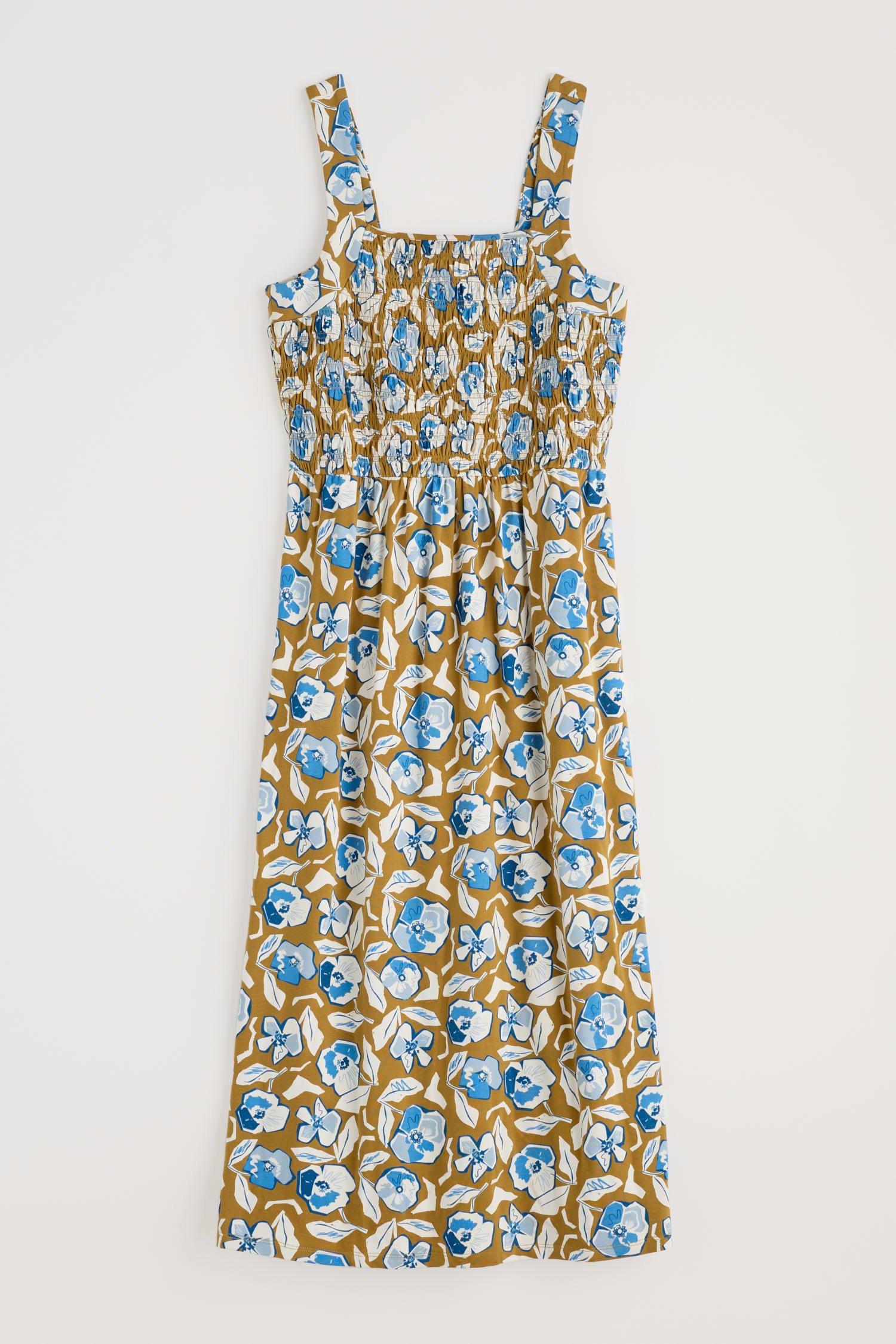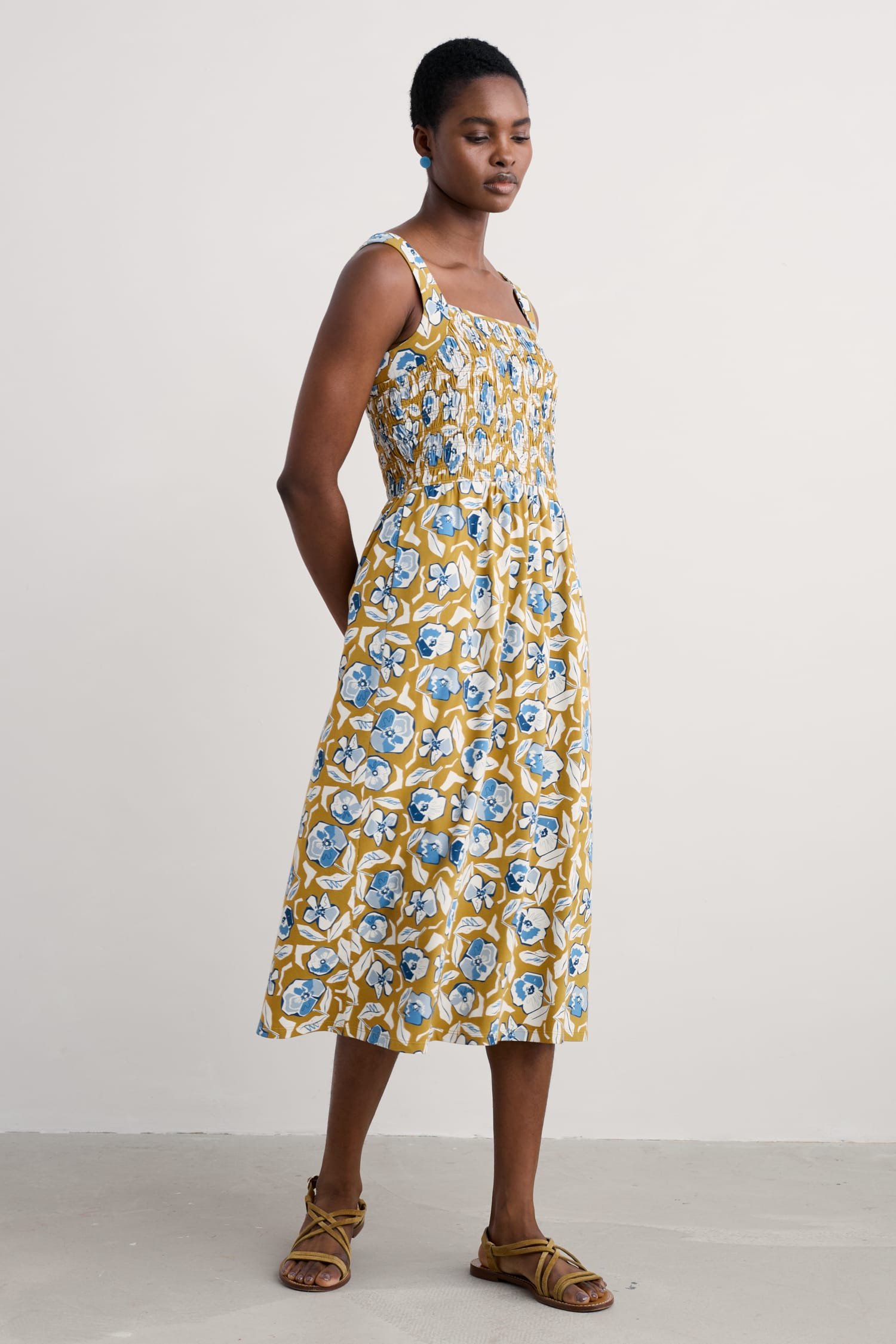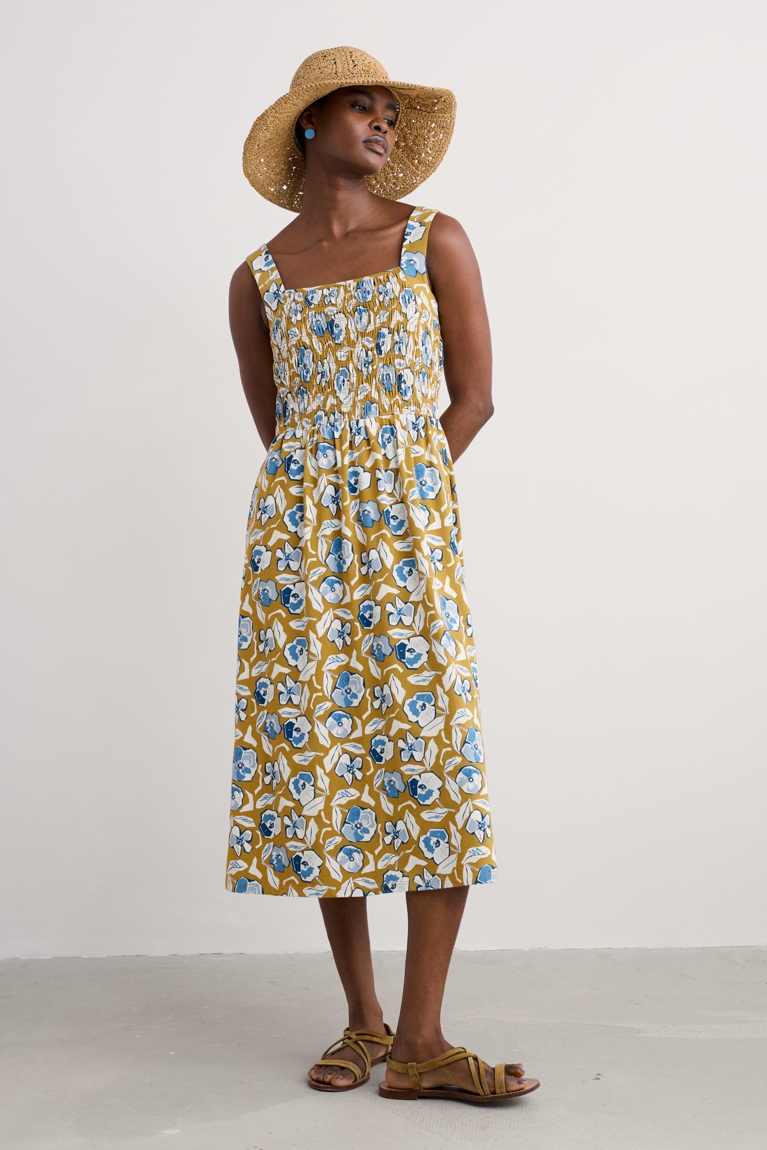 An easy-wearing midi sundress for summer days, made from soft organic cotton jersey. The bodice has vintage-style shirring all the way round for a flattering waisted shape. Wide straps give you a touch of support while creating a square neckline front and back. A pair of in-seam pockets adds the finishing touch.