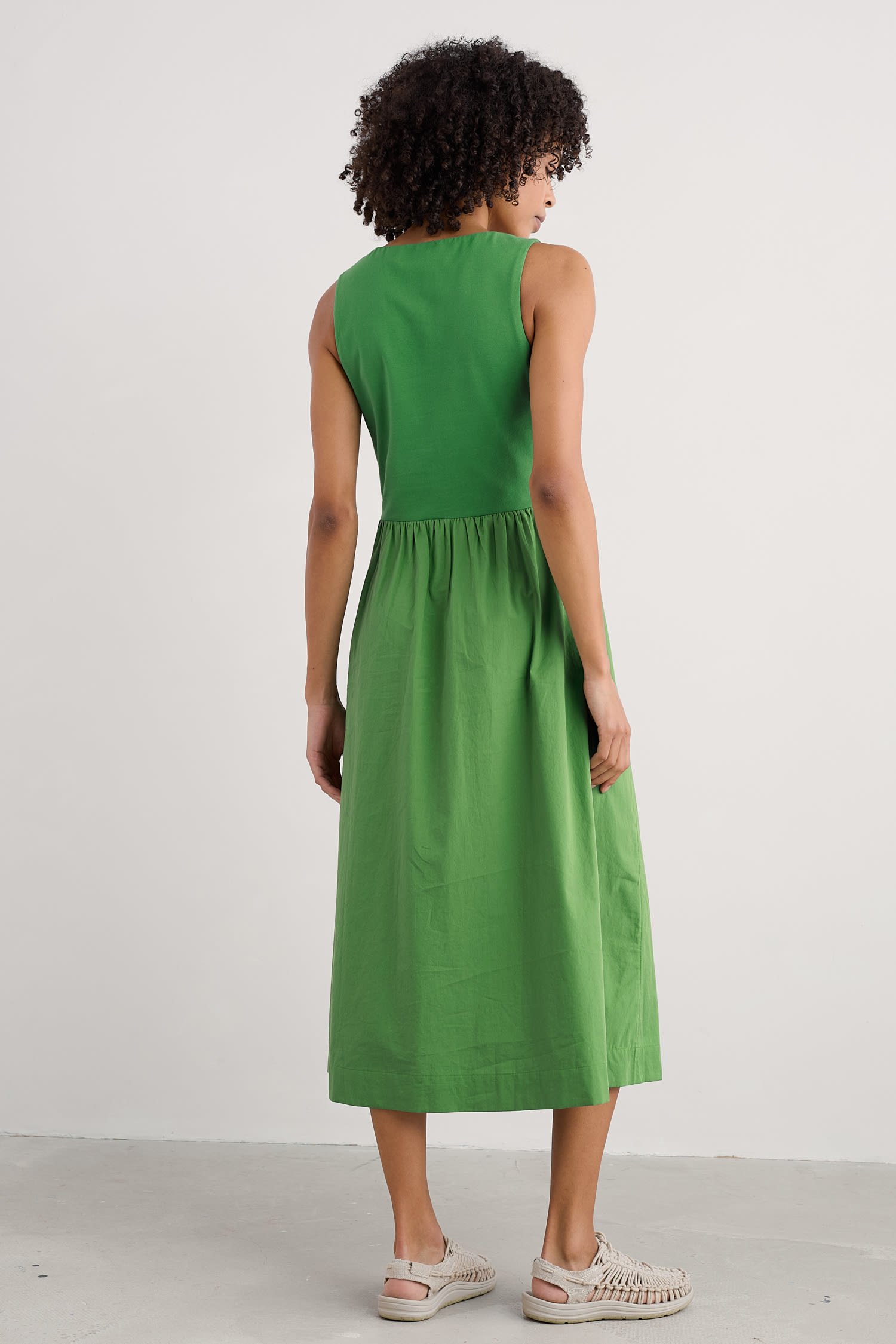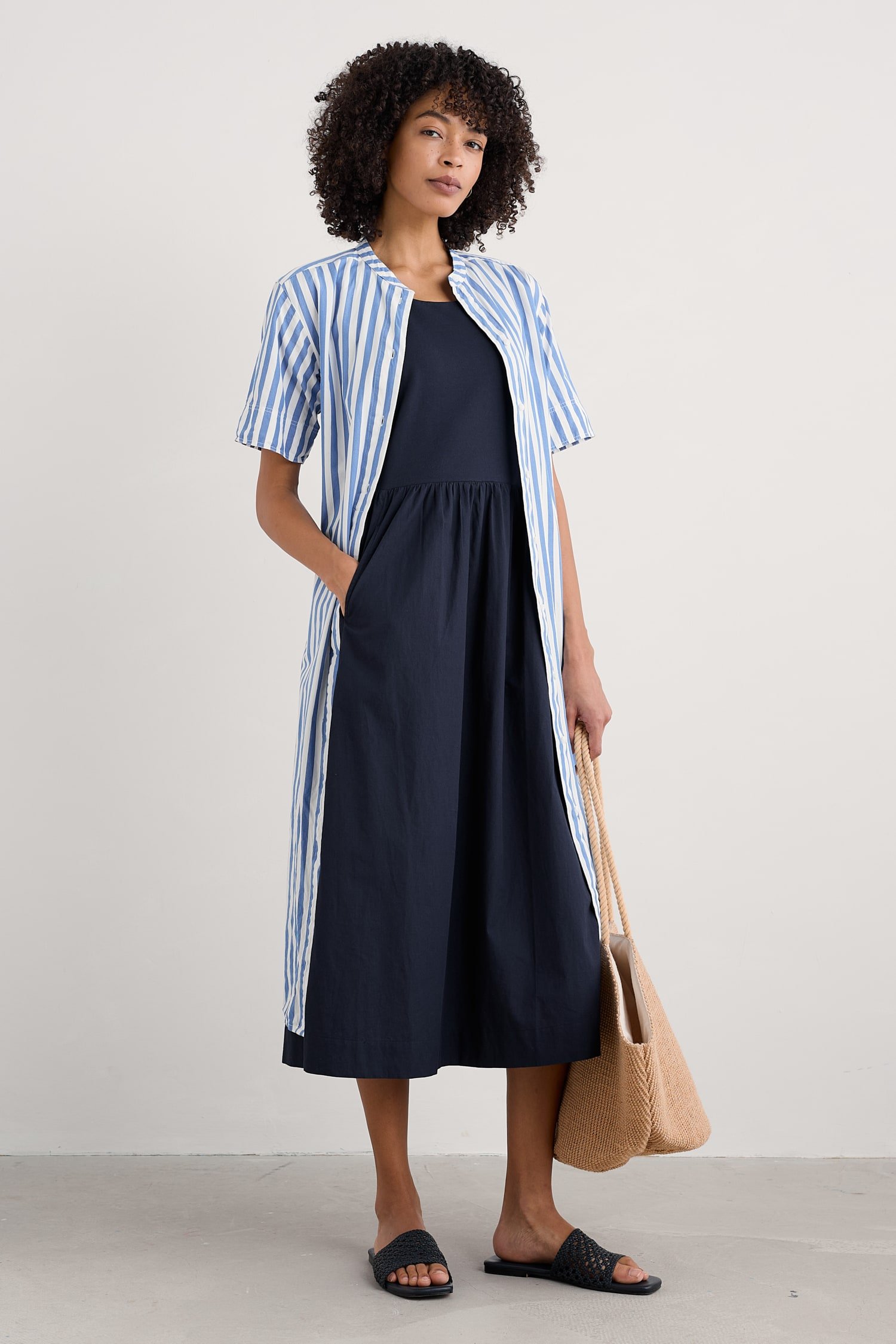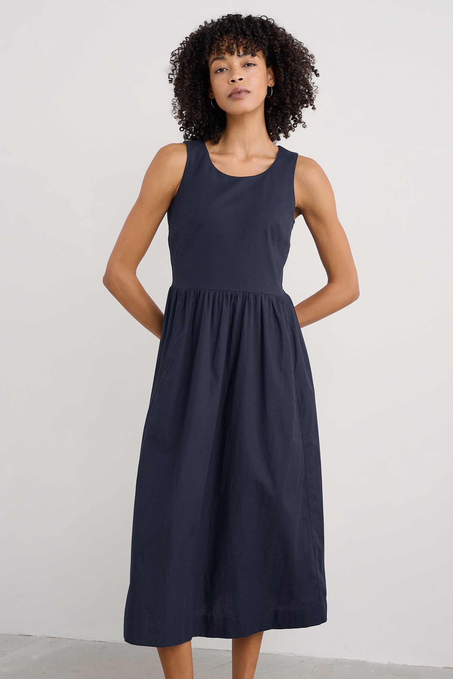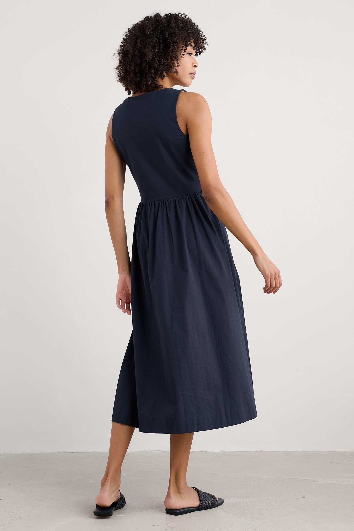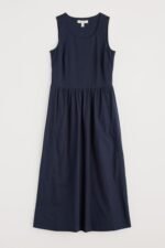 This summer’s go-anywhere piece. The Madder dress has a sleeveless bodice made from comfortable cotton-rich jersey, with bust darts for shaping and a deep scoop neckline. It opens out at the waist into an above-ankle-length woven skirt, with forward seams for a flattering shape. A pair of side pockets adds the finishing touch. A summery update of our much-loved half-sleeve Madder Dress.