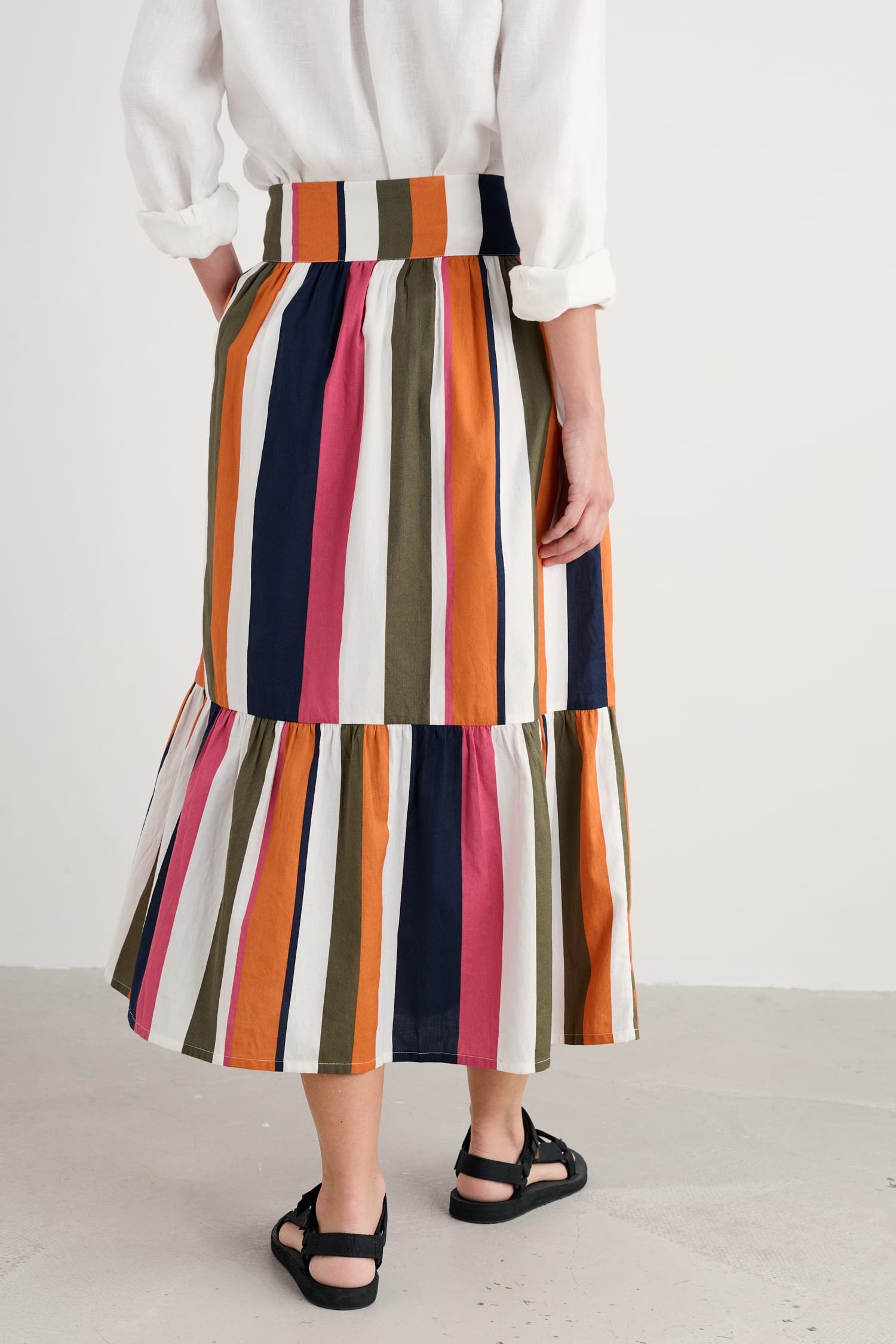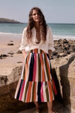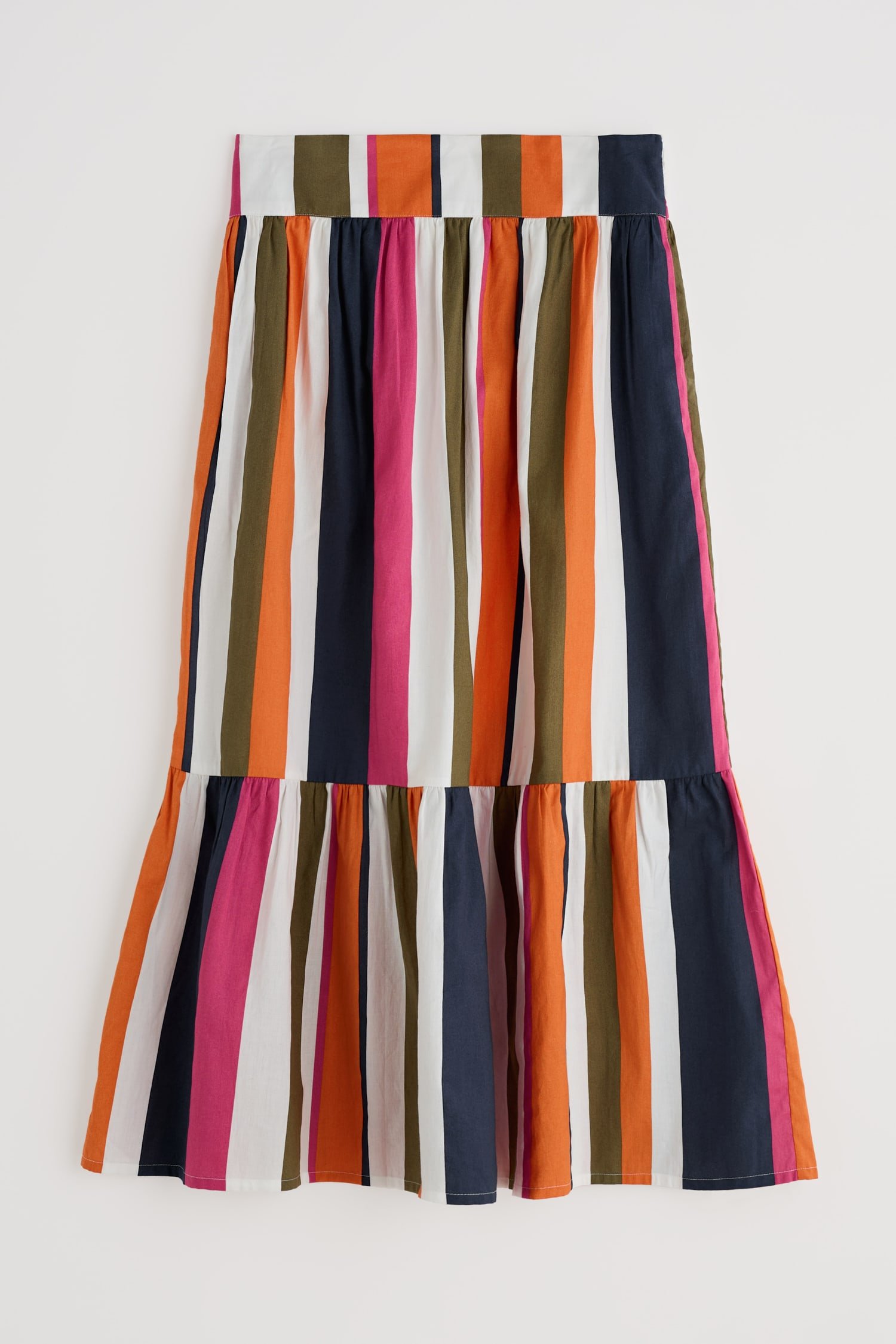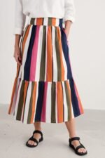 A full, swirly skirt that’s a joy to wear on a sunny day. It’s made from organic cotton, with light voile lining for cool comfort. Gathers from the waistband add volume to the skirt, which finishes in a deep-frilled hem. The cheerful striped print changes direction, emphasising the pretty, tiered shape. In-seam pockets add the perfect finishing touch.