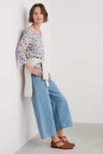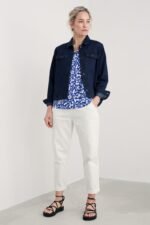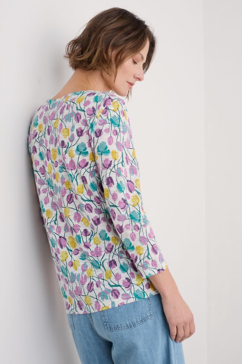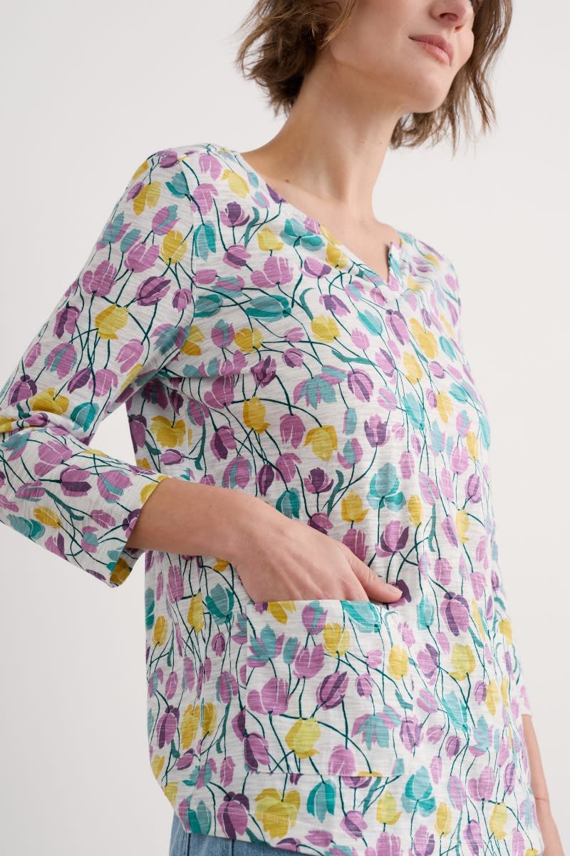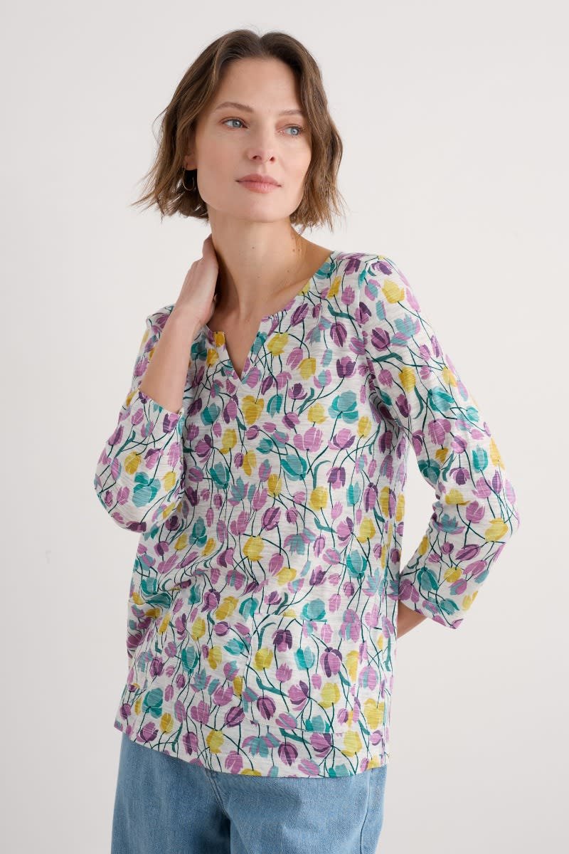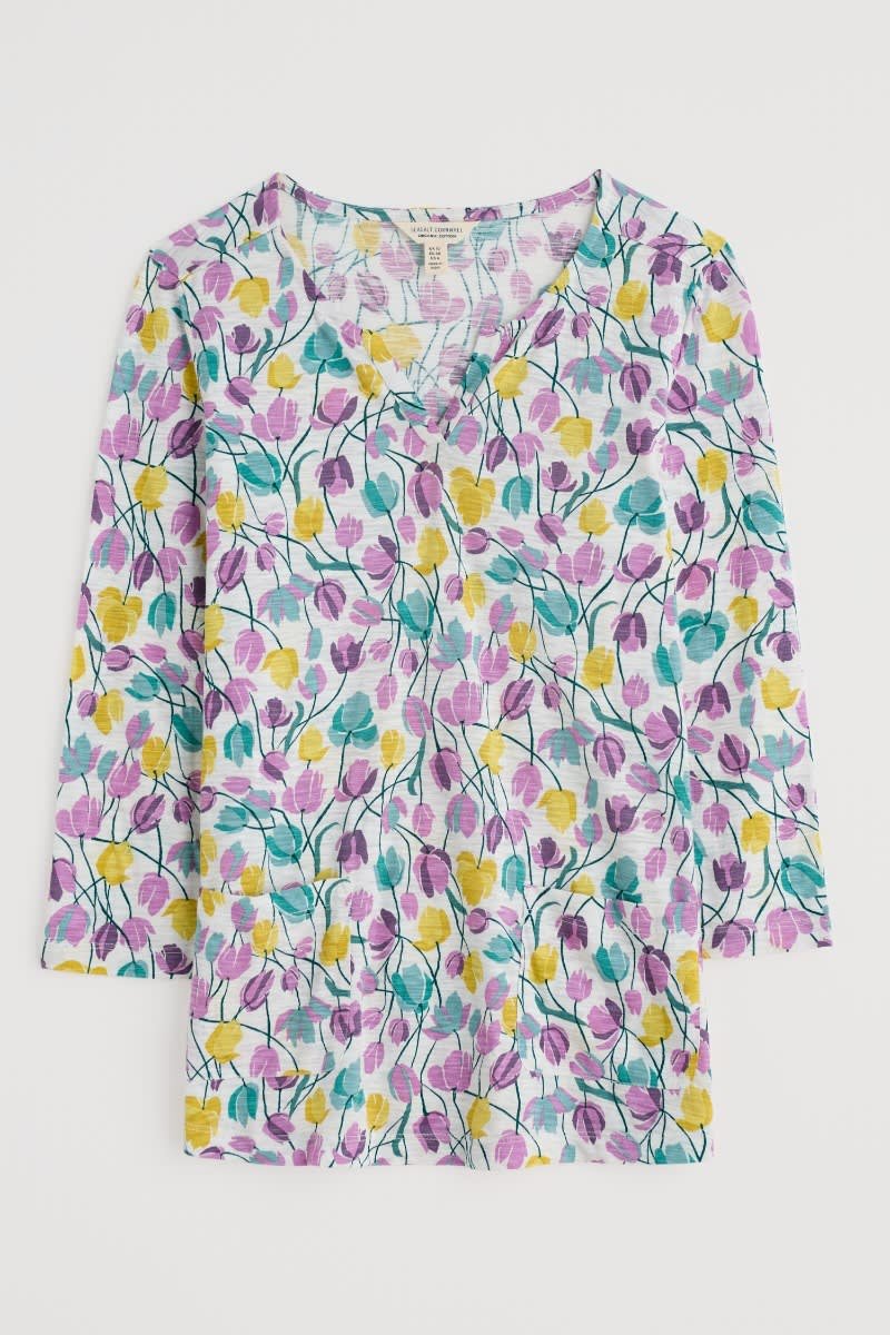 Our Gypsophilia Top is made from soft organic cotton jersey in a unique Seasalt print. It is designed for a relaxed fit and styled with 3/4 sleeves, a scoop neck with a notch detail and two front patch pockets. With organic cotton certified according to Global Organic Textile Standards by Soil Association. License Number: DK17684