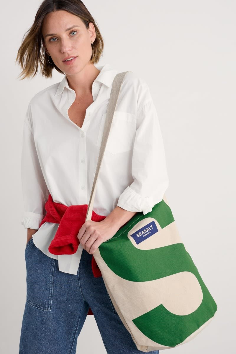 Our new Seasalt canvas tote bag features a bold capital S in a vibrant green colour. It’s made from unlined 12oz woven organic cotton, with a padded webbed cotton carry handle and shoulder strap. The main compartment fastens with a magnetic closure, and inside, there’s a useful slip pocket to hold smaller items.